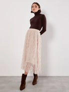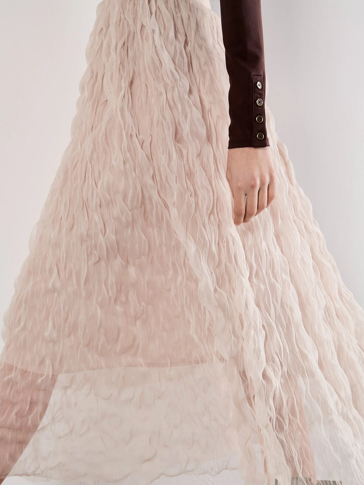 Elevate your wardrobe with the Wavy Tulle Midi Skirt, featuring a delicate wavy texture that adds graceful movement and dimension. Crafted from lightweight tulle, this skirt offers an elegant silhouette perfect for refined occasions. Its midi length strikes a balance between classic and contemporary, making it a versatile addition to your sophisticated ensemble.