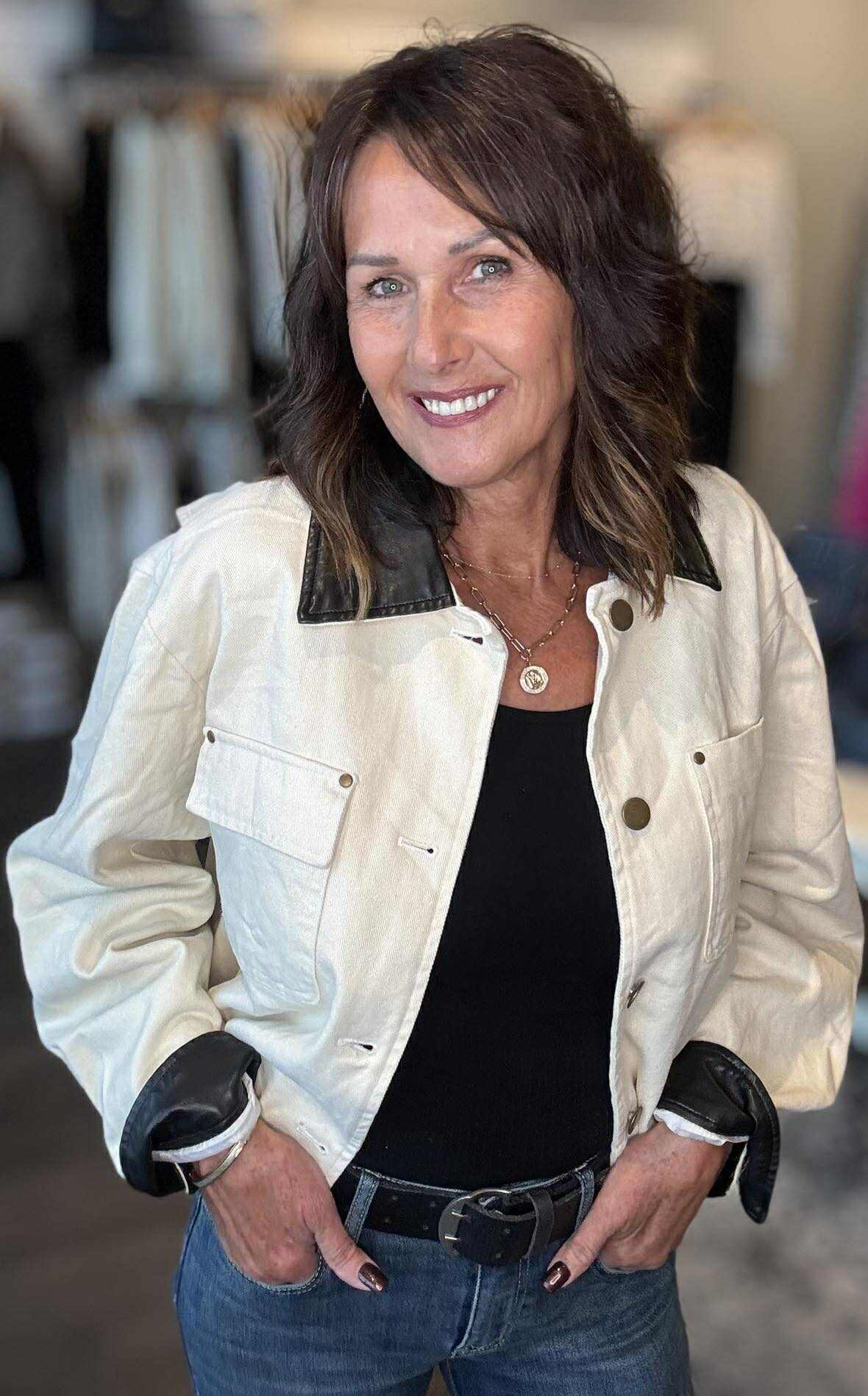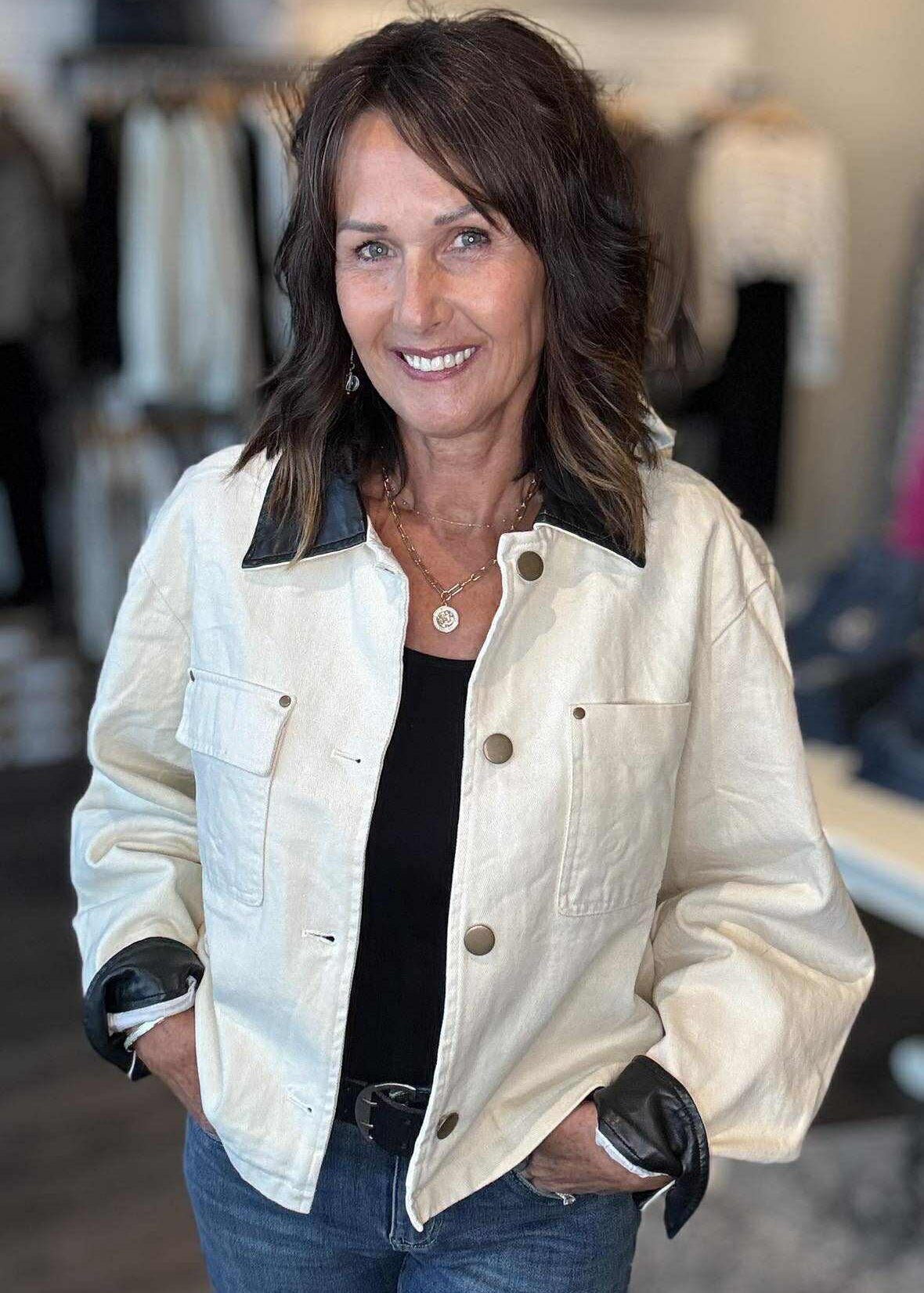 This stone-colored jacket with leather trim offers a refined and versatile look perfect for layering. The leather accents enhance durability and add stylish detail, making it an ideal choice for both casual and dressier occasions. Designed for comfort and lasting wear, this jacket effortlessly complements your wardrobe with timeless appeal.