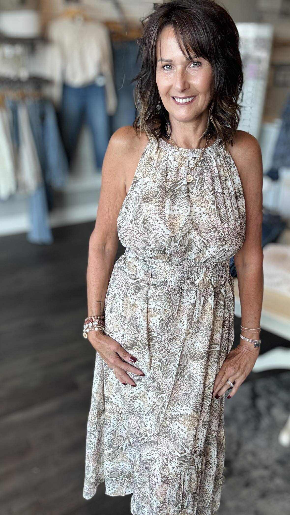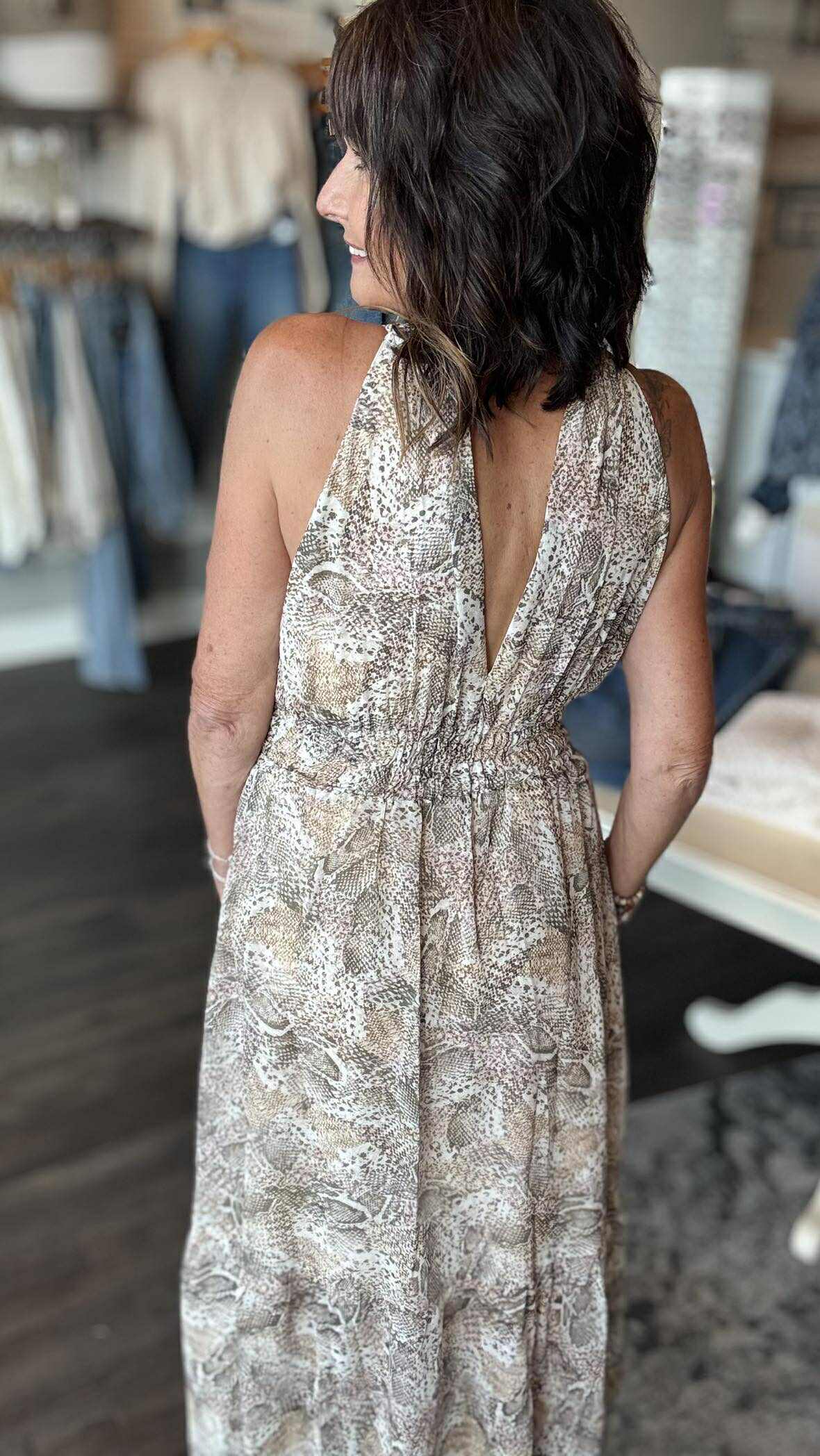 Turn heads with this sleeveless halter maxi dress in a bold natural snake skin print. Its flowing silhouette and daring pattern make it perfect for confident, fashion-forward moments. Embrace your wild side while staying effortlessly elegant.