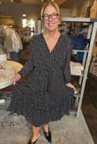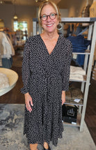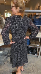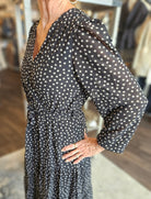 Elevate your style with this black Polka Dot Chiffon Wrap Dress, designed to blend elegance with effortless charm. The lightweight chiffon fabric drapes beautifully, while the classic wrap silhouette flatters your figure with a refined touch. Perfect for sophisticated occasions, this dress offers timeless appeal with its delicate polka dot pattern and graceful movement.