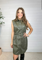 Turn heads with this Sleeveless Elastic Waist Dress in Pine. Its bold silhouette and cinched waist create a striking, confident look that moves with you. Perfect for making a statement, this dress combines comfort and edge in one daring design.