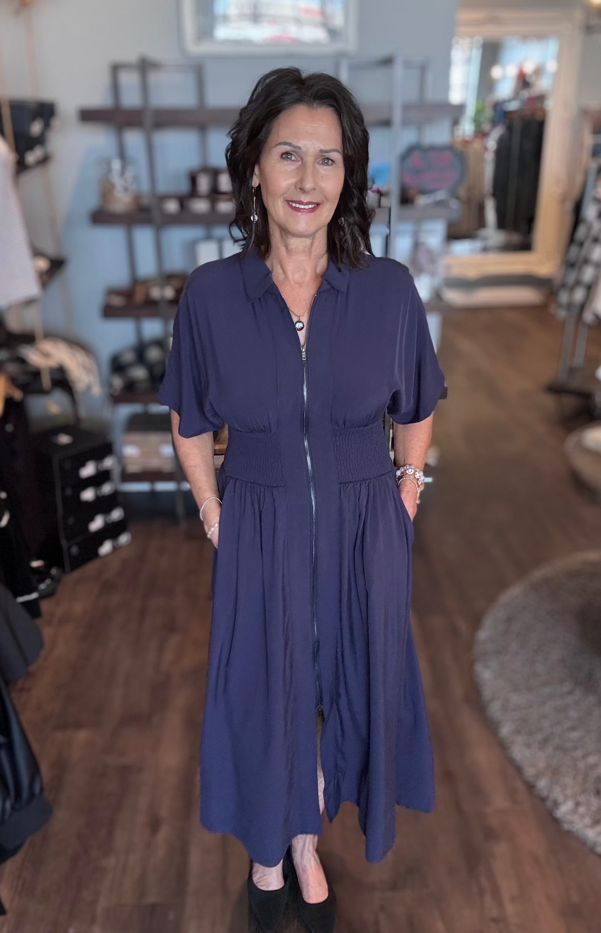 # Smock Waist Midi Dress Slip into effortless elegance with this navy midi dress, where comfort meets style. The smocked waist creates a flattering silhouette while allowing plenty of room to move, making it perfect for everything from casual outings to weekend adventures. The midi length hits just right for a polished, versatile look that works year-round. Whether you're dressing it up with heels or keeping it cool with sneakers, this wardrobe staple delivers all-day wearability with a touch of timeless charm.