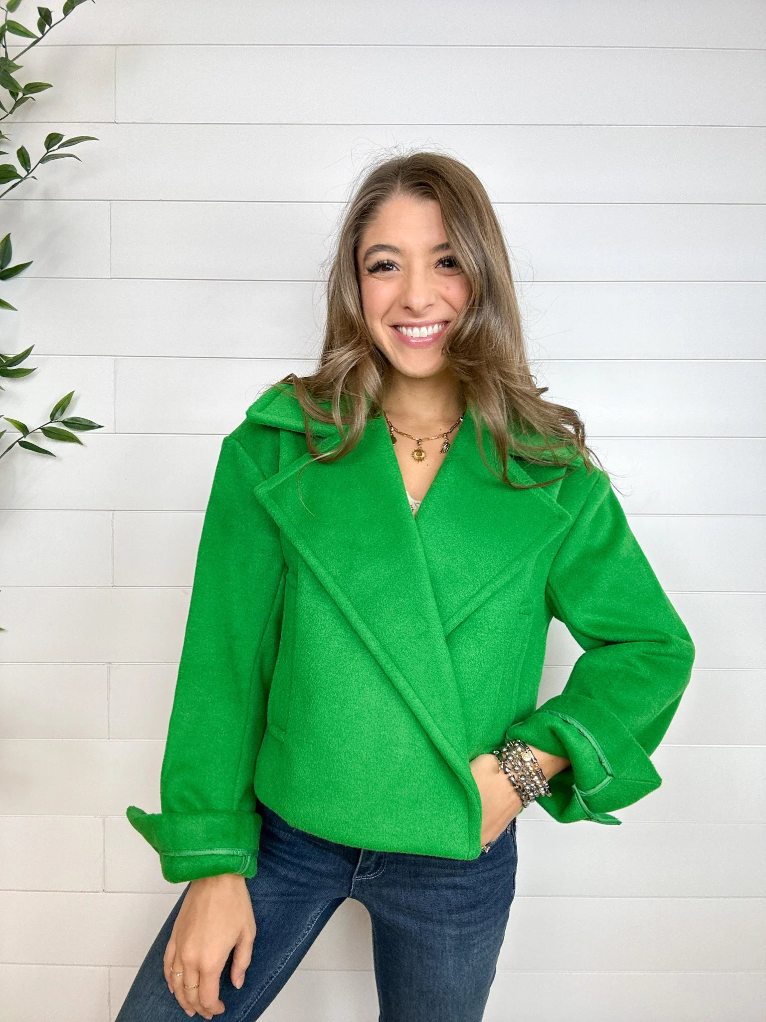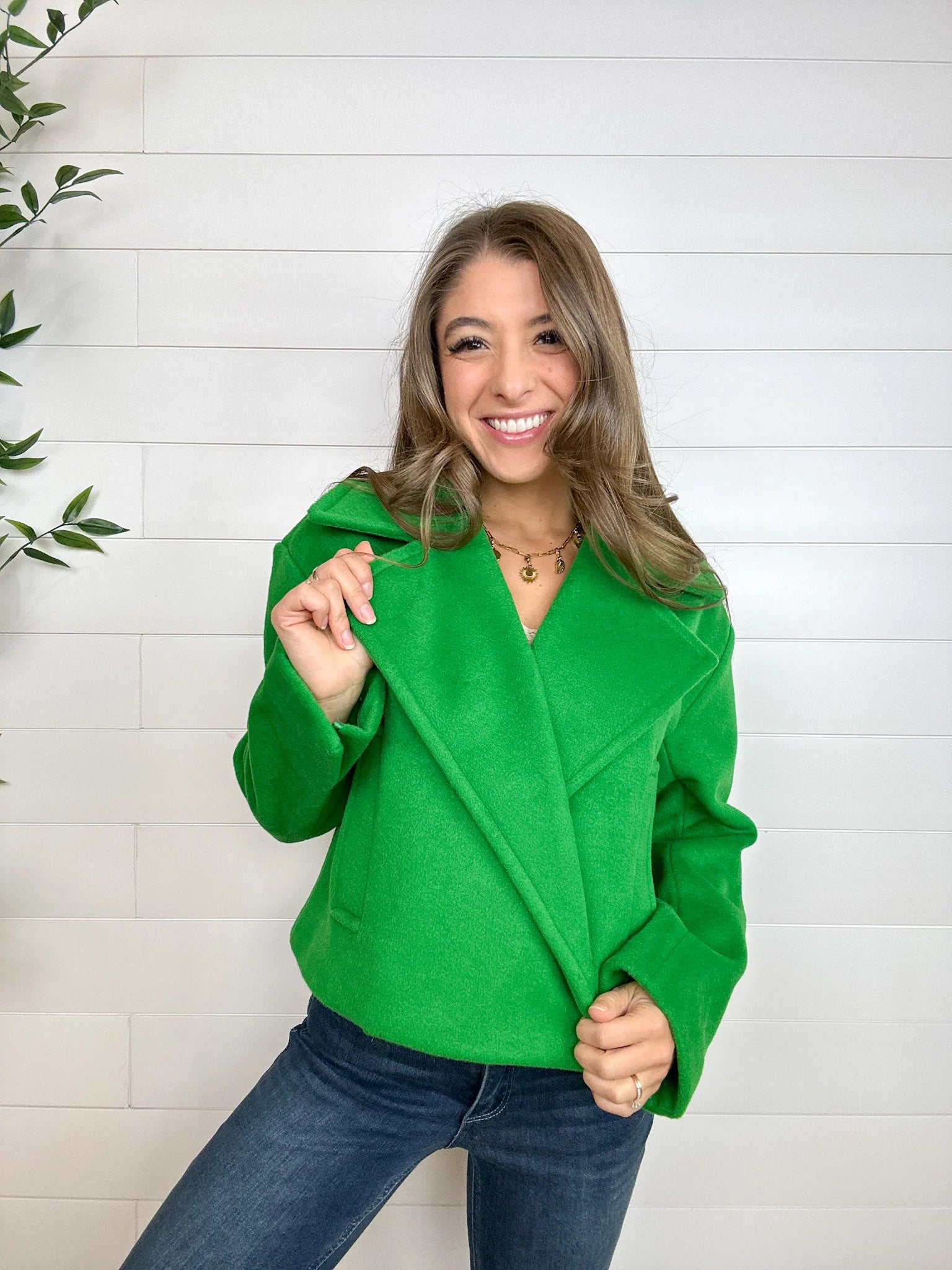 Add a pop of fun to your wardrobe with the Harper Collar Jacket in a vibrant bright green. Its playful notch collar design brings a fresh twist to classic outerwear, making every outfit instantly more lively. Perfect for those who love to stand out and bring energy wherever they go!