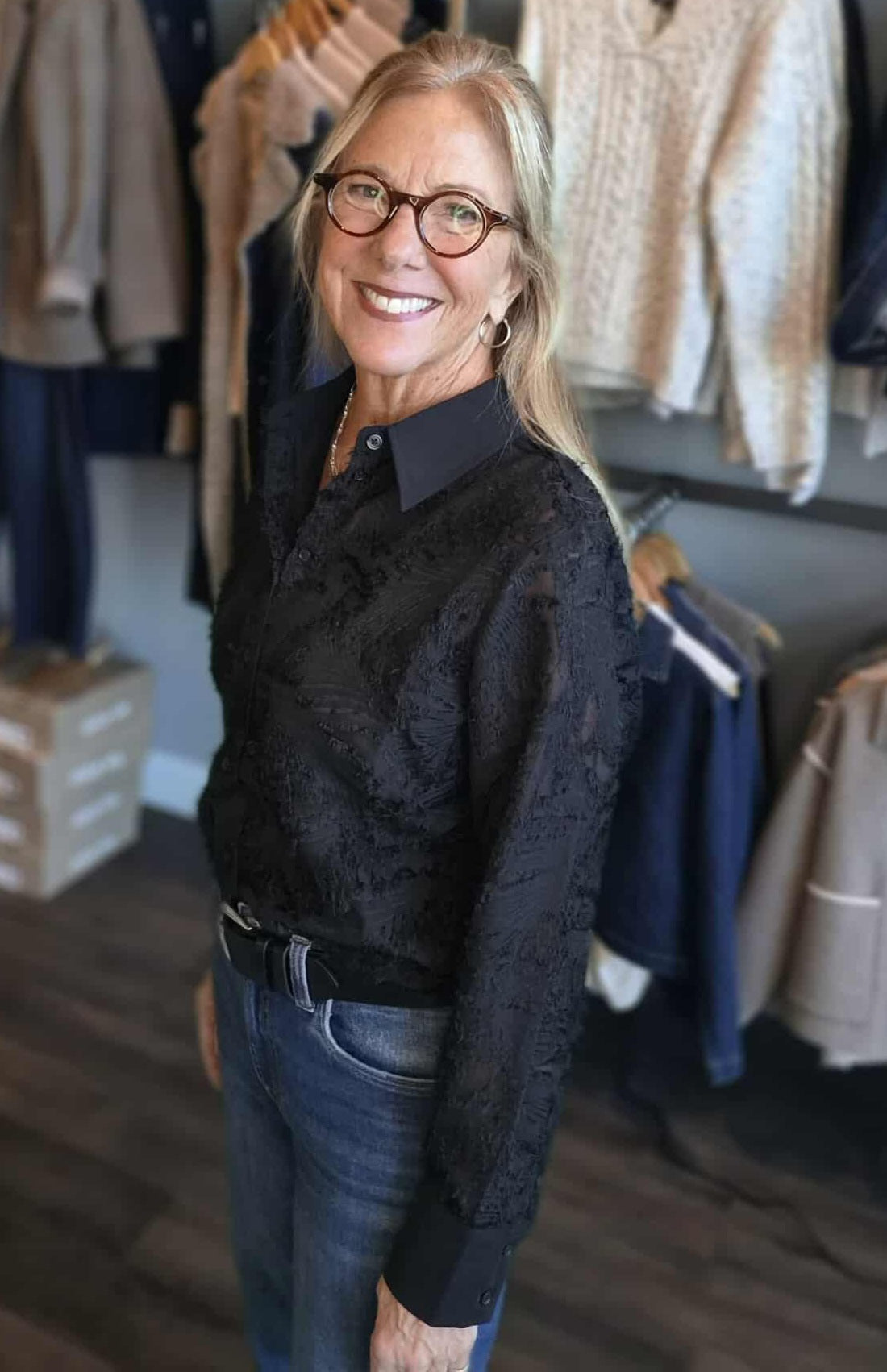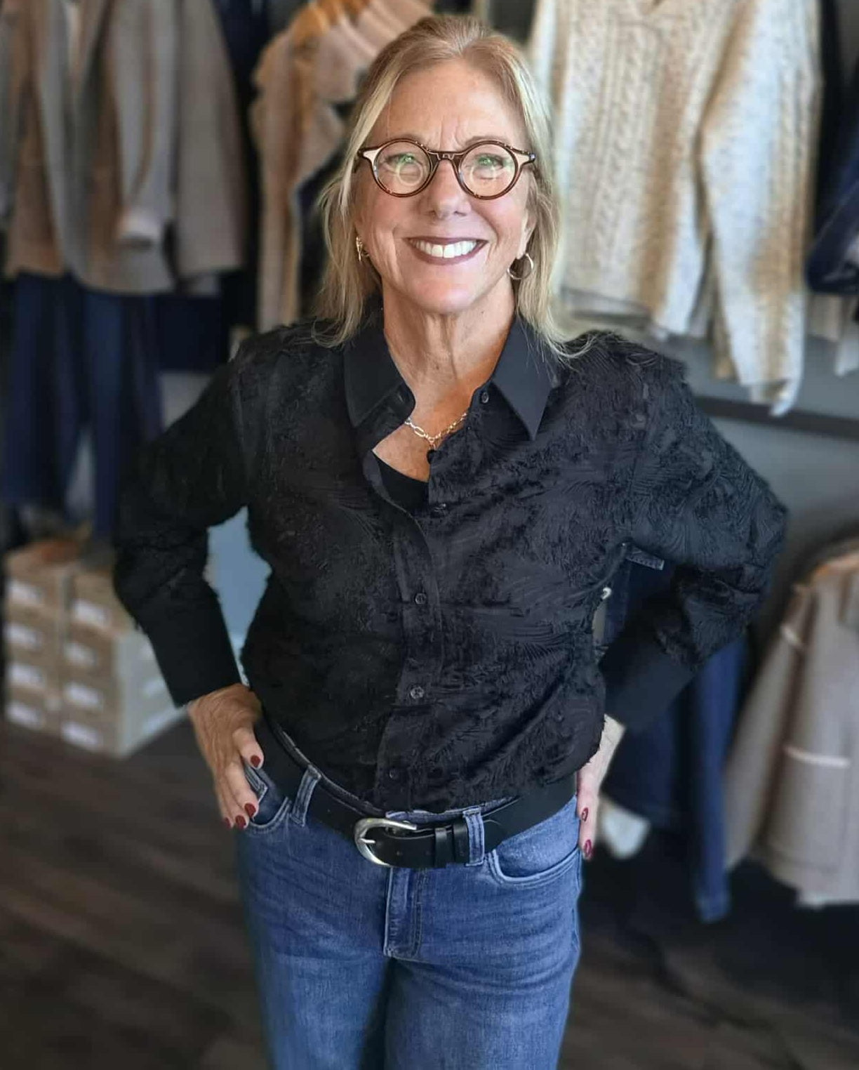 This semi-sheer chiffon button-down shirt in classic black adds a flirty twist to your wardrobe. Light and breezy, it layers effortlessly while letting just a peek of your style shine through. Perfect for days when you want to keep it cool, casual, and a little mysterious.