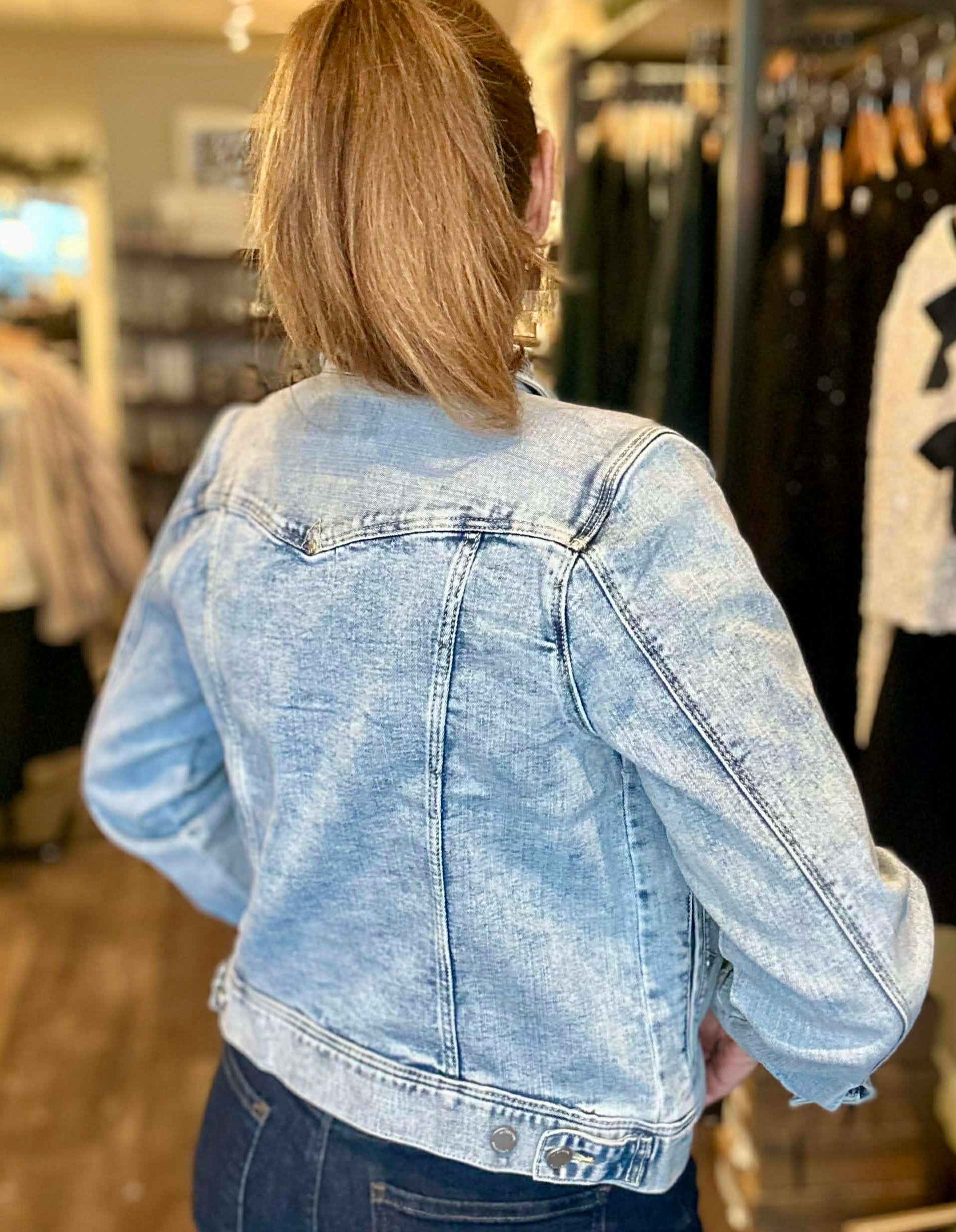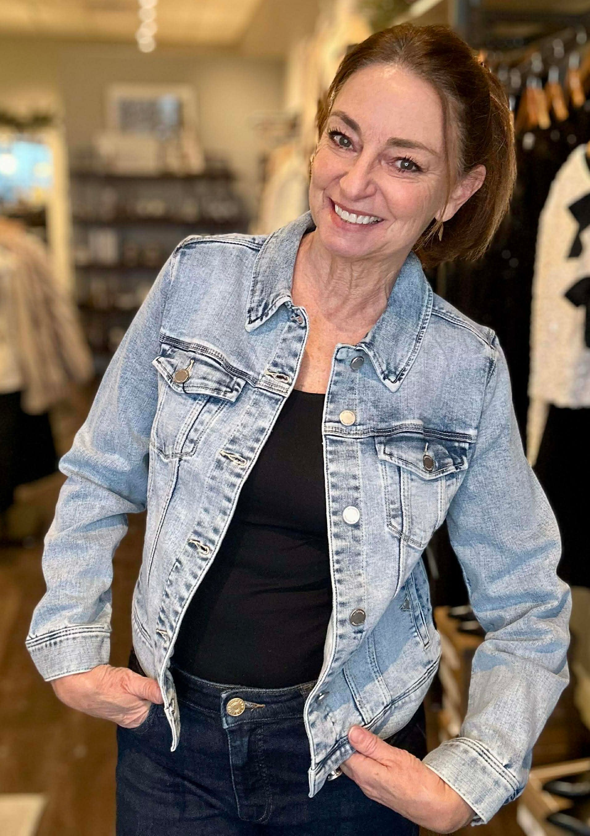 Timeless style meets everyday versatility with this Classic Jean Jacket by Liverpool. The lighter wash creates an effortlessly chic look that pairs seamlessly with everything from dresses to jeans. Crafted for comfort and durability, this wardrobe staple features quality construction that withstands regular wear while maintaining its fresh, approachable aesthetic. Whether layered over casual basics or dressed up for a night out, this jacket delivers the polished edge every woman needs in her closet.