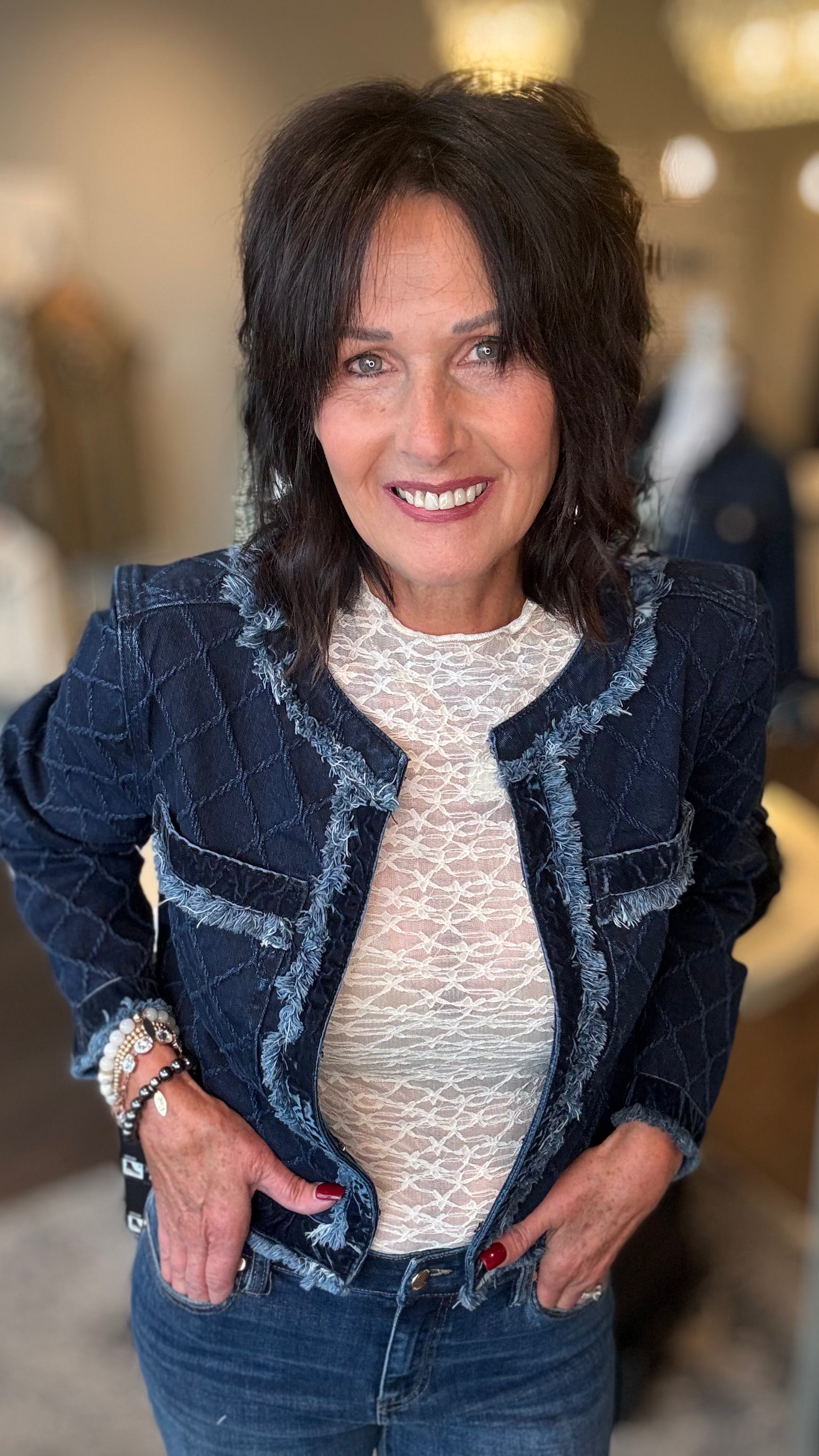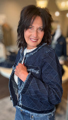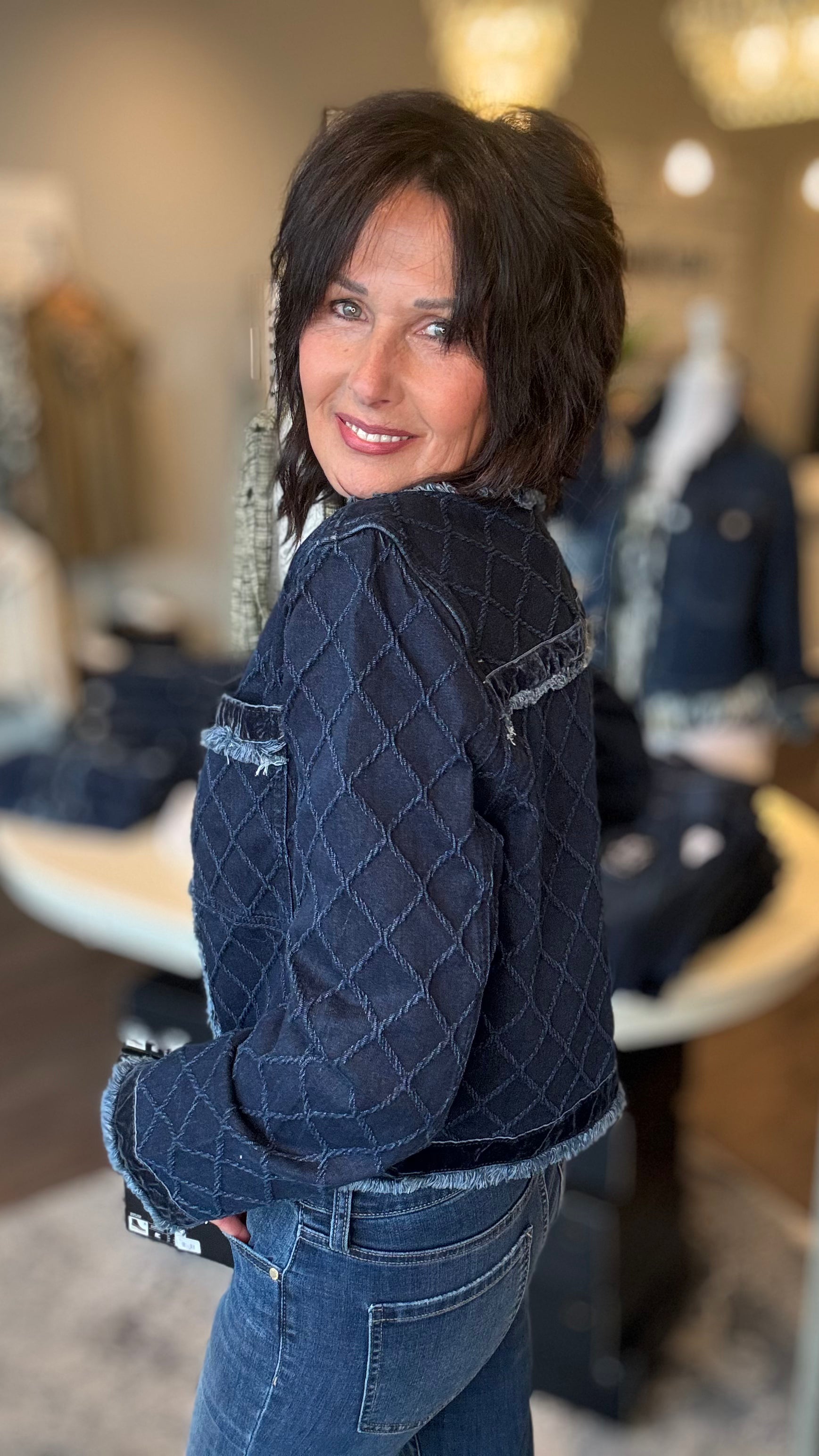 The Frey Edge Denim Jacket redefines bold style with its daring quilted pattern and unique eye hook closure. This jacket blends edgy design with textured detail, making it a standout piece for confident, fashion-forward looks. Elevate any outfit with this striking denim essential.