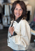 This stone-colored jacket with leather trim offers a refined and versatile look perfect for layering. The leather accents enhance durability and add stylish detail, making it an ideal choice for both casual and dressier occasions. Designed for comfort and lasting wear, this jacket effortlessly complements your wardrobe with timeless appeal.