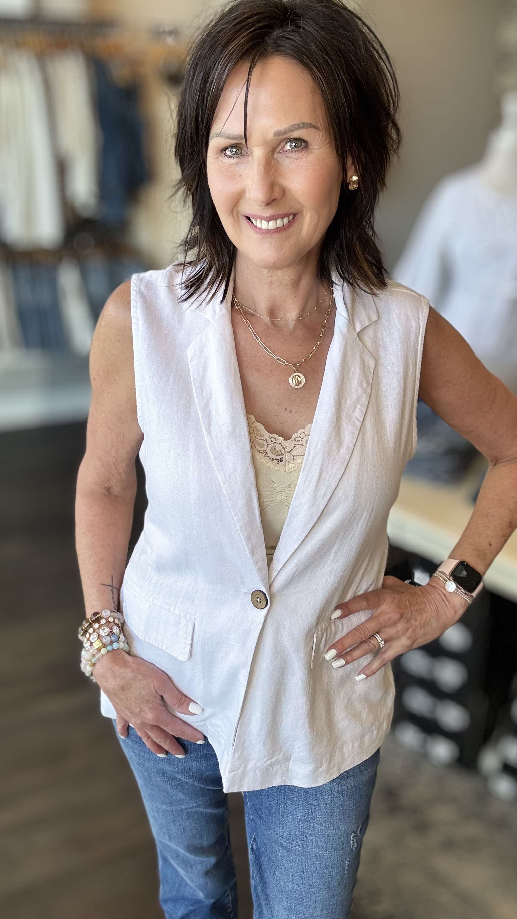 This charming vest exudes timeless elegance with its tailored silhouette and clean lines. Featuring a single-button closure, notched lapels, and practical front pockets, it strikes the perfect balance between structure and femininity. The lightweight fabric ensures all-day comfort, making it a versatile layering piece for both professional and casual looks. Perfectly polished yet effortless!