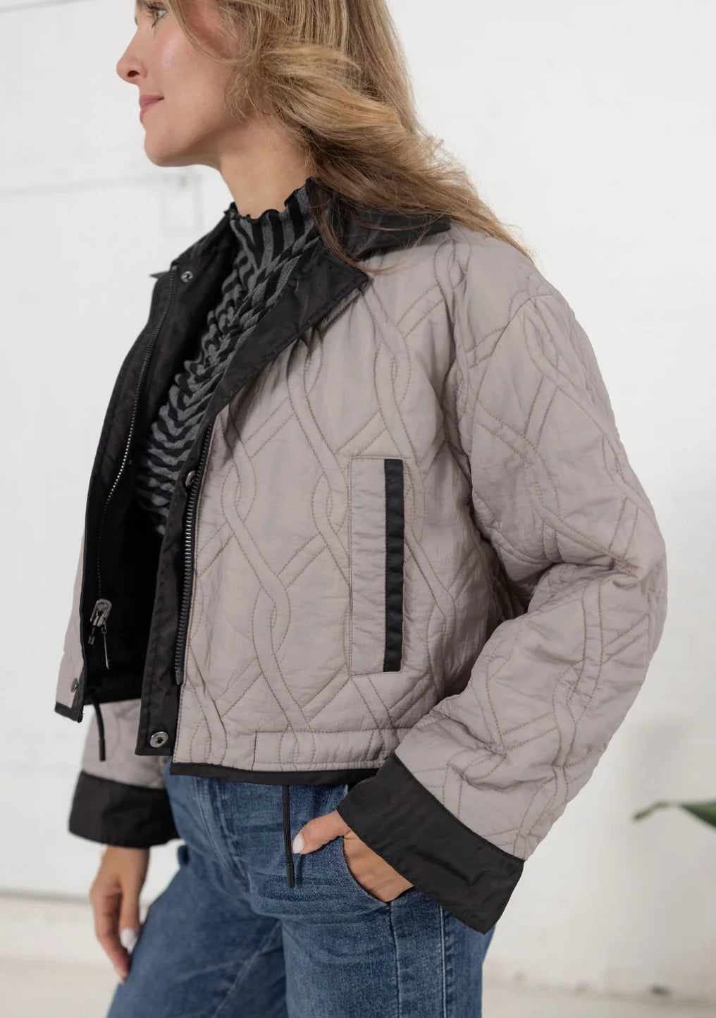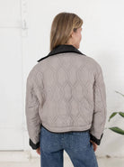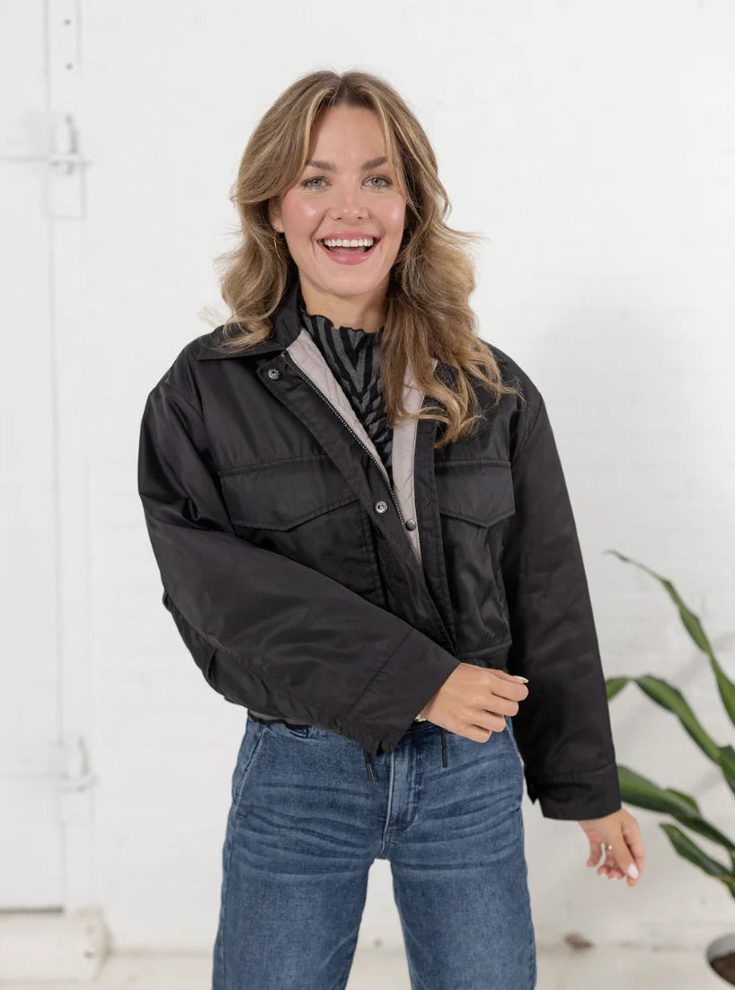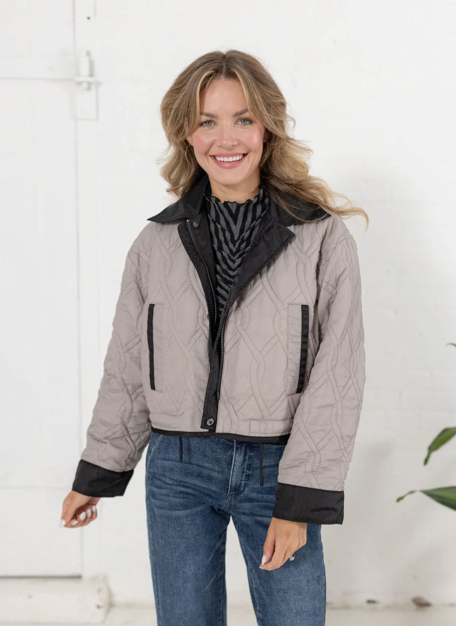 This reversible jacket offers versatile elegance with its sleek black side featuring oversized patch pockets, perfect for a refined yet functional look. Flip to the other side to reveal a sophisticated grey quilted texture that adds subtle warmth and style. Ideal for adapting to varying moods and occasions, this jacket combines practicality with timeless design.