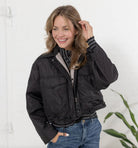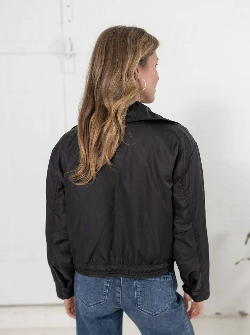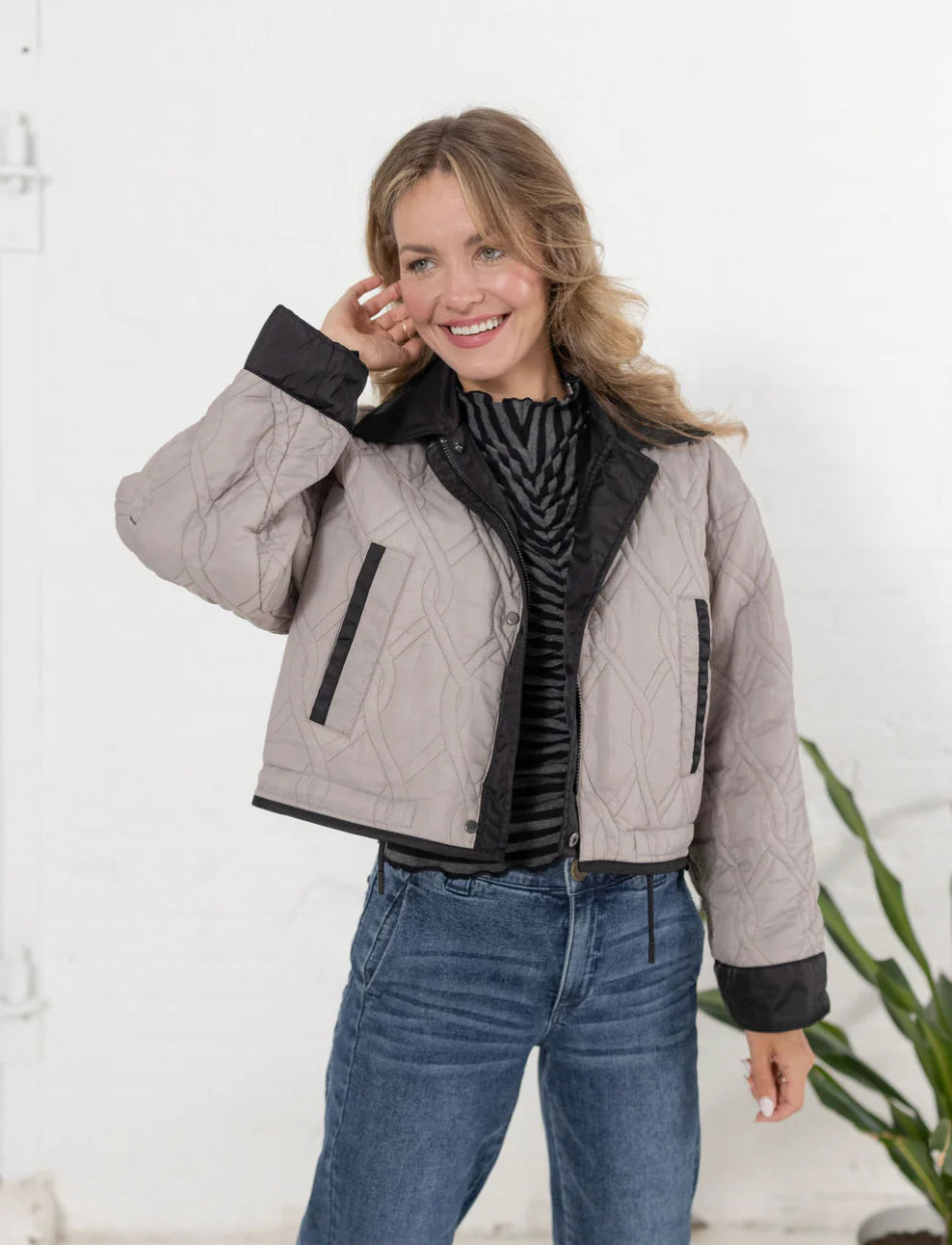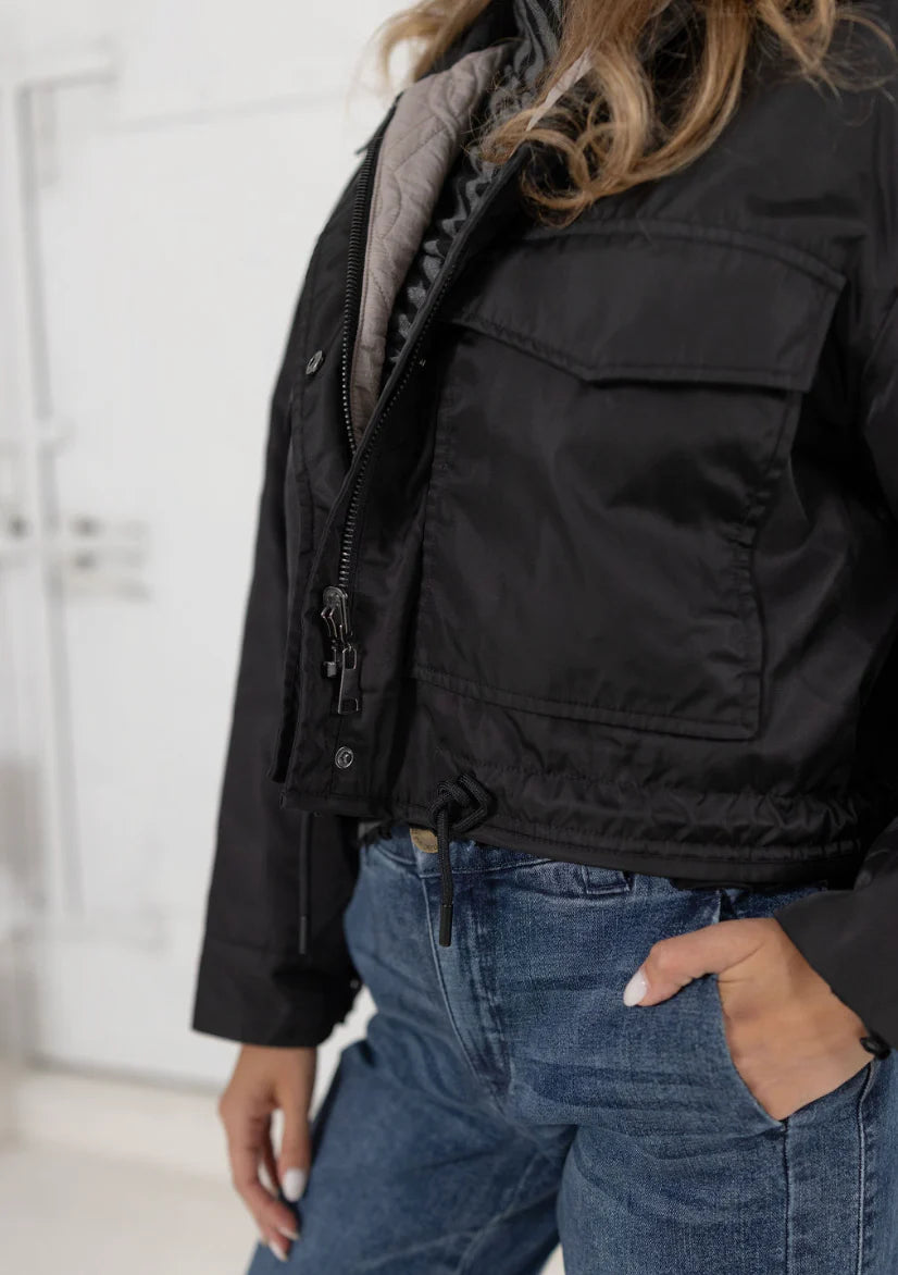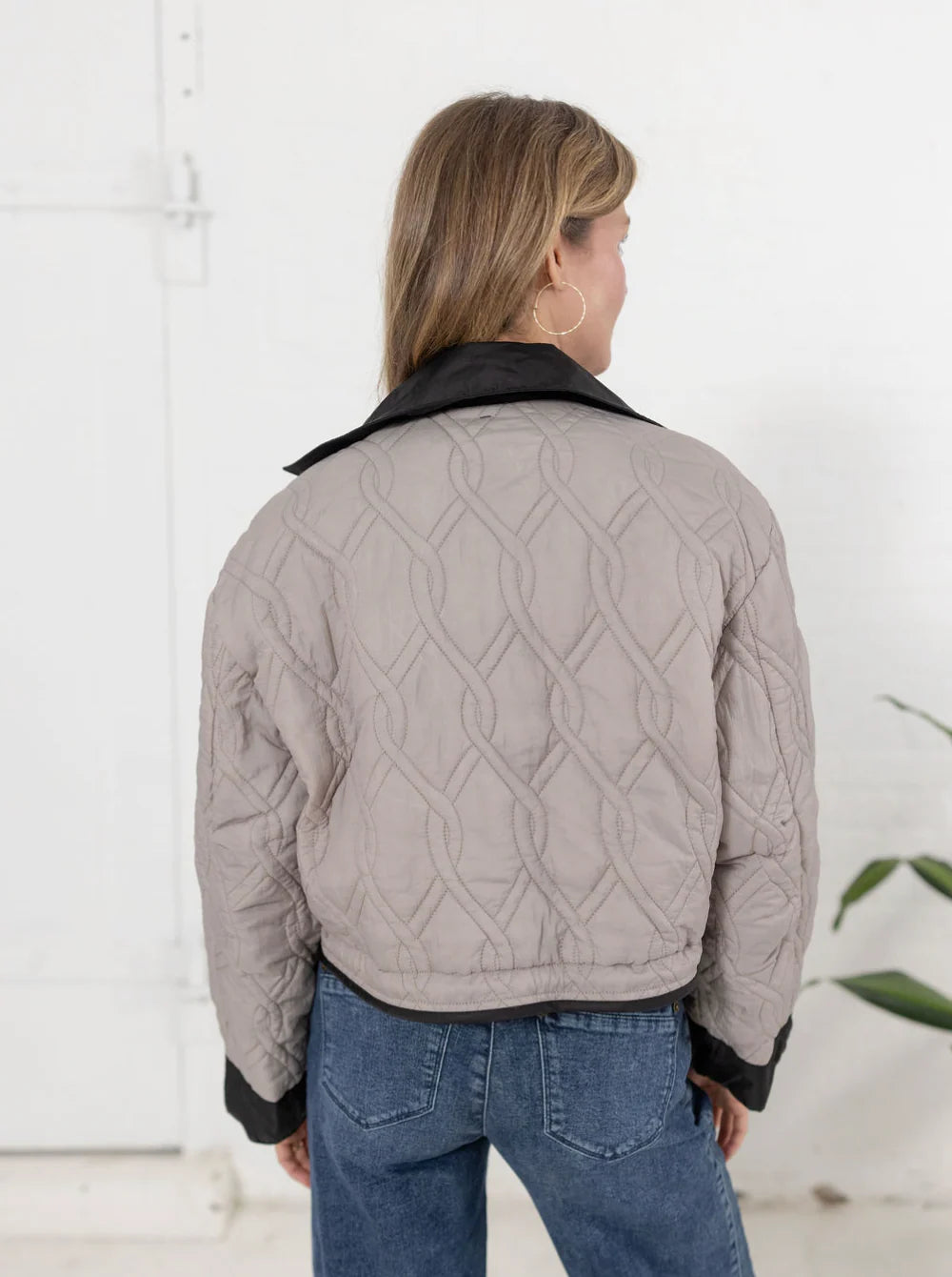 This reversible jacket offers versatile elegance with its sleek black side featuring oversized patch pockets, perfect for a refined yet functional look. Flip to the other side to reveal a sophisticated grey quilted texture that adds subtle warmth and style. Ideal for adapting to varying moods and occasions, this jacket combines practicality with timeless design.
