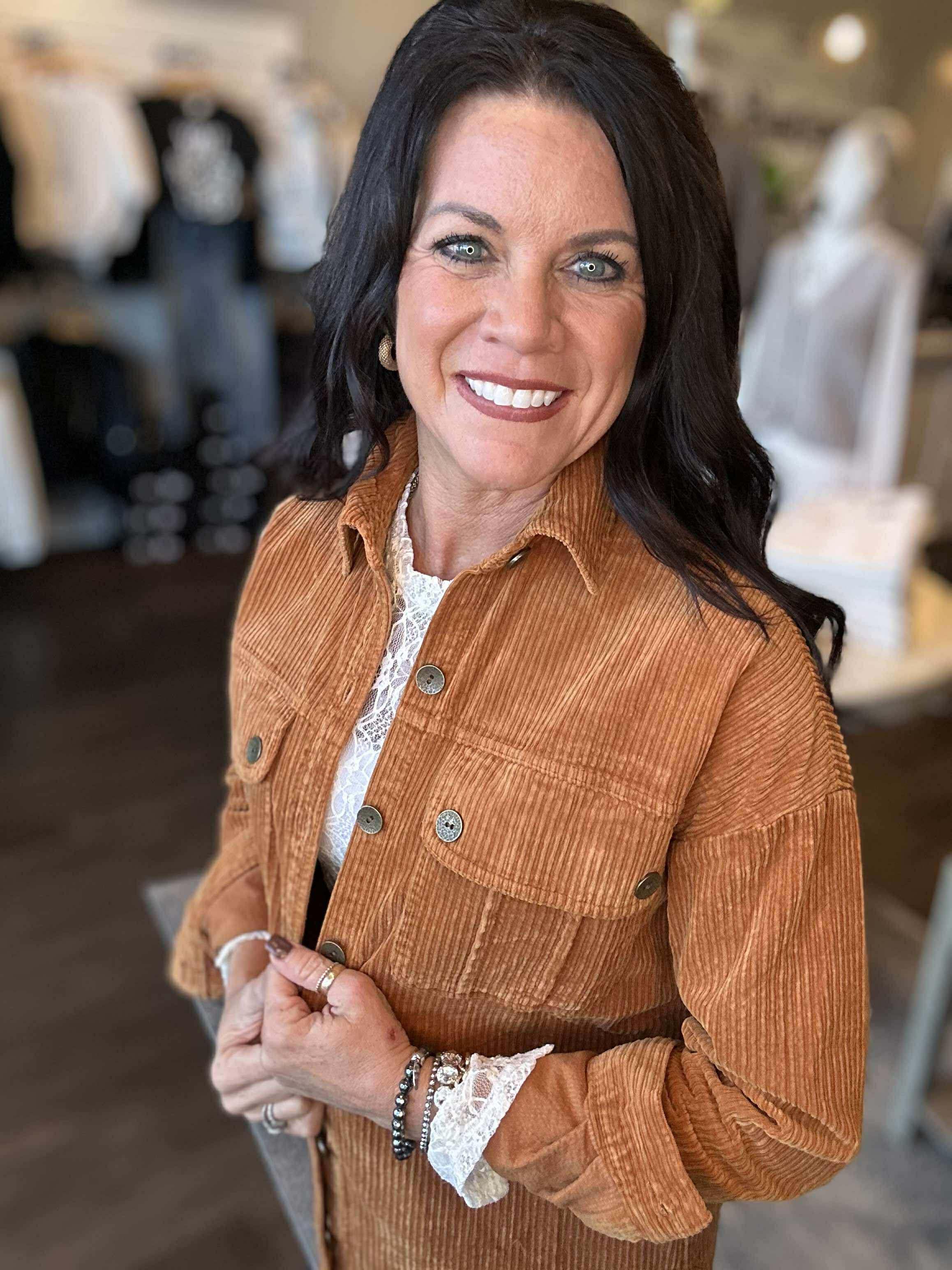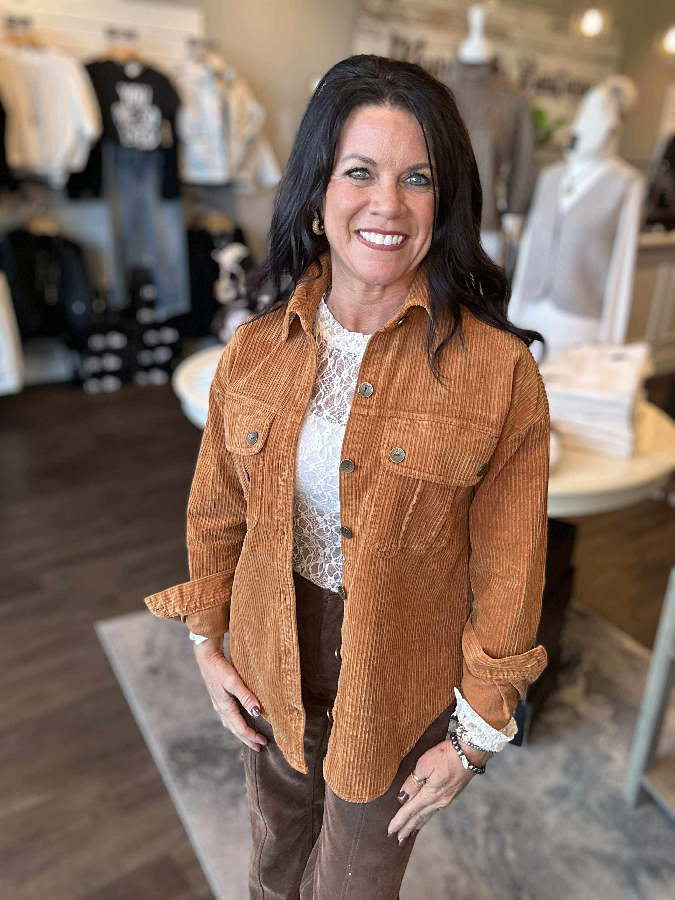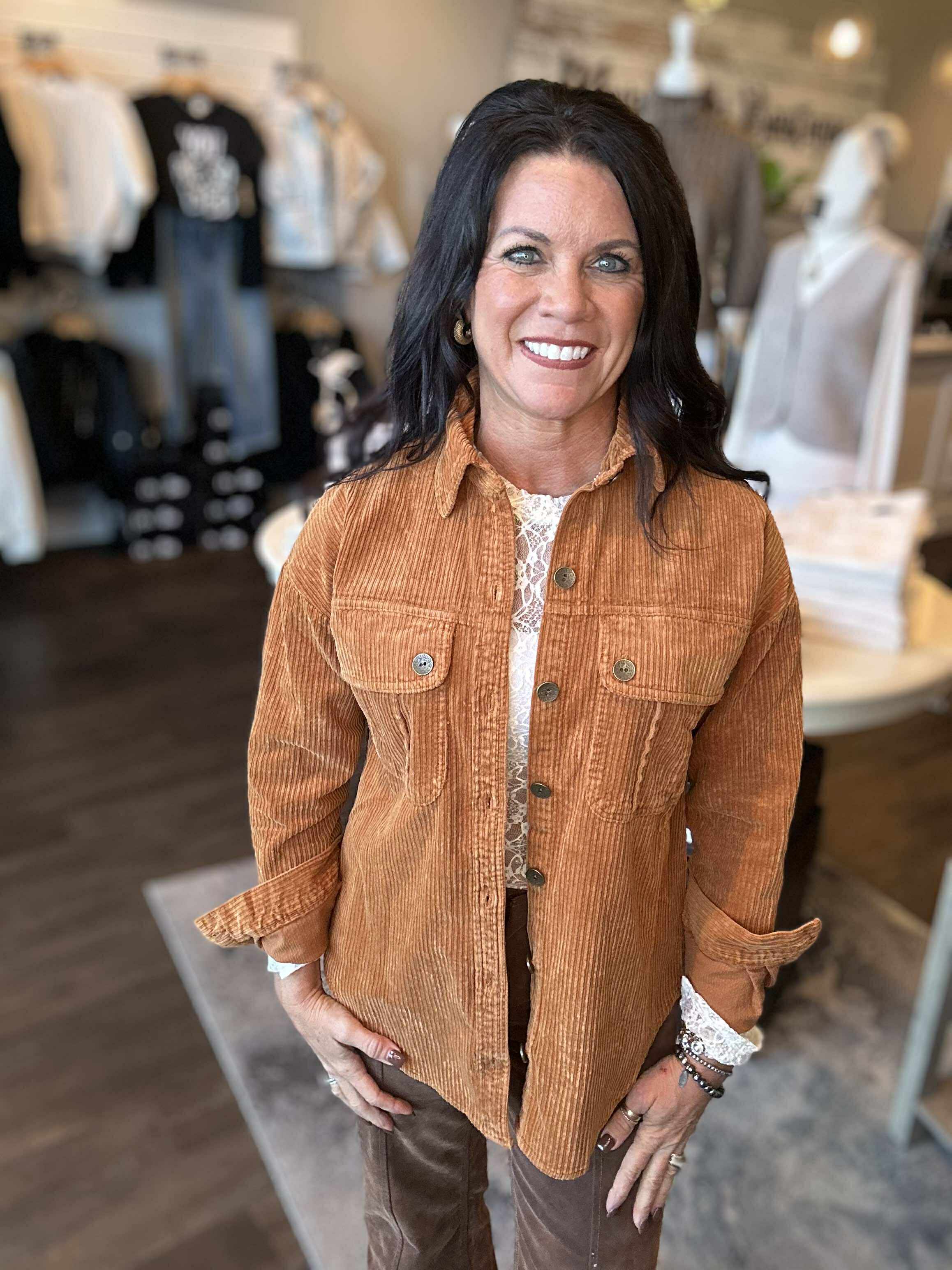 Elevate your layering with this rust-colored corduroy shacket, expertly crafted to blend the warmth of a jacket with the comfort of a shirt. Its rich hue and textured fabric add refined depth to any outfit, while the tailored fit ensures a polished silhouette. Perfect for transitional weather, this shacket offers both style and versatility in one elegant piece.