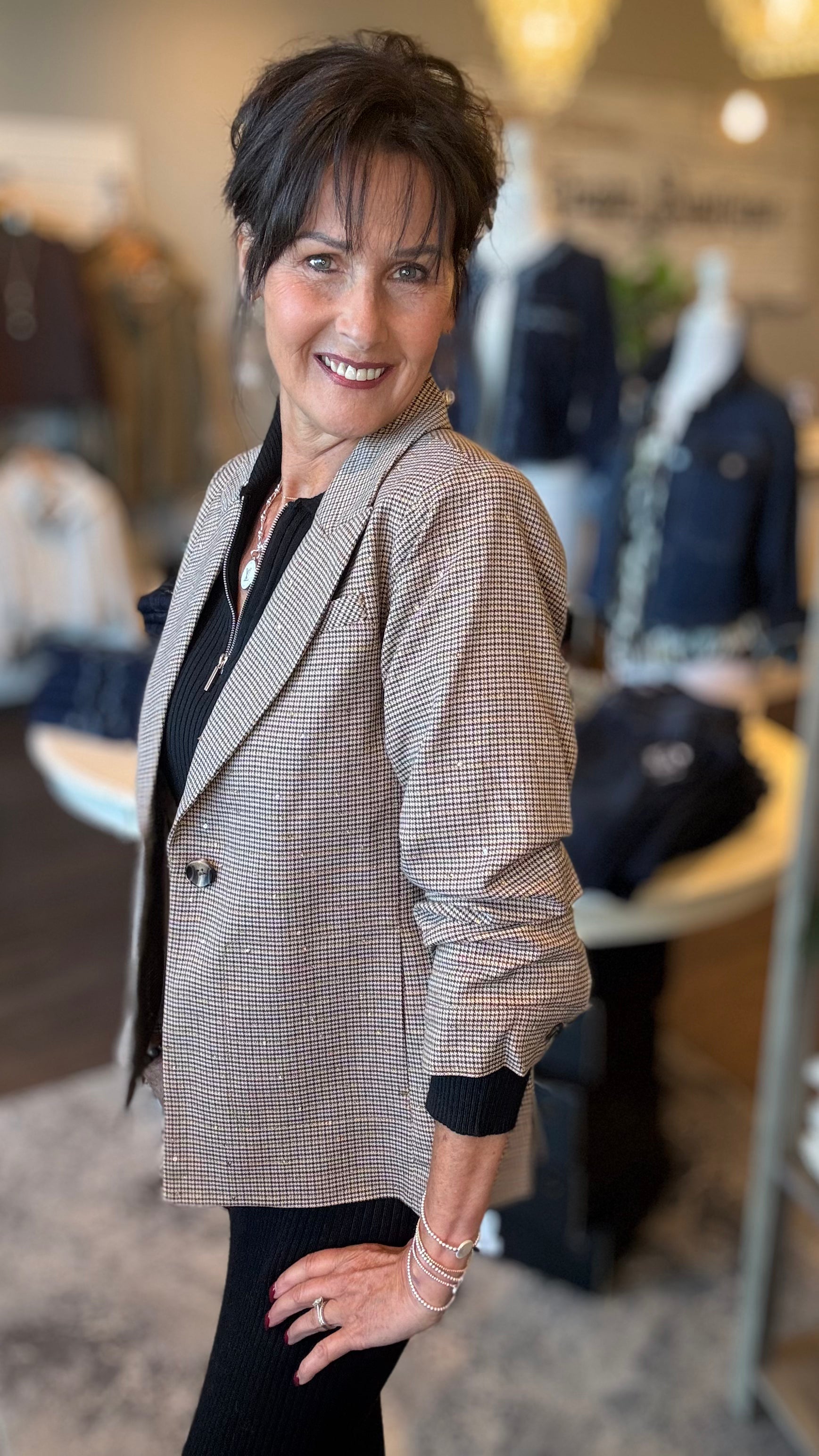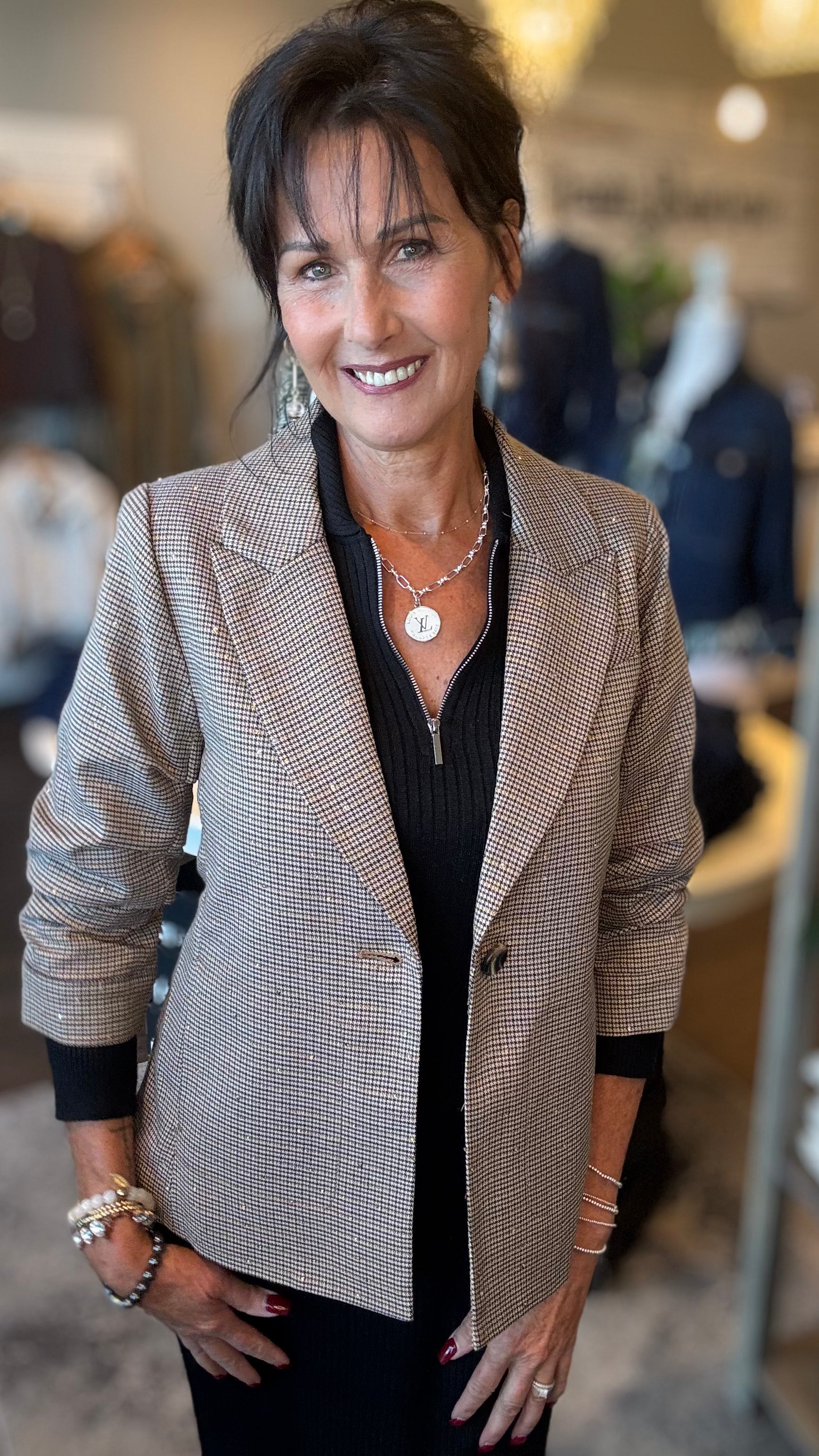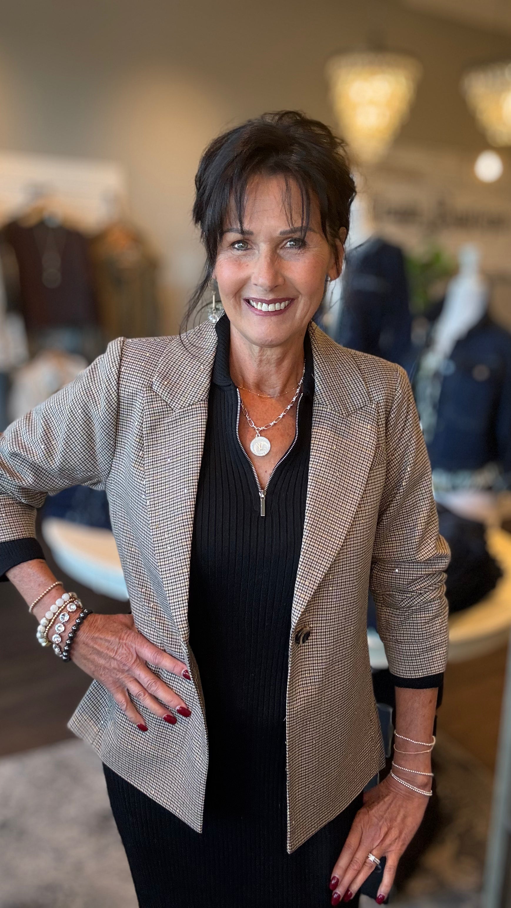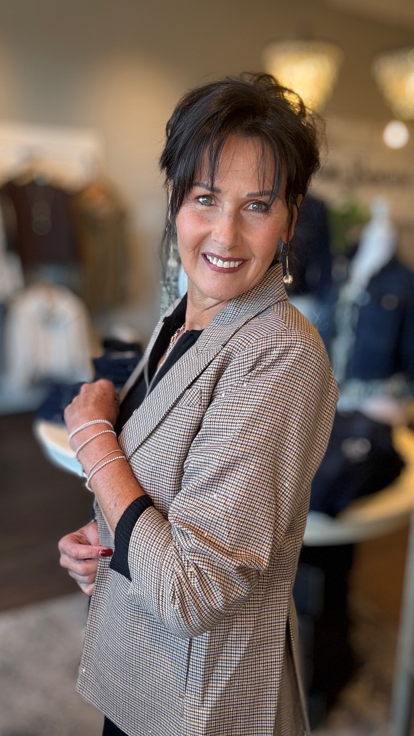 Elevate your wardrobe with this sophisticated herringbone blazer, enhanced by subtle sequin detailing that catches the light gracefully. Featuring elegant 3/4 sleeves, it offers a refined silhouette perfect for both professional settings and stylish evenings. This blazer combines classic pattern with a modern shimmer, delivering timeless elegance with a contemporary edge.