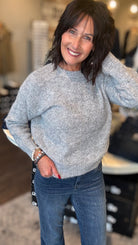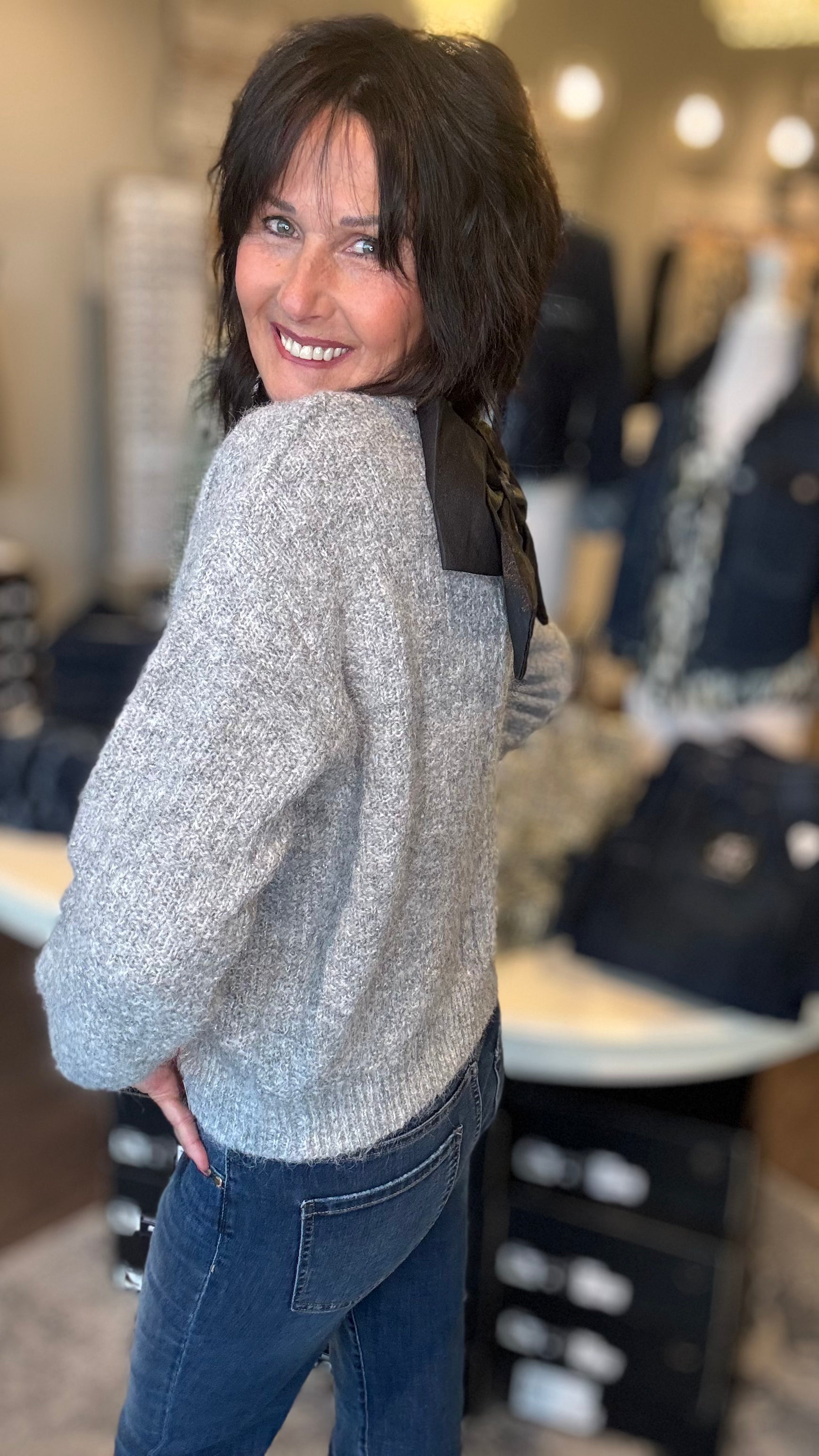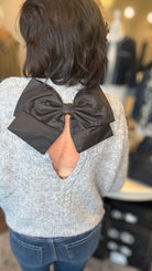 Elevate your winter wardrobe with the Bow Back Lurex Fuzzy Sweater, featuring a striking big black bow gracefully positioned on the upper back and neck area. The subtle shimmer of lurex combined with the soft fuzzy texture adds a refined touch, merging comfort with sophisticated style for a standout look.