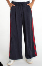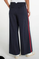Own the room in these audacious Pleated Trouser Pants. Navy base meets crisp white pinstripes and a fearless red tuxedo stripe racing down the side—a combination that refuses to blend in. The structured pleated front demands attention while delivering impeccable tailoring. These aren't your standard trousers; they're a bold declaration of style for those confident enough to break the mold. Pair them with a simple top and let the pants do the talking. Daring, distinctive, unforgettable.