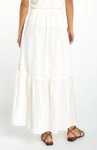 Effortless elegance meets everyday comfort in this tiered woven skirt. Crafted in soft ivory with a subtle tone-on-tone pattern, the layered silhouette creates beautiful movement and dimension. The pull-on design offers easy styling without compromises on sophistication. Perfect for transitional seasons and versatile enough to dress up or down.