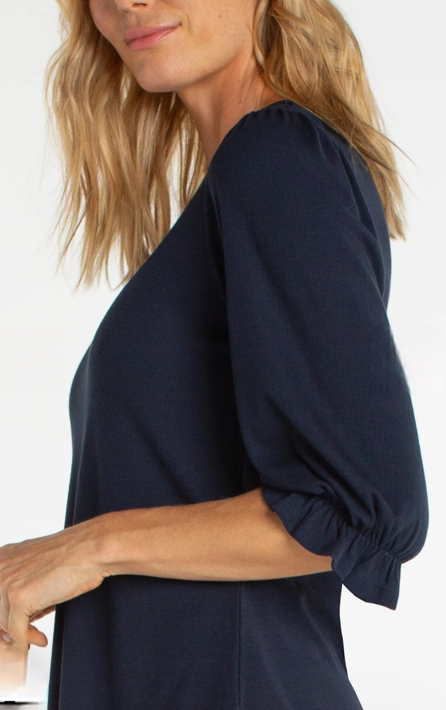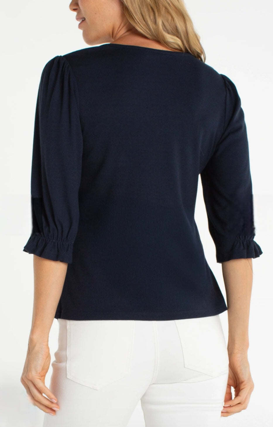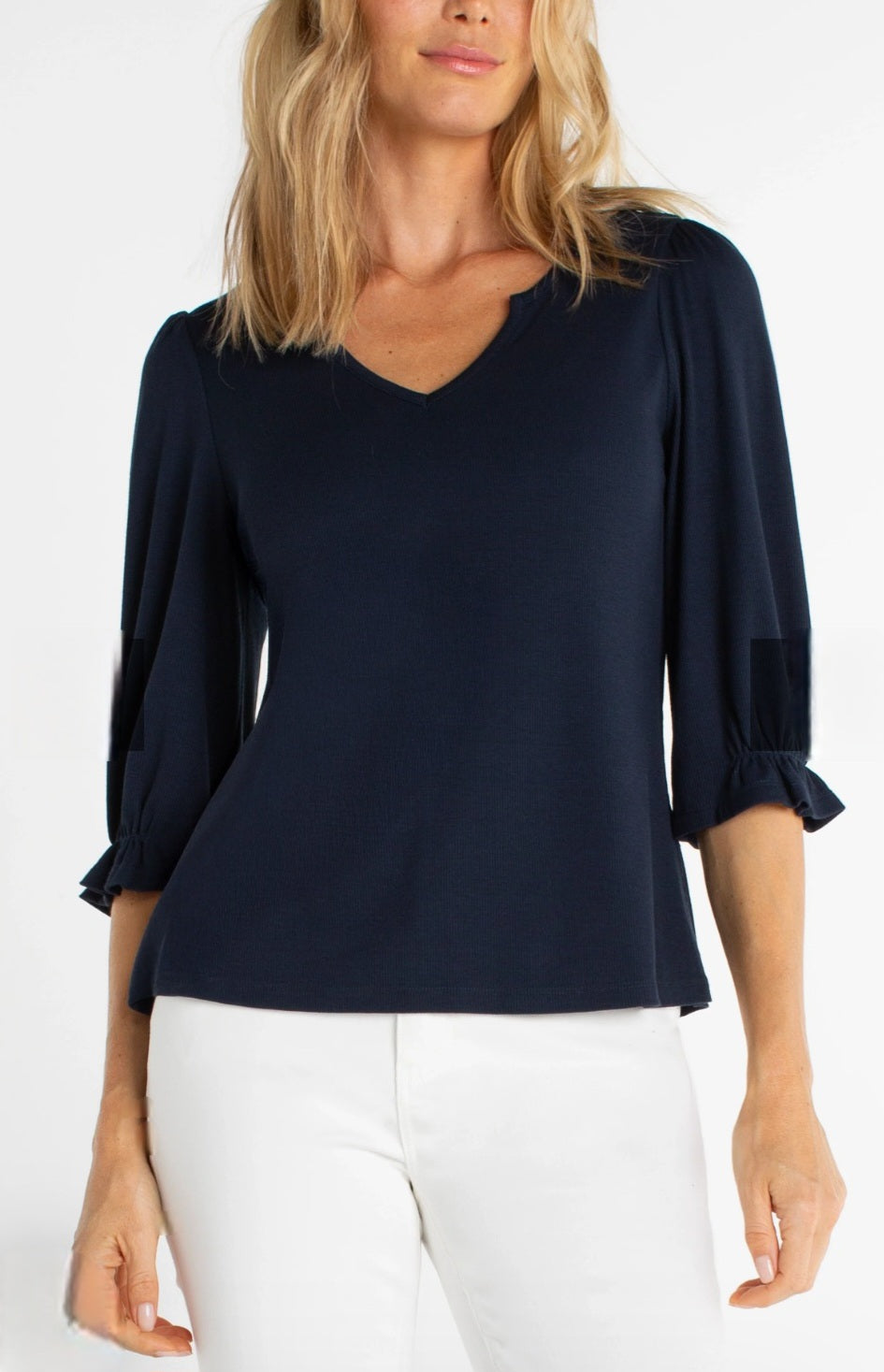 Navy V-Notch Top Elevate your everyday wardrobe with this striking navy top that commands attention. The signature v-notch neckline creates a bold, modern silhouette while the three-quarter sleeves offer the perfect balance of coverage and edge. Versatile enough to dress up or down, this piece transitions seamlessly from office to weekend. A daring essential that refuses to blend in.