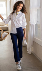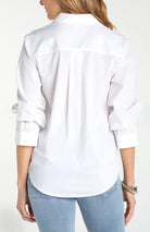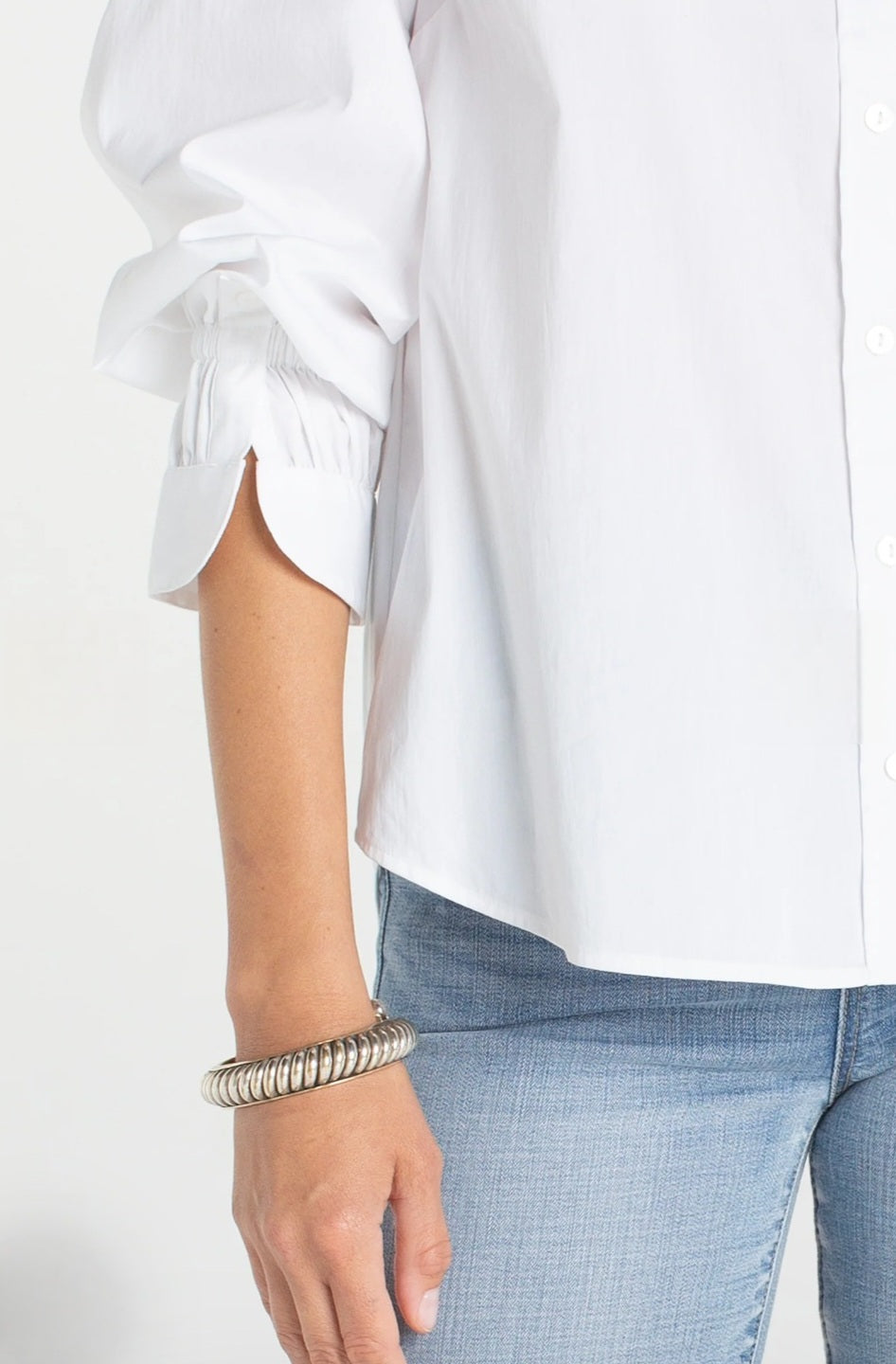 Crisp white collared button-down that commands attention with its clean lines and versatile edge. Adjustable sleeves let you own the fit—roll them up for bold confidence or keep them structured for polished power. The classic button front pairs with a sharp collar that works equally well dressed up or deconstructed. A wardrobe essential that refuses to be boring.