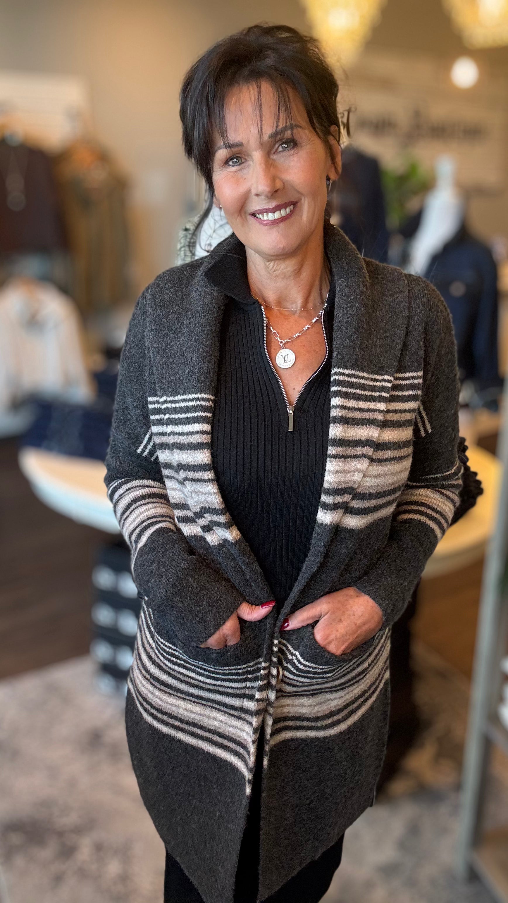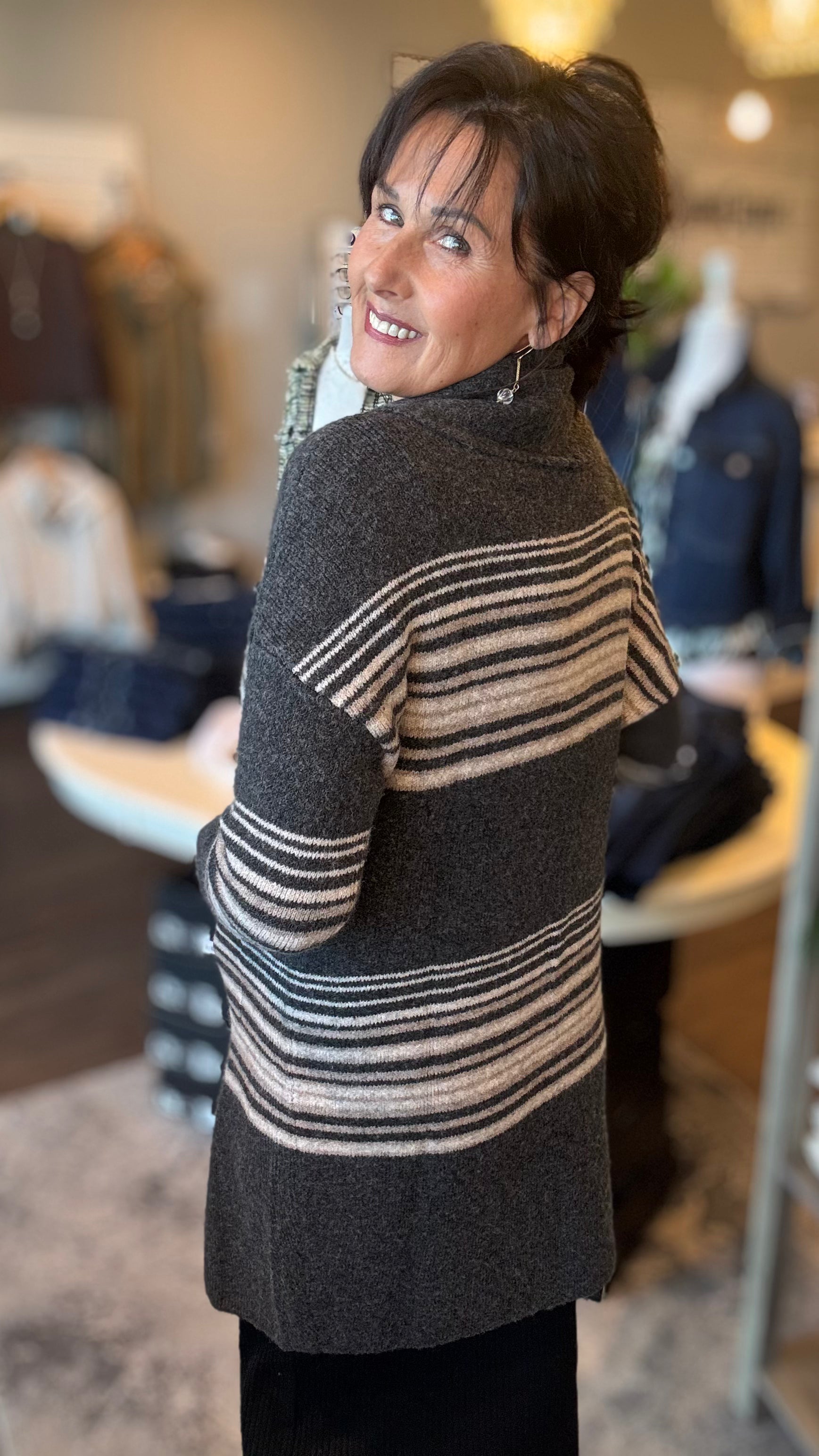 Elevate your style with this charcoal knit cardigan featuring bold tan stripes. Its mid-length cut delivers a confident silhouette, perfect for layering daring looks that stand out. Embrace effortless edge and warmth in one statement piece.