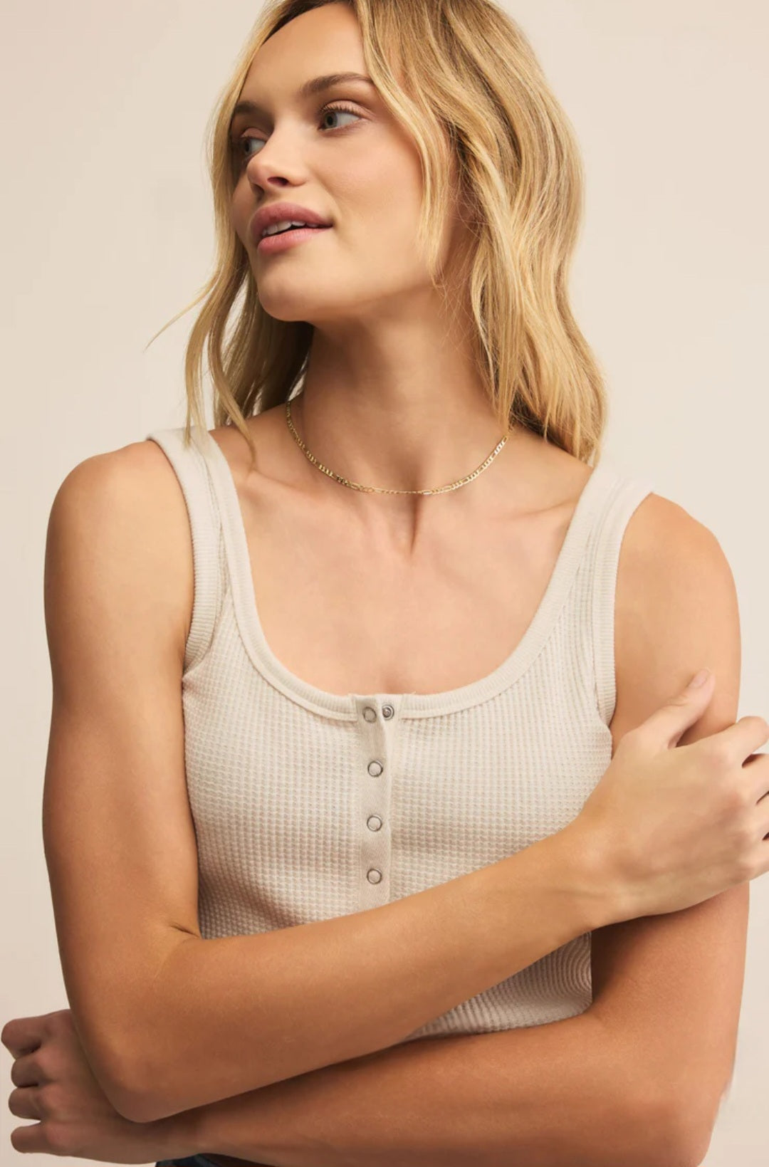 The Starling Mini Thermal Tank is your new colorful companion for cozy days. Available in multiple cheerful shades, it’s made from soft thermal fabric that keeps you warm and comfy. Whether layered or worn alone, this playful tank adds a splash of fun and warmth to your everyday look.