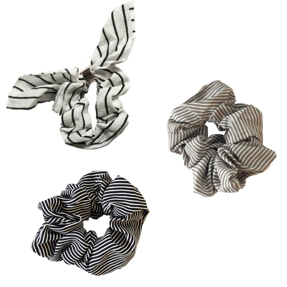 Add a stylish touch to your hair routine with this 3Pack of scrunchies featuring classic white, black, and taupe stripes. These versatile accessories provide a secure hold without damaging your hair, perfect for all-day wear. Whether for workouts, casual outings, or dressing up, these striped scrunchies effortlessly complement any look while keeping your hair neat and comfortable.