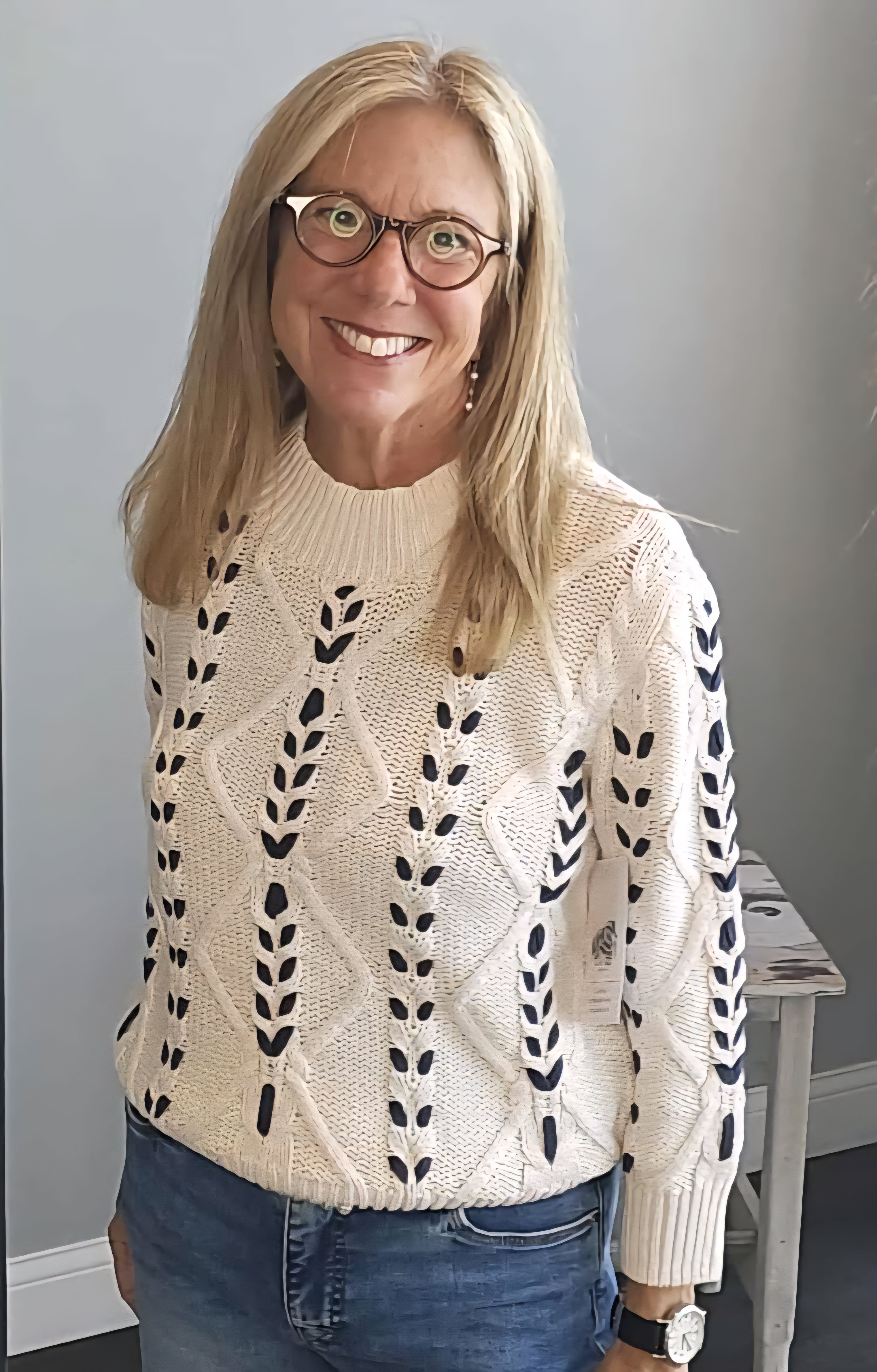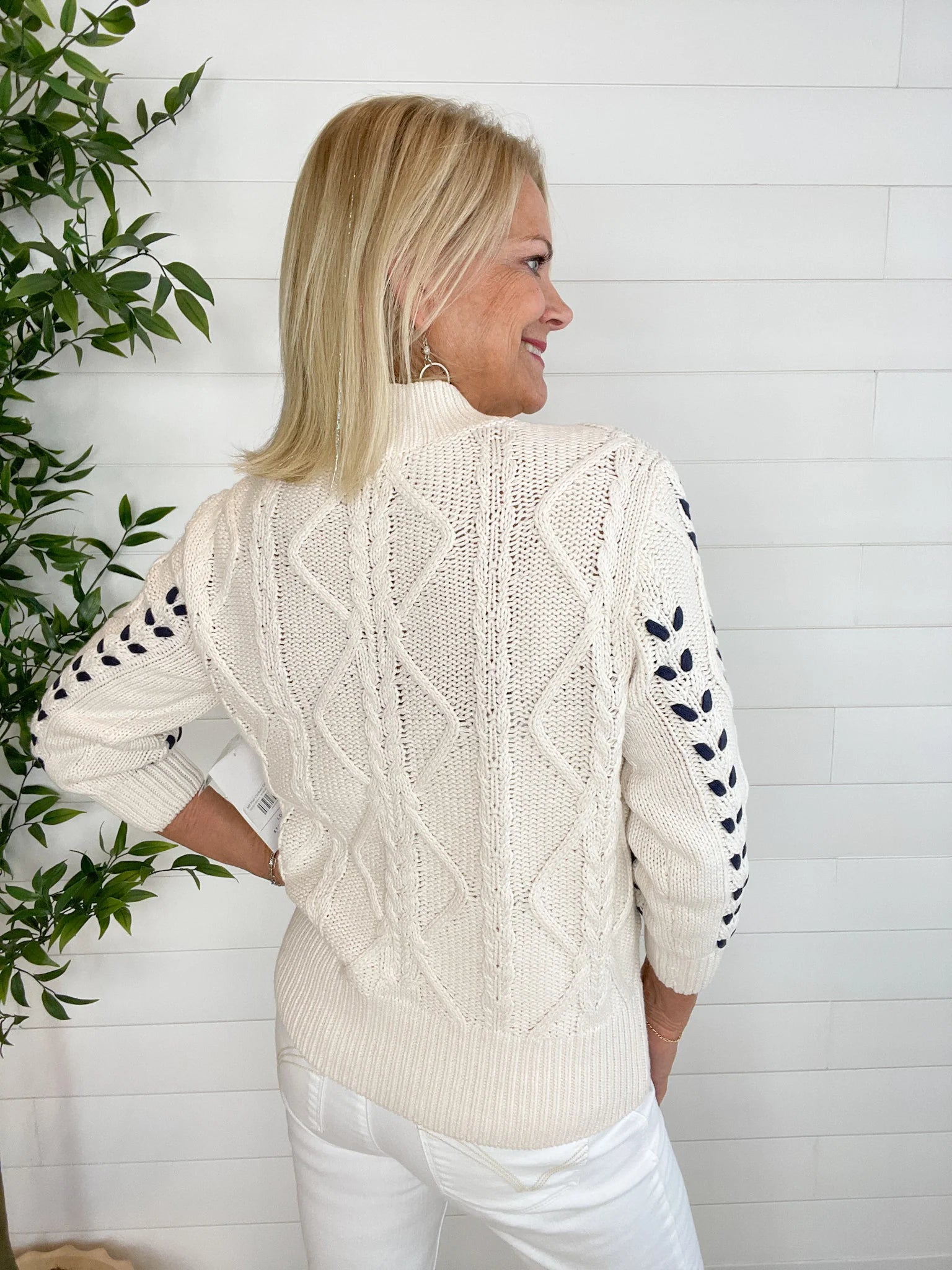 Elevate your style with this daring 3/4 sleeve mock neck sweater in moonstone. Featuring intricate cable detailing, it combines bold texture with a sleek silhouette, perfect for making a confident statement in any setting.