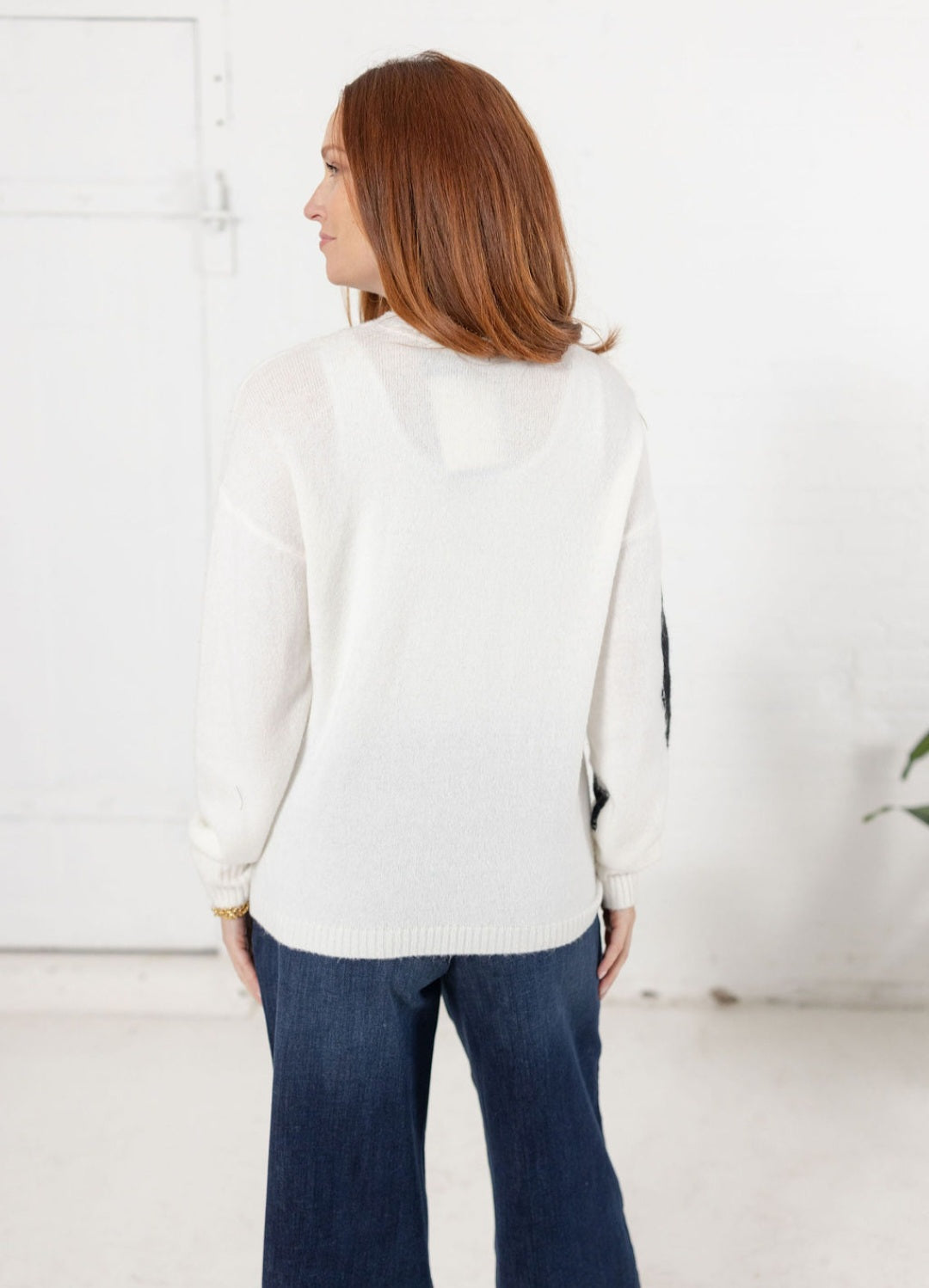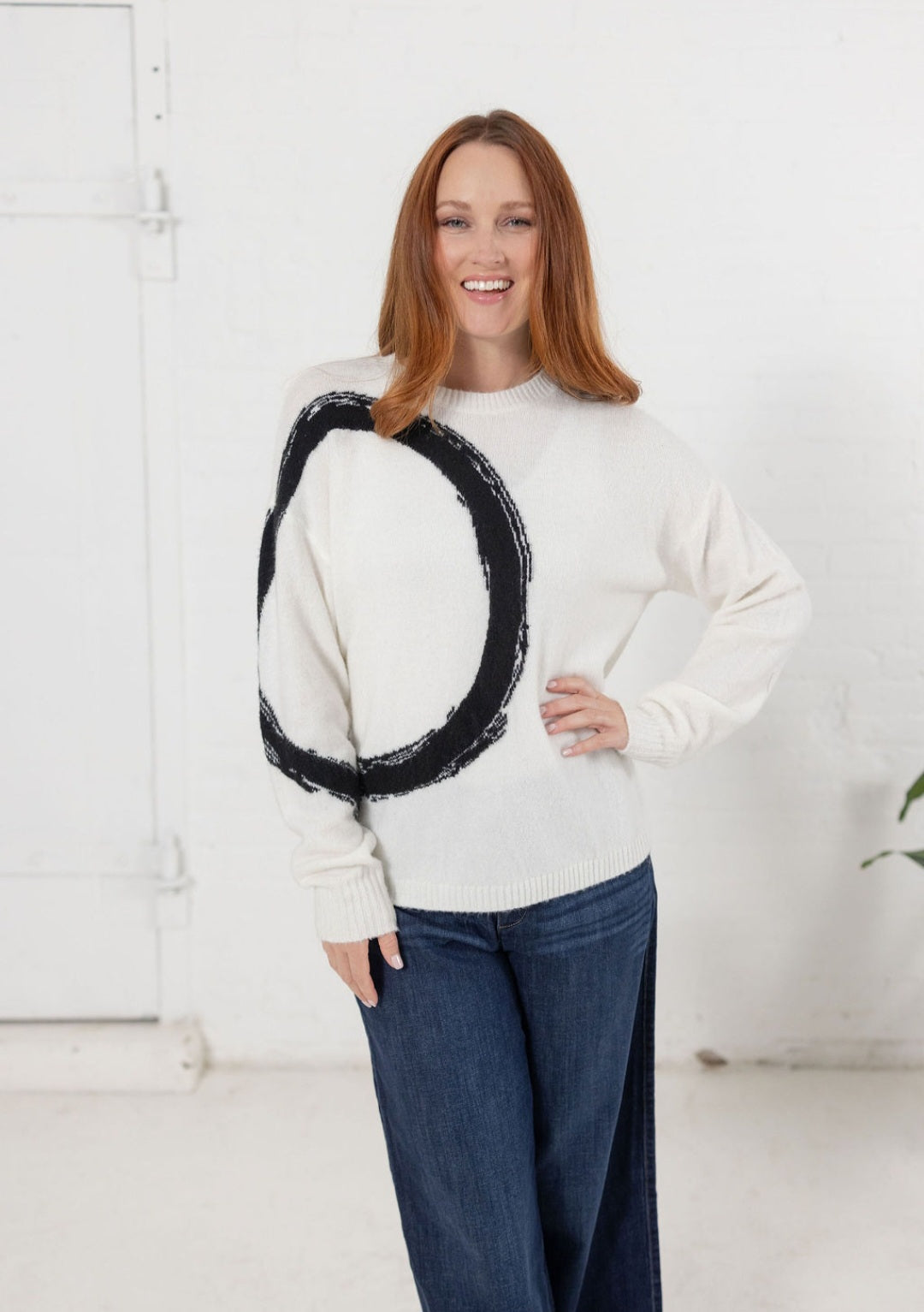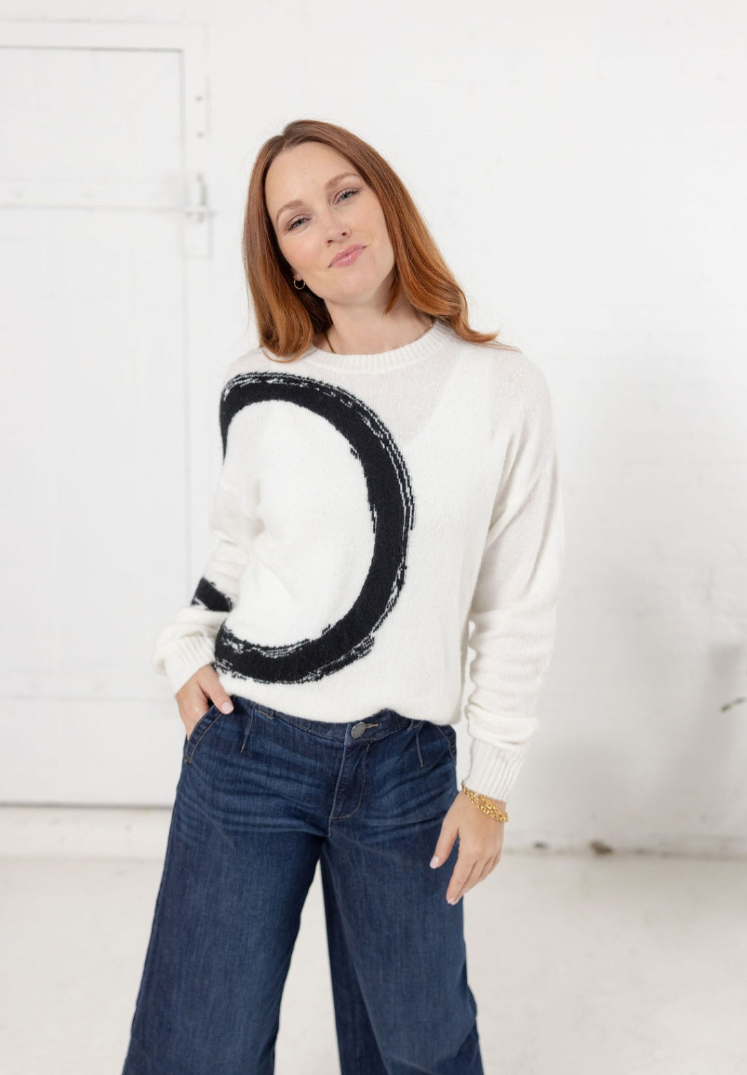 Elevate your wardrobe with this sophisticated Placed Jacquard Crew Neck Sweater in white ecru, featuring a bold black circle design for a modern edge. Crafted from a soft wool blend, it ensures warmth and lasting comfort. Its relaxed fit, ribbed cuffs, and classic crew neck make it perfect for seamlessly transitioning from office elegance to evening chic. A refined essential for the season.