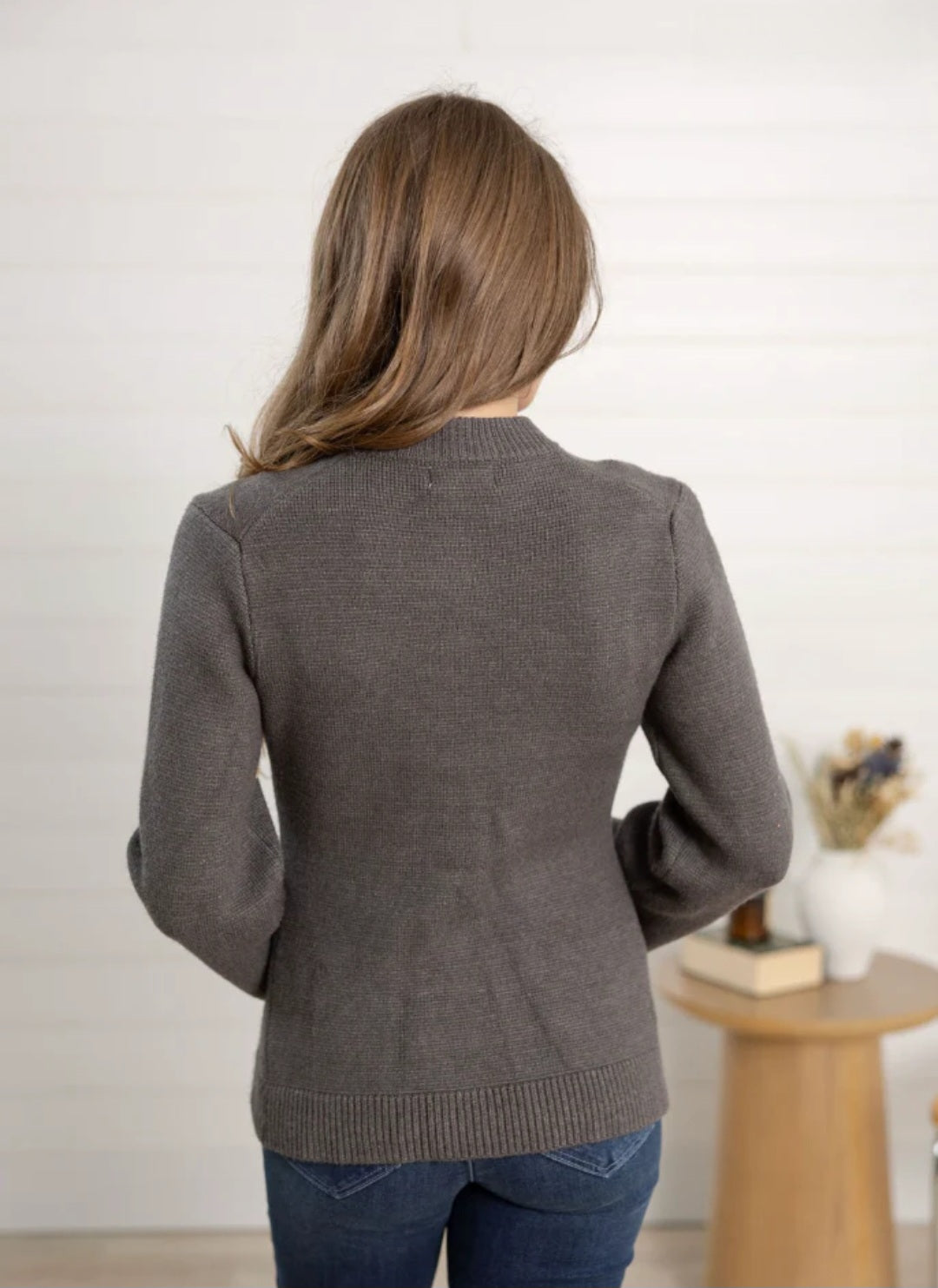 Elevate your wardrobe with the Crewneck Flair Sleeve Grey Sweater by Elan. Its soft grey fabric offers cozy comfort, while the stylish flair sleeves add a unique, fashionable touch. Perfect for layering or wearing on its own, this sweater blends casual ease with standout design, making it an essential piece for effortless everyday chic.