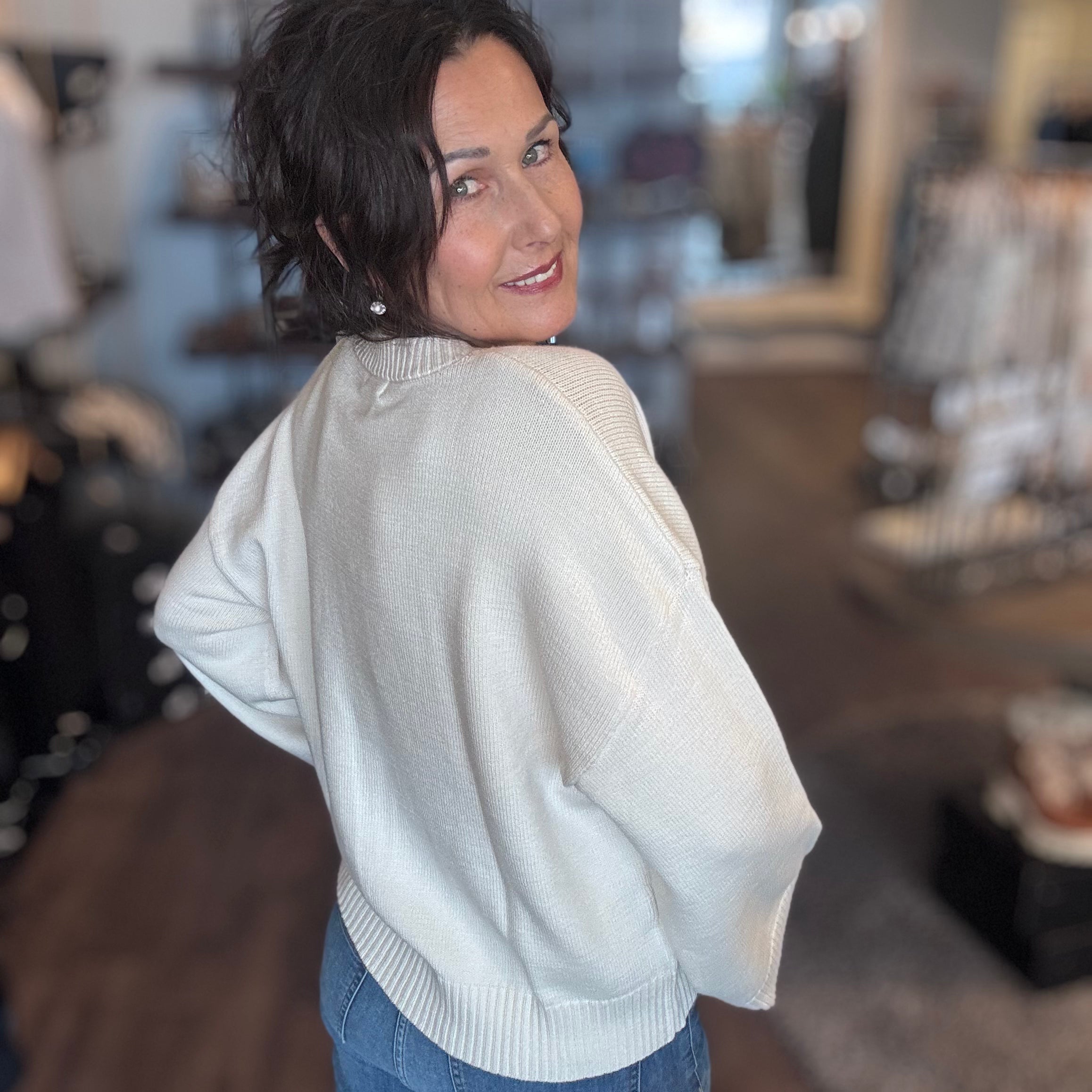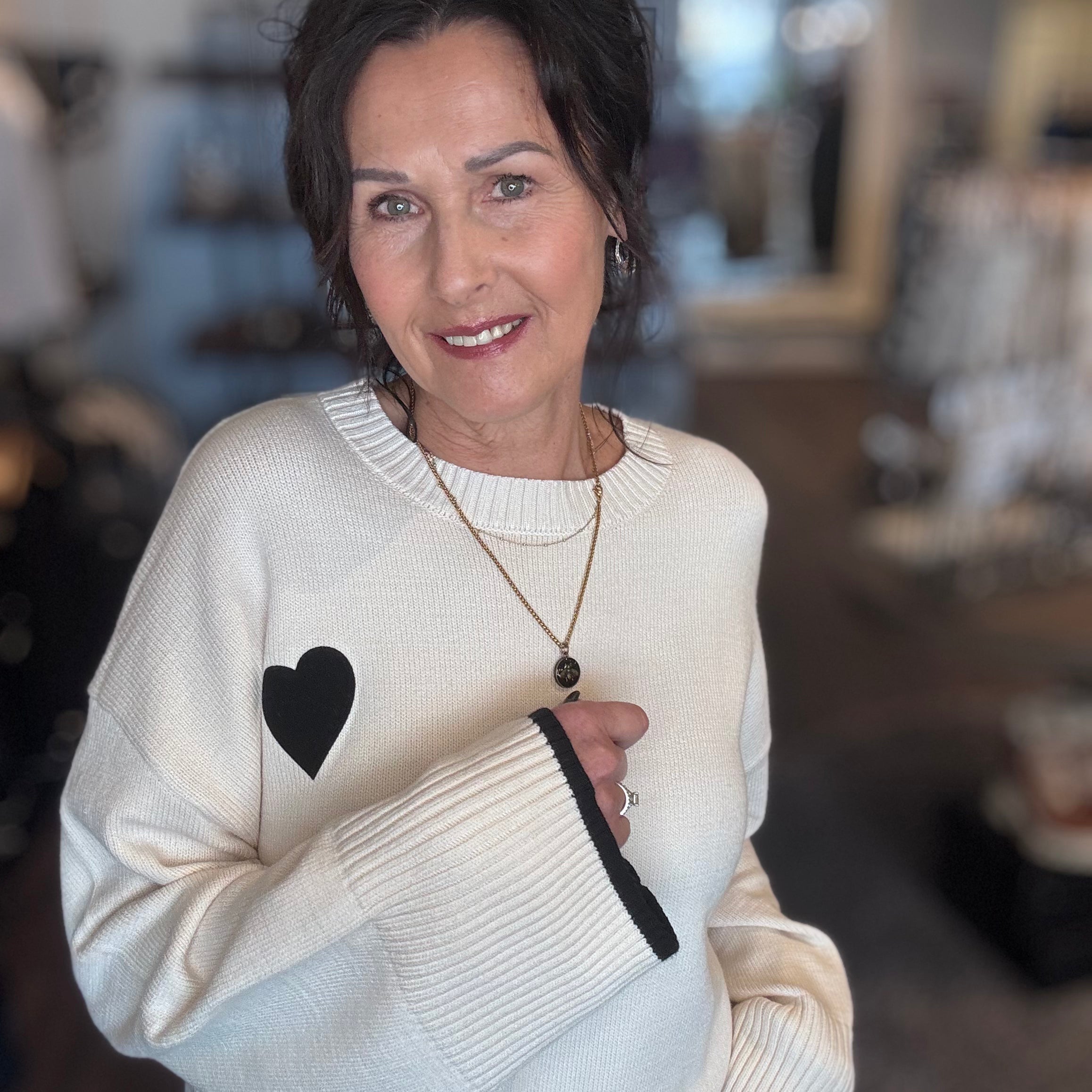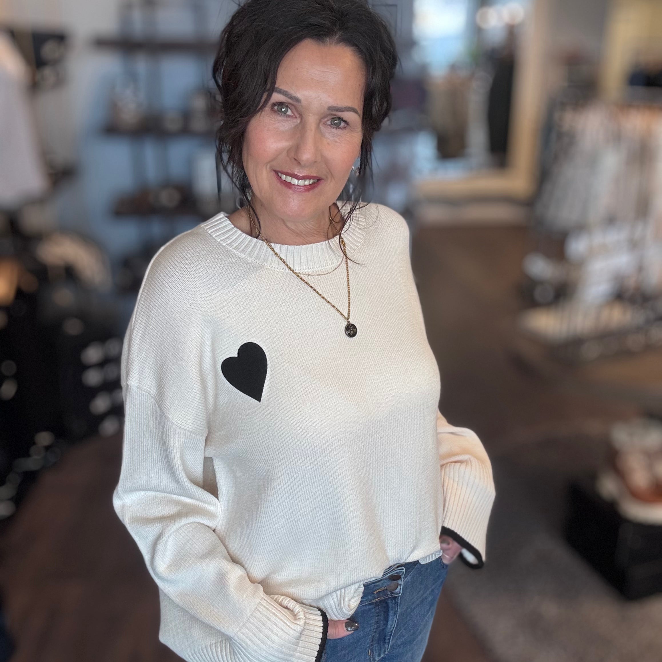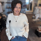 # Flair Cuff Sweater w/ Heart Elevate your everyday wardrobe with this refined cuff sweater, featuring a delicate heart detail that adds understated sophistication. The flared cuff design creates a polished silhouette while maintaining comfort for all-day wear. Crafted in a crisp white tone, this versatile piece transitions seamlessly from casual outings to layered styling. Perfect for those who appreciate quality construction and timeless design elements that work across seasons.