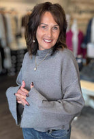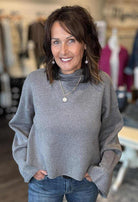 Wrap yourself in cozy charm with this grey mock neck sweater featuring playful bell sleeves. Its soft fabric and unique sleeve design add a fun twist to your everyday look, making it perfect for both casual outings and relaxed weekends. Stay warm and stylish with a touch of whimsy!