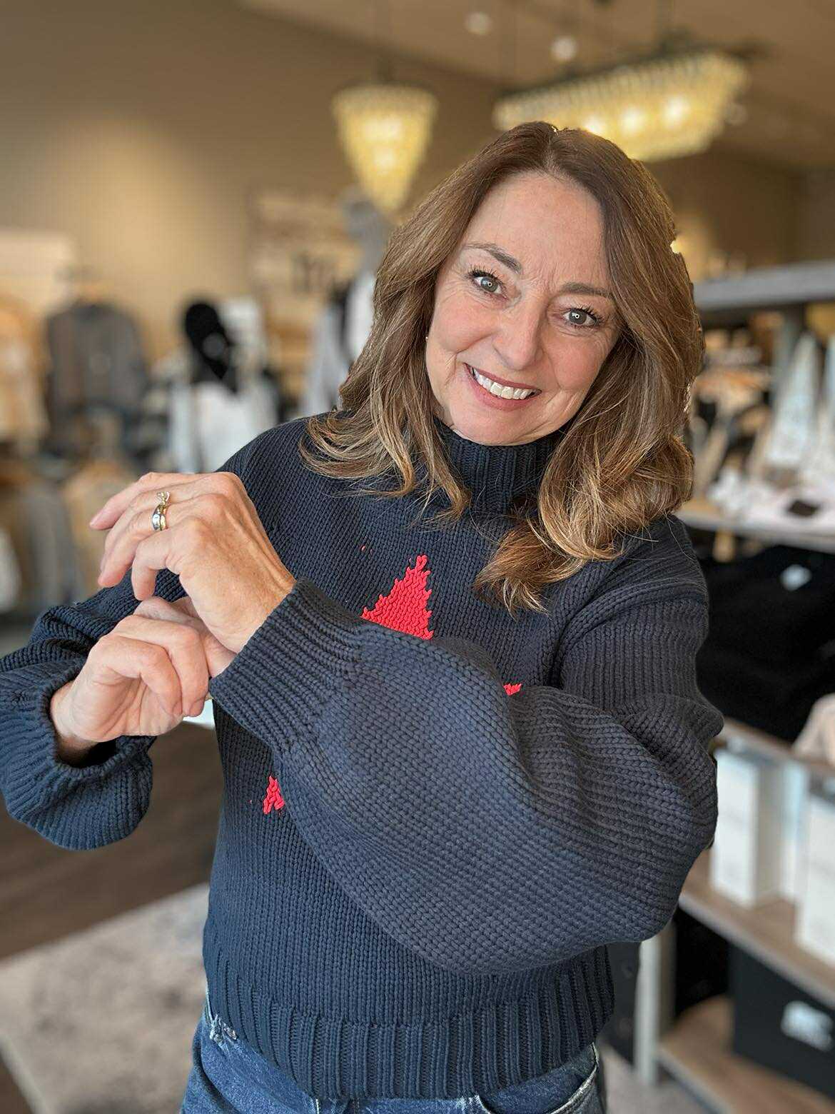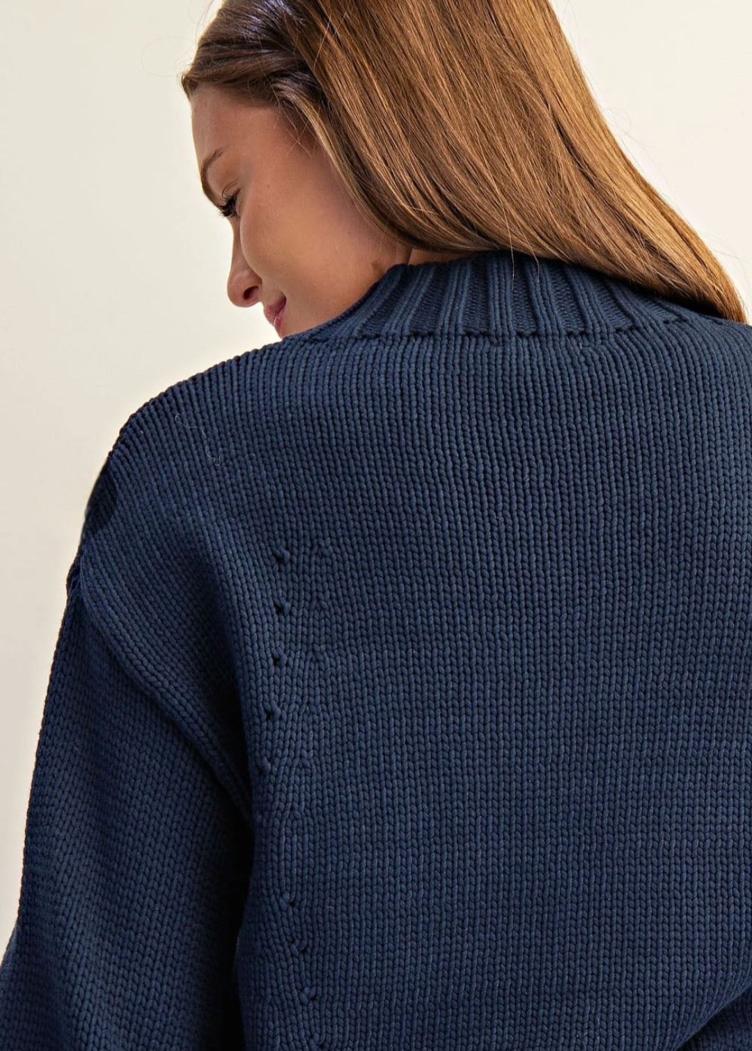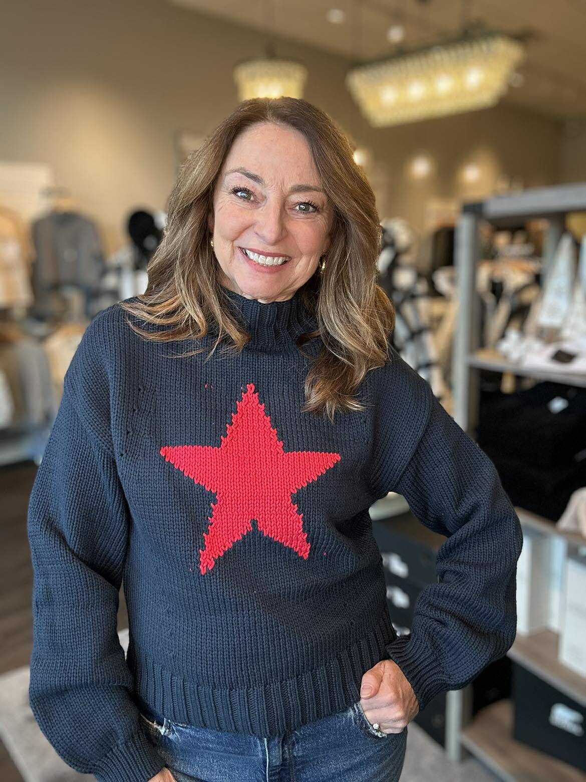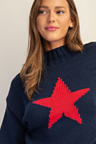 Reach for cozy comfort with this navy mock neck sweater, featuring a charming star graphic that adds personality to your everyday rotation. The long sleeves provide warmth while the relaxed fit keeps things effortless and fun. Perfect for layering or wearing solo, this piece brings a touch of whimsy to casual outfits and pairs beautifully with jeans, skirts, or leggings.