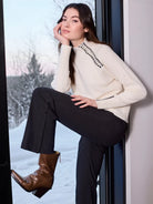 Cozy meets cool in this ecru sweater featuring bold black cross stitching that adds a whimsical twist to your look. The plush fabric invites you to snuggle up while the unique stitch detail and zipper accent keep things fun and fresh. Perfect for turning everyday comfort into a stylish statement.