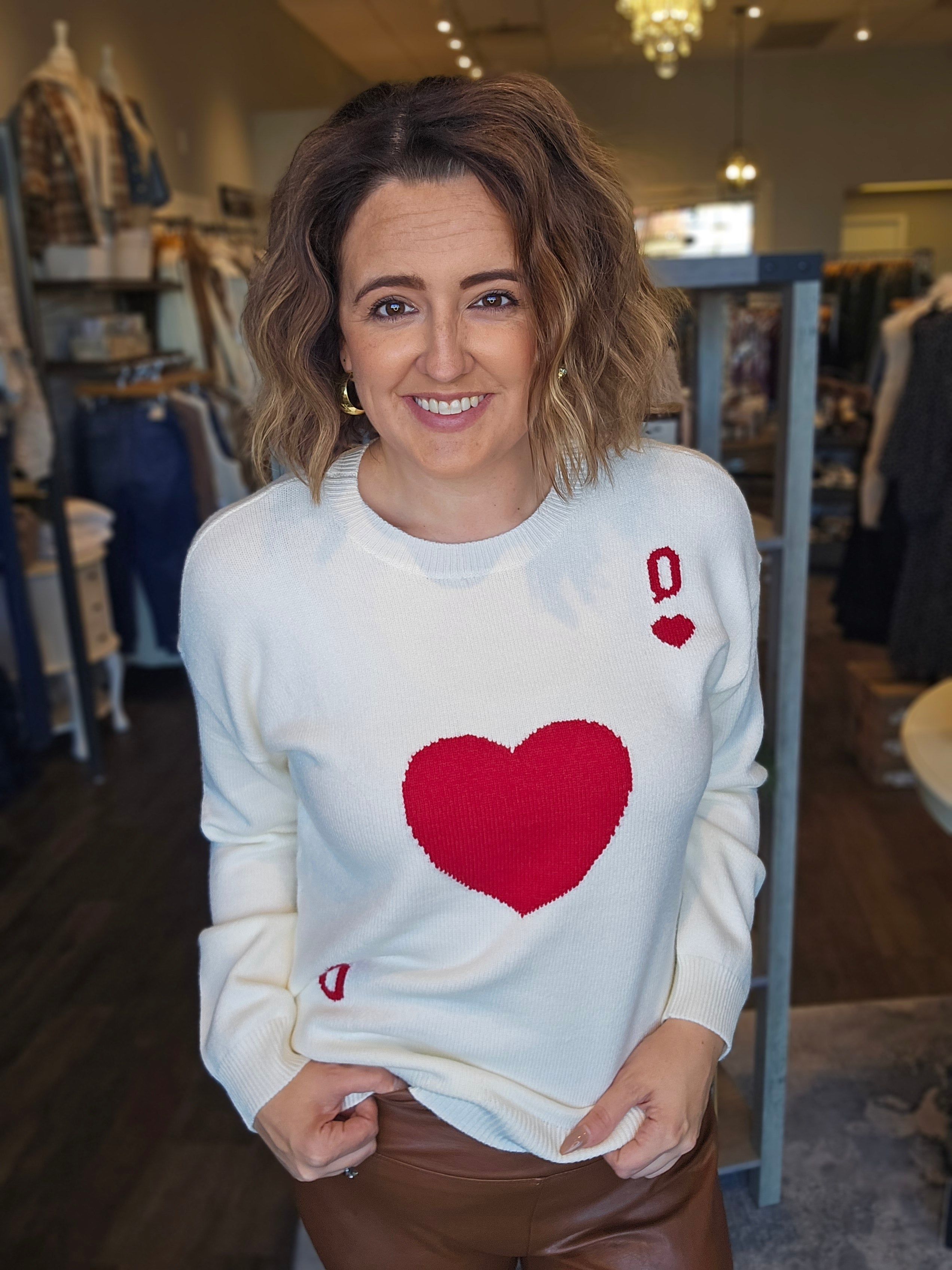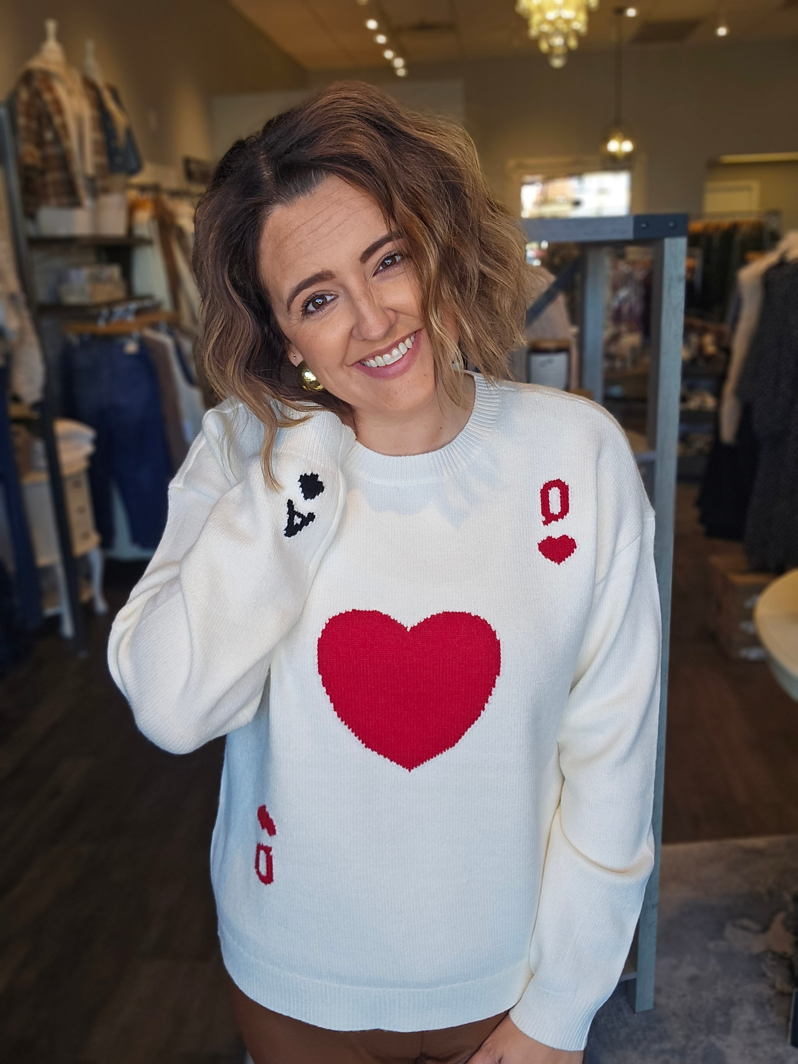 Stand out boldly with the Queen of Hearts Sweater, featuring a striking card motif that commands attention. This daring design combines edgy style with cozy comfort, perfect for those who aren’t afraid to make a confident statement wherever they go.