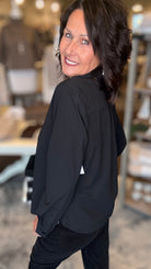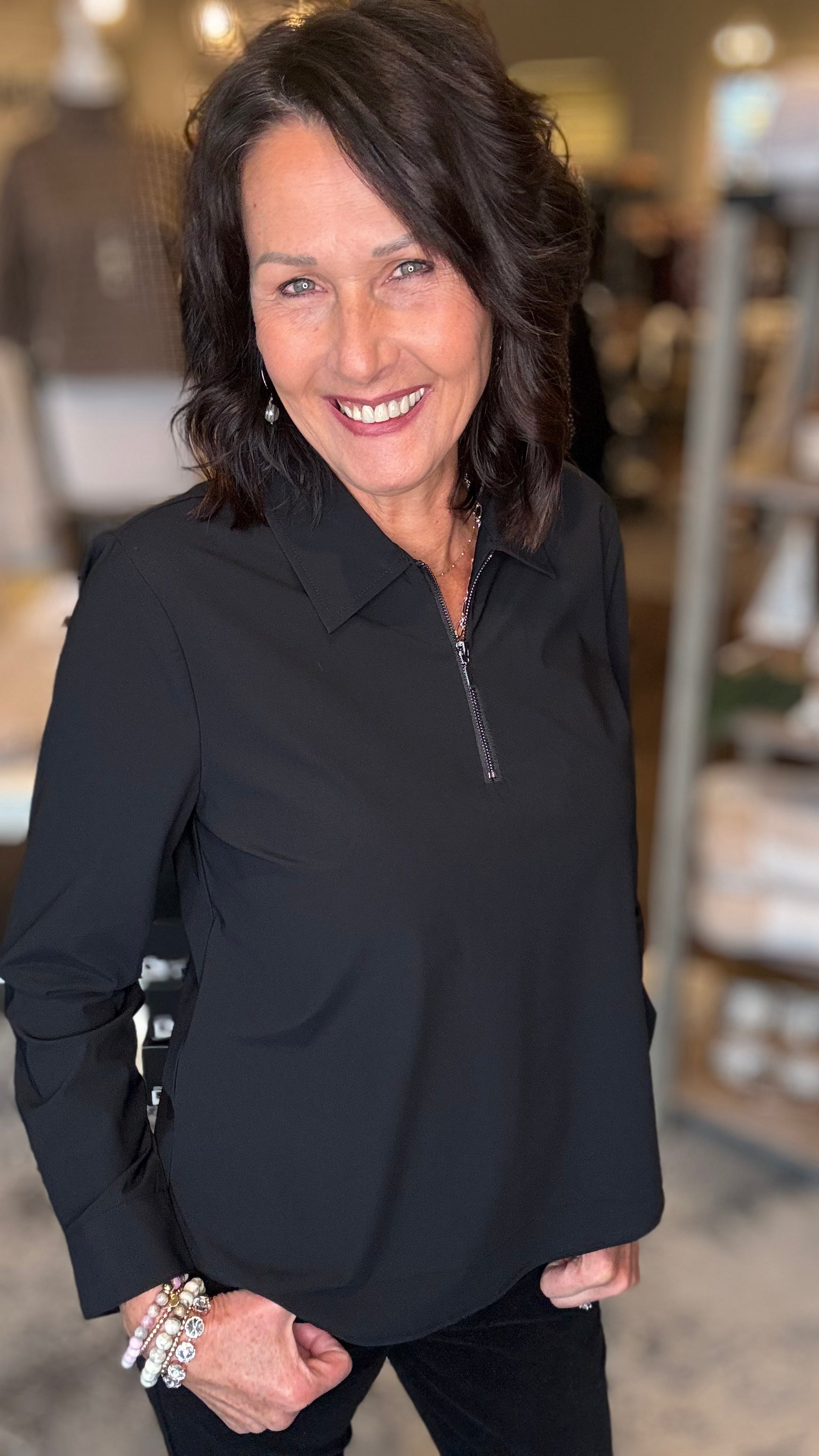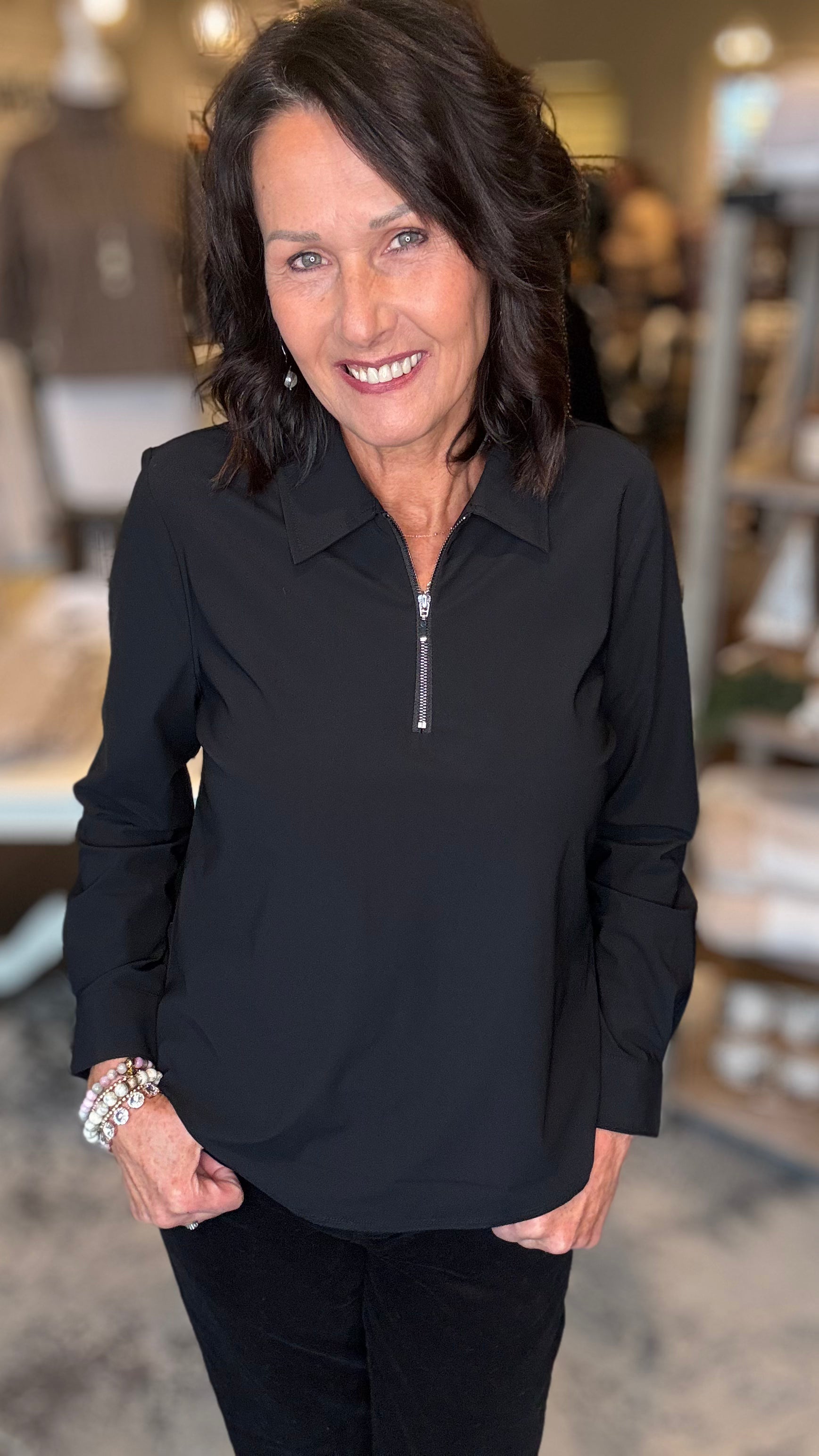 Elevate your wardrobe with this sleek black blouse featuring a sophisticated gunmetal 1/4 zipper and a refined collar. Its minimalist design offers a modern edge while maintaining timeless elegance, making it perfect for both professional settings and stylish evenings out. The high-quality zipper adds subtle detail and effortless functionality to your look.
