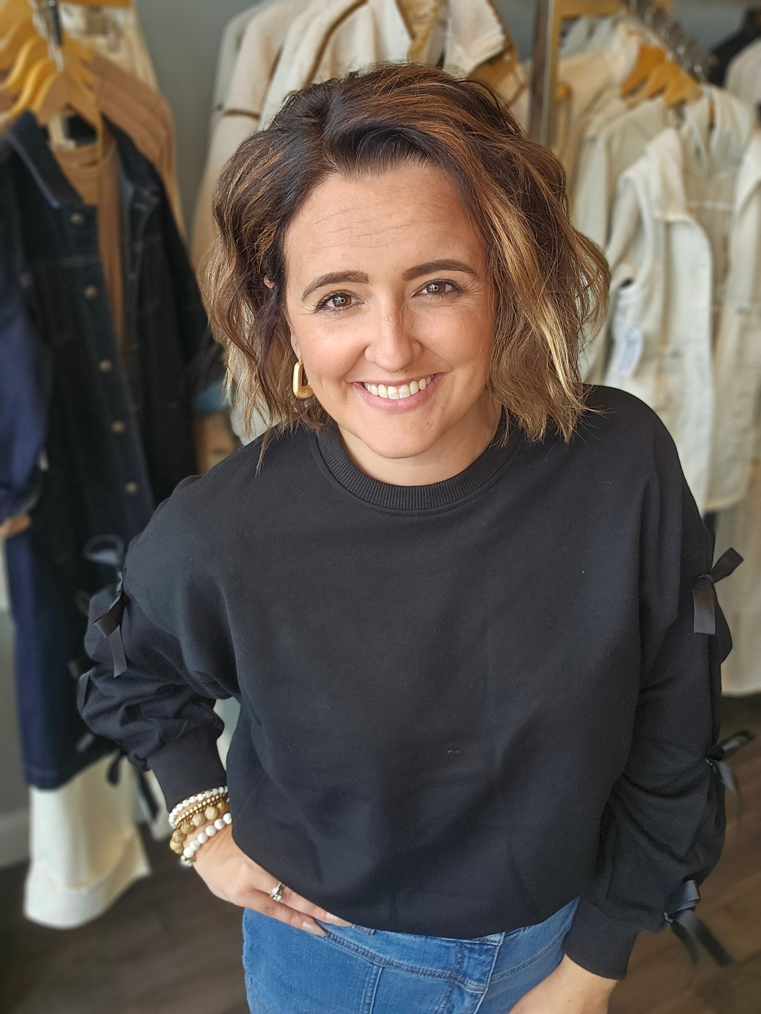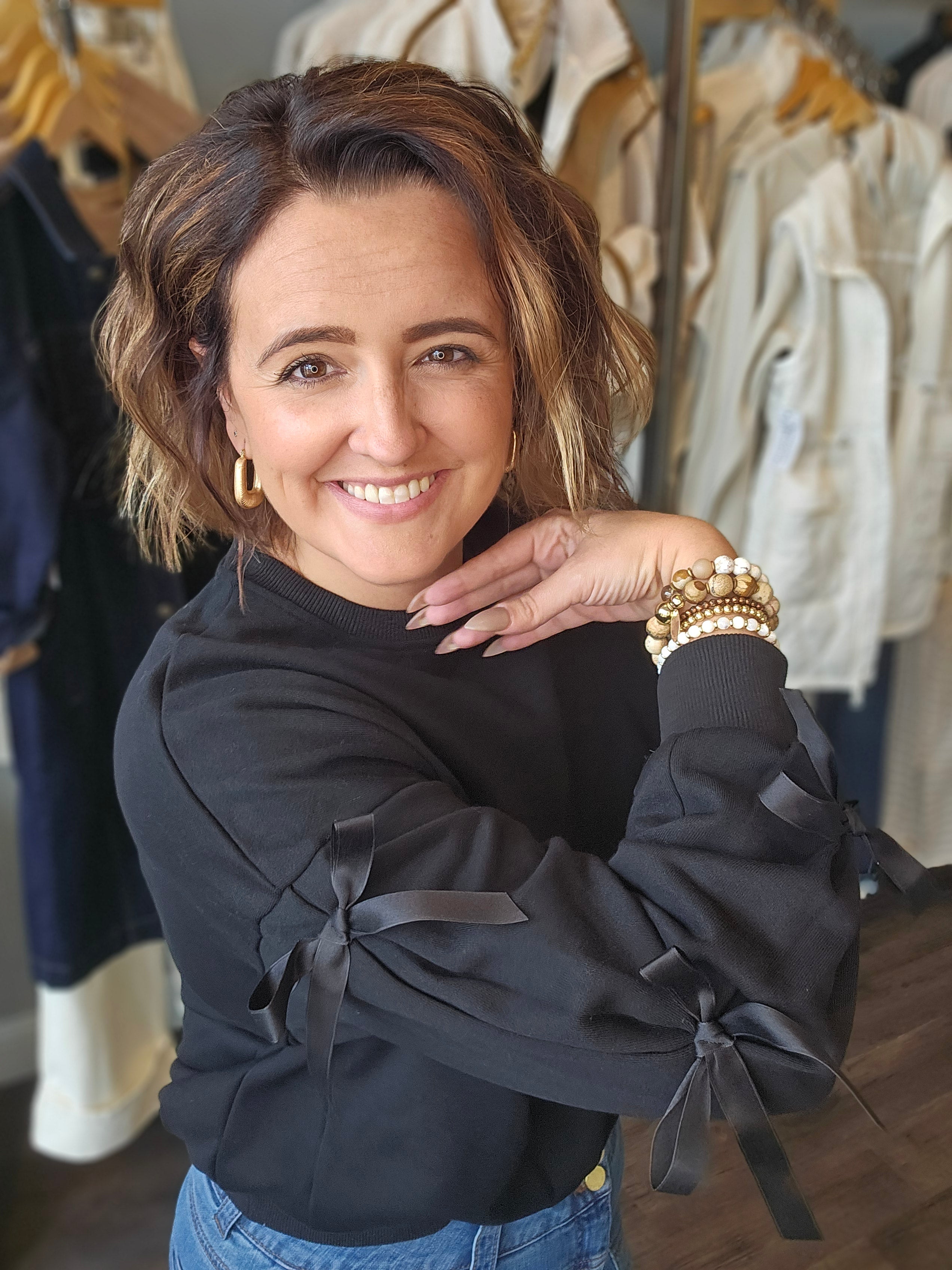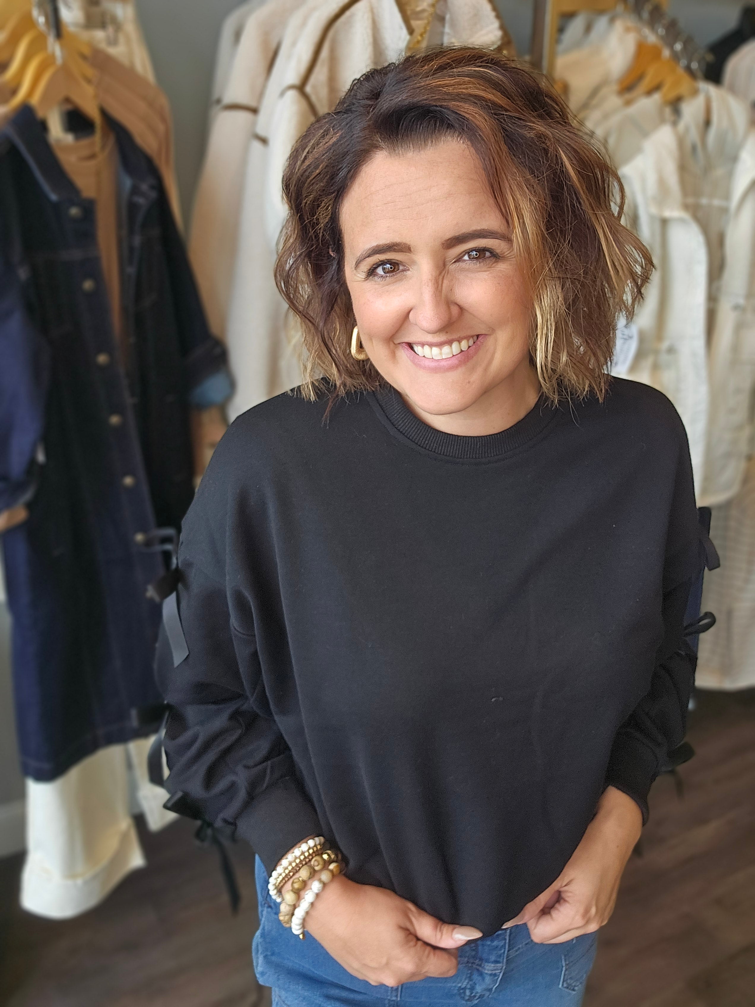 The Bow Sleeve Sweatshirt enhances your everyday look with delicate bows cascading down each arm, creating a feminine and stylish statement. Crafted for comfort and effortless flair, this sweatshirt is perfect for elevating casual outfits with a subtle yet captivating detail. Experience cozy wear that stands out with charm and elegance.