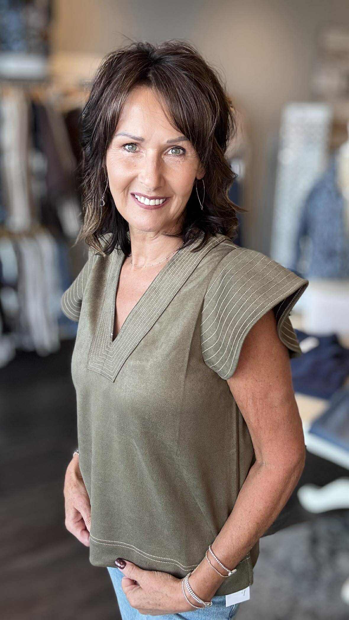 Add a touch of fun to your wardrobe with this army green suede top. Its dreamy flutter sleeves and flattering V-neck create a playful, breezy vibe that's perfect for casual outings or relaxed evenings. Soft suede feels luxurious while the unique sleeve design lets you move with effortless style.