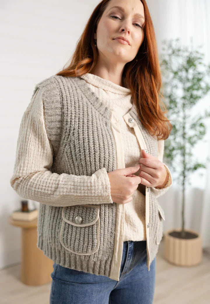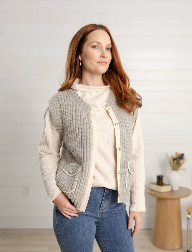 Elevate your wardrobe with the MB Sleeveless Knit Vest, elegantly designed with contrast piping along the pockets and placket. This refined detail adds subtle sophistication, enhancing the vest’s clean lines while offering practical pockets for convenience. Perfect for layering, it blends comfort with a polished look ideal for any occasion.