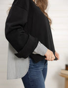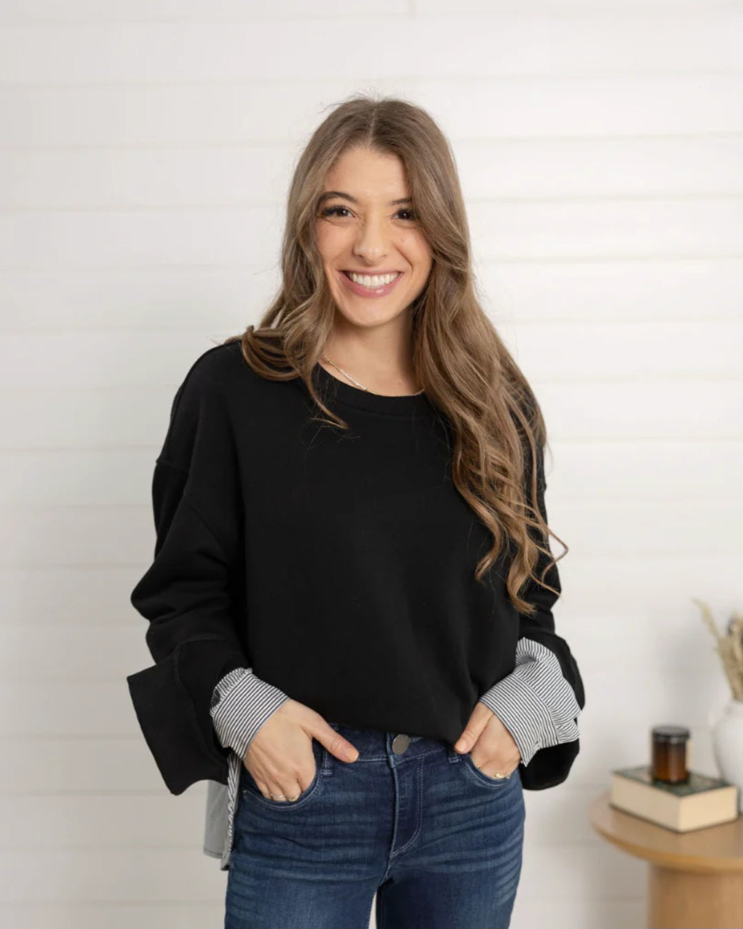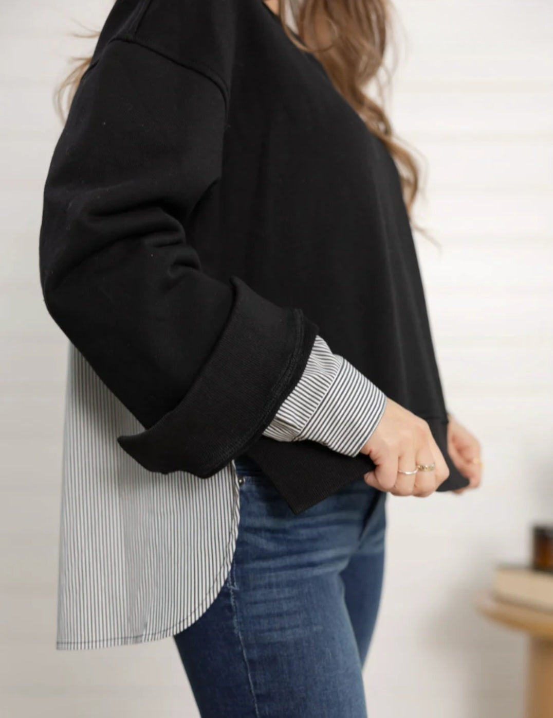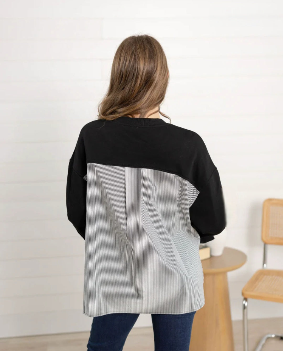Elevate your wardrobe with this sophisticated mixed media black top, featuring a sleek black stripe detail that adds subtle texture and depth. Its refined design blends classic elegance with modern style, making it perfect for both professional settings and chic casual outings. Experience comfort and versatility in one timeless piece.