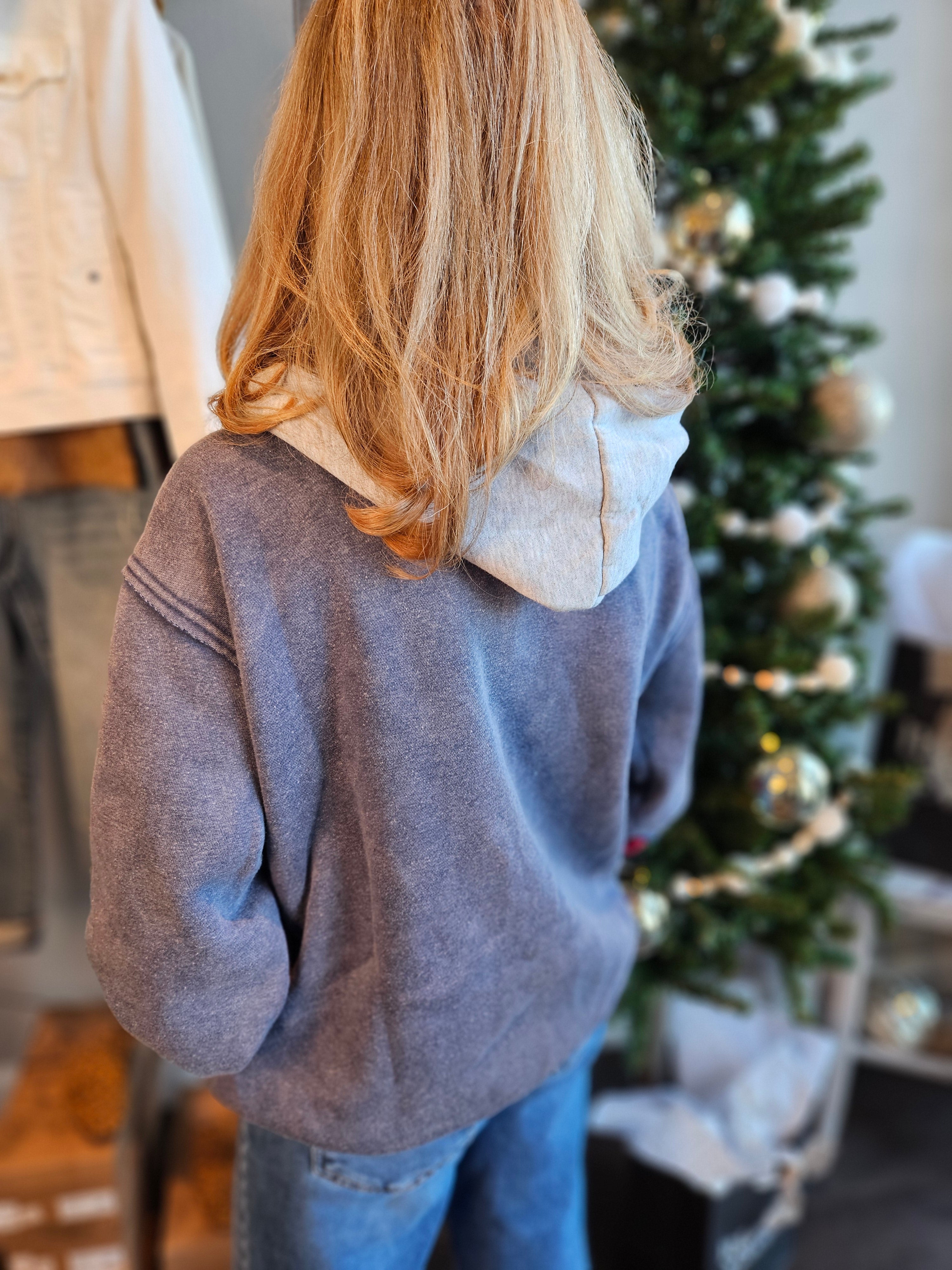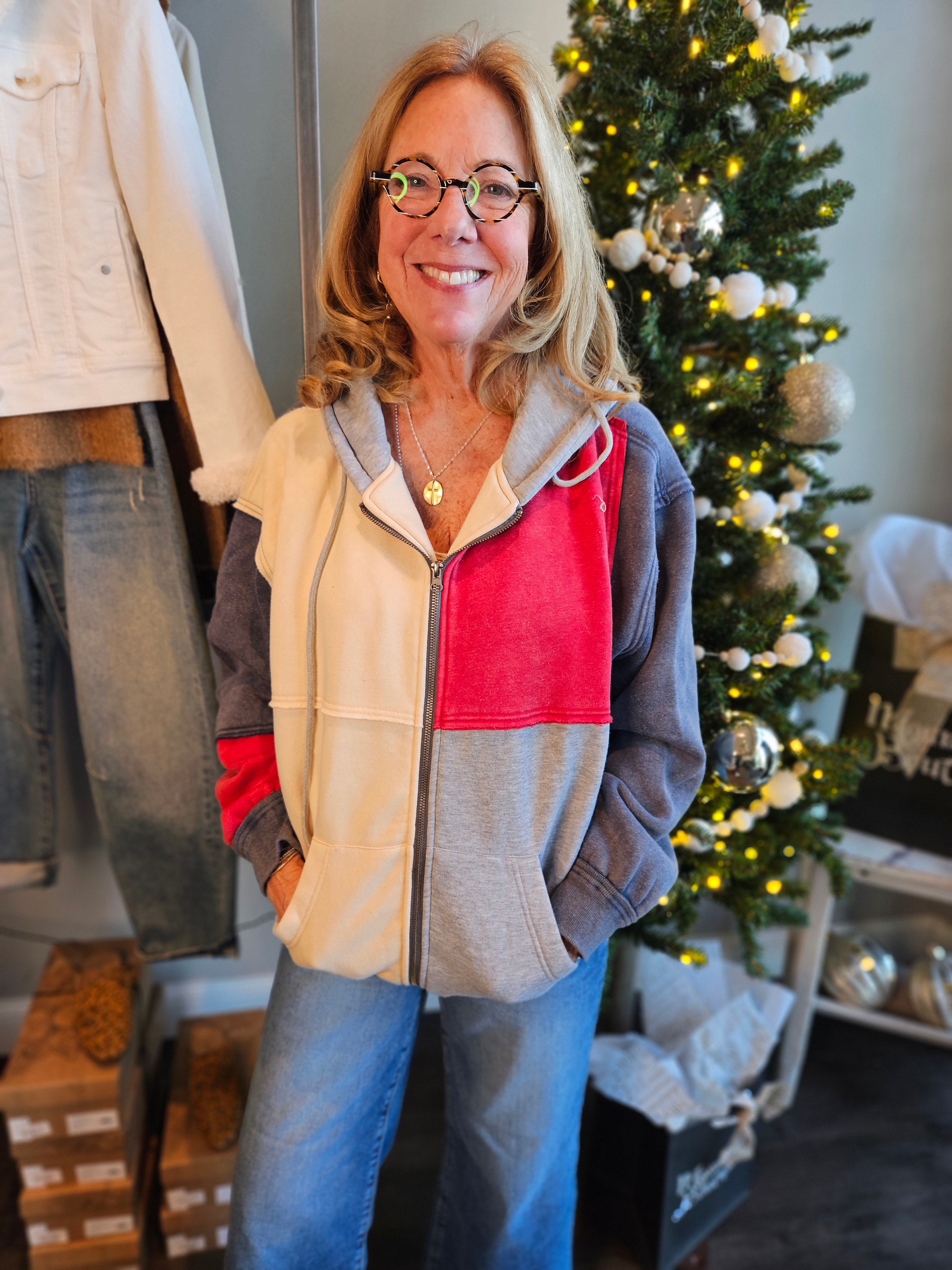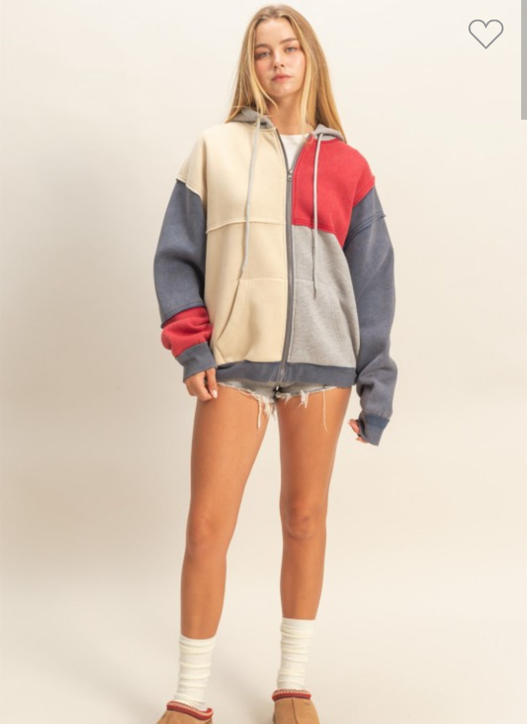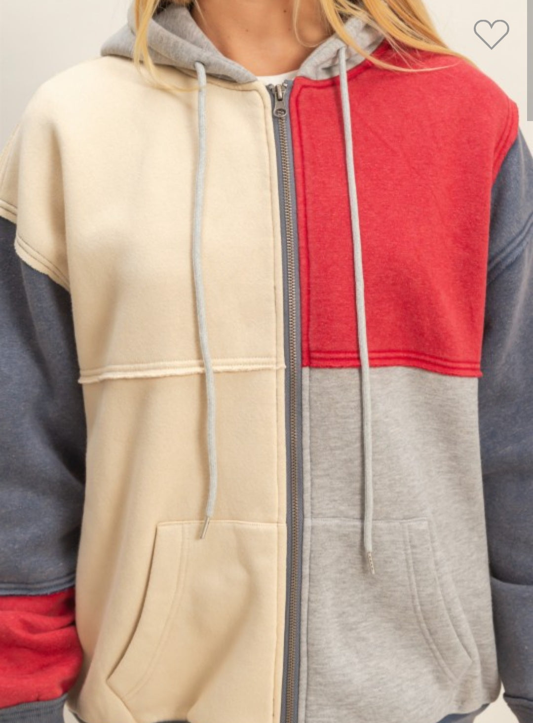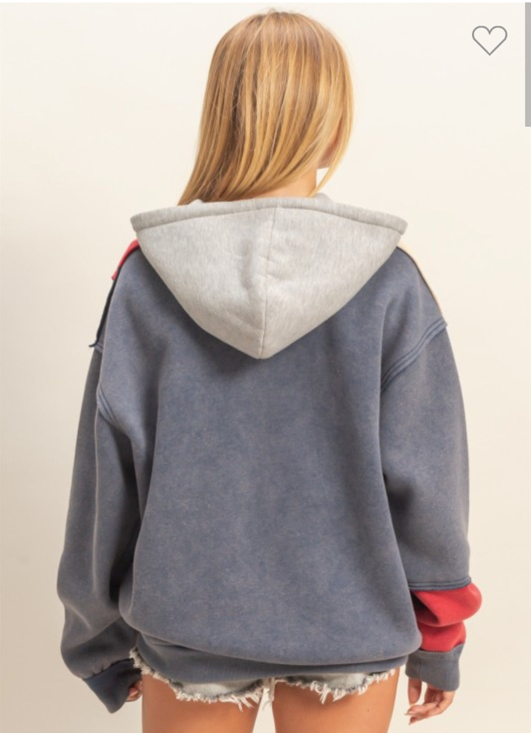 Layer up in style with this navy color block sweatshirt—the perfect blend of comfort and cool. Featuring a full zip front for easy on-and-off, practical pockets to stash your essentials, and a cozy hood to keep you warm, this piece is ready for everything from casual hangouts to outdoor adventures. The color-blocked design adds visual interest while keeping things effortlessly chic.