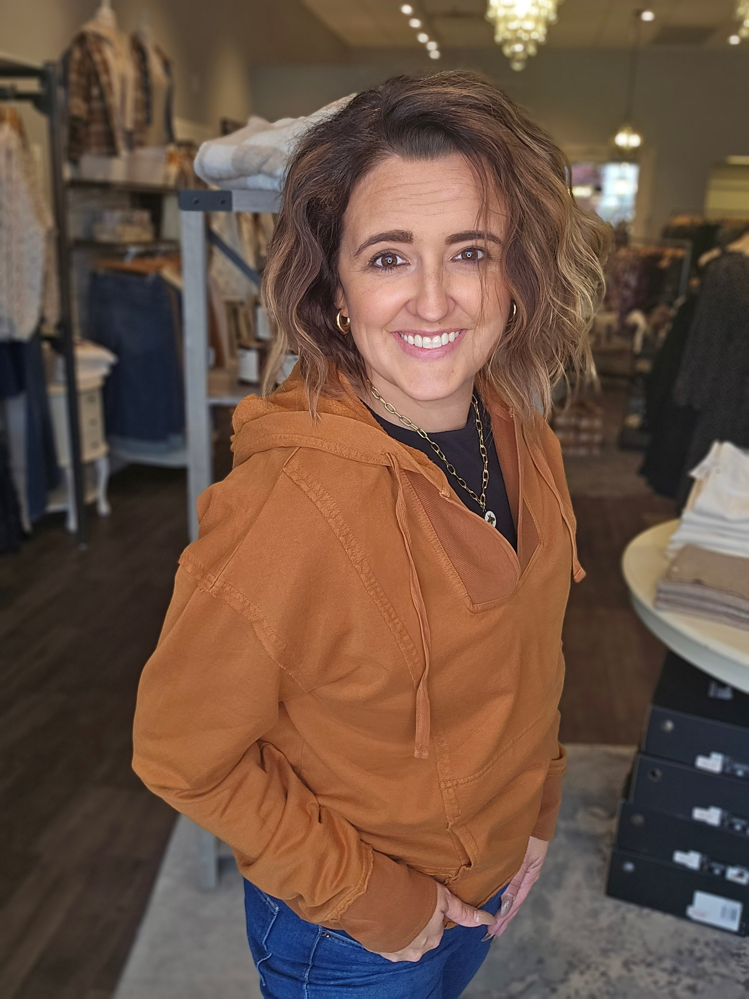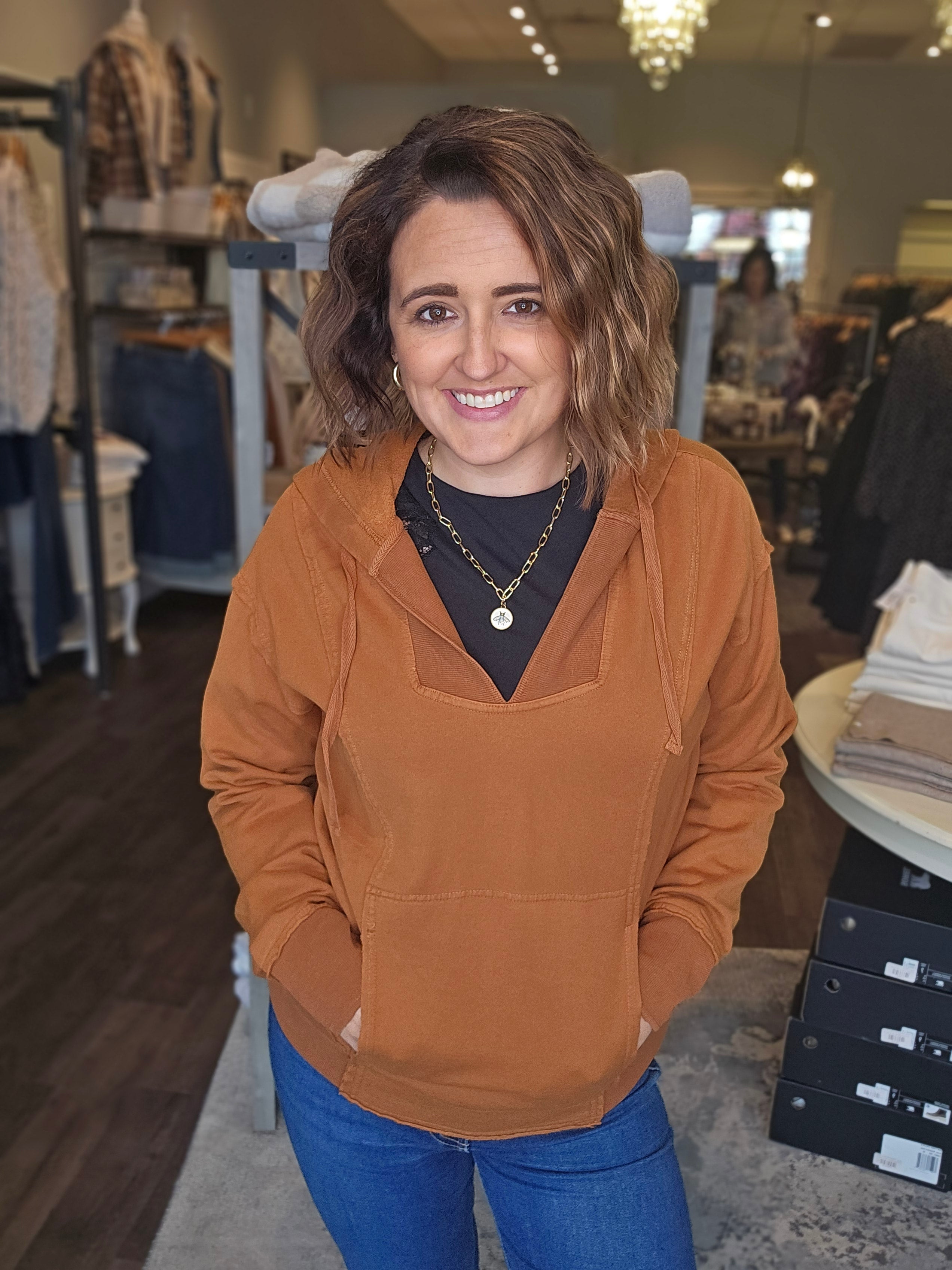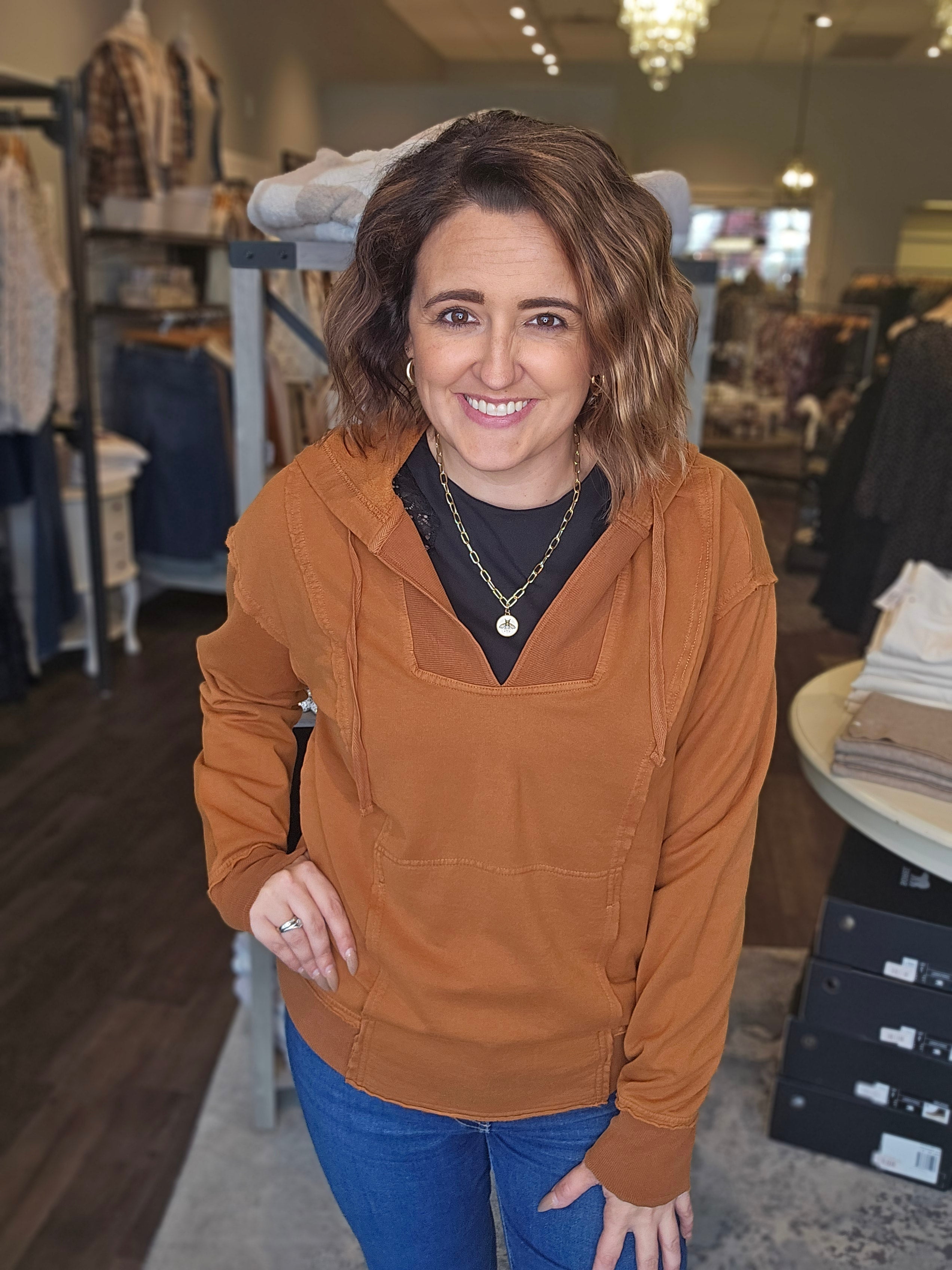 Cozy up in the Rosalyn Rust Hooded Long Sleeve Top, your new go-to for laid-back days. This playful top features a warm rust color, a comfy hood, and a handy front kangaroo pocket—perfect for keeping your hands warm or stashing little treasures. Soft, casual, and effortlessly cool, it’s the ultimate mix of comfort and style.