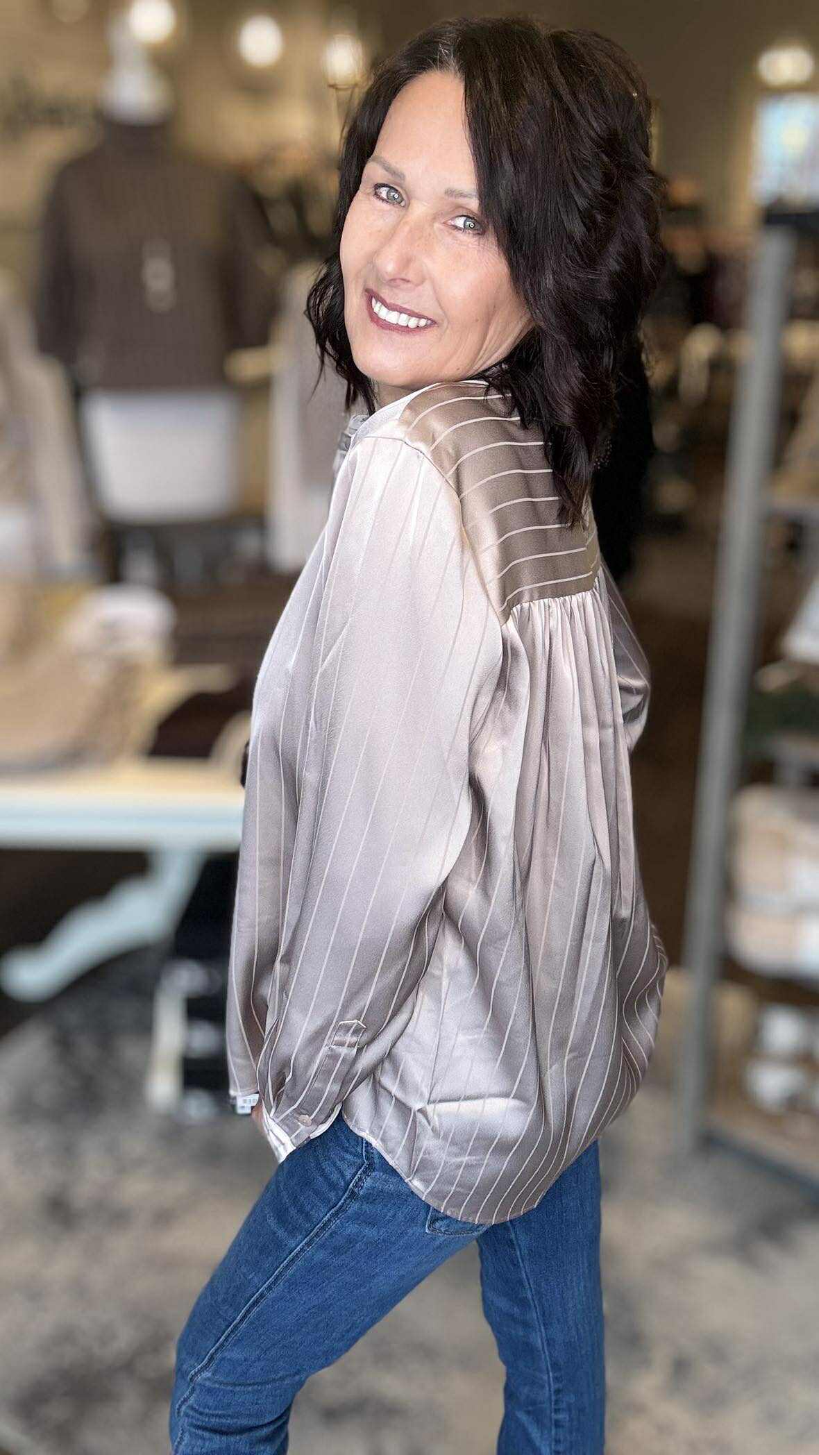 Elevate your wardrobe with this Satin Striped Oversized Blouse in a dreamy mocha shade. Featuring a subtle soft mocha stripe, its silky smooth fabric drapes effortlessly for a look that’s both relaxed and refined. Perfect for turning casual days into stylish adventures, this playful blouse adds a touch of cozy chic to any outfit.