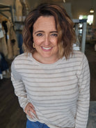 Cozy meets cool in this crew neck striped sweater, featuring a super soft oatmeal base with a playful mocha stripe. Perfect for layering or wearing solo, it adds a touch of effortless style and comfort to any outfit. Wrap yourself in warmth and fun all season long!