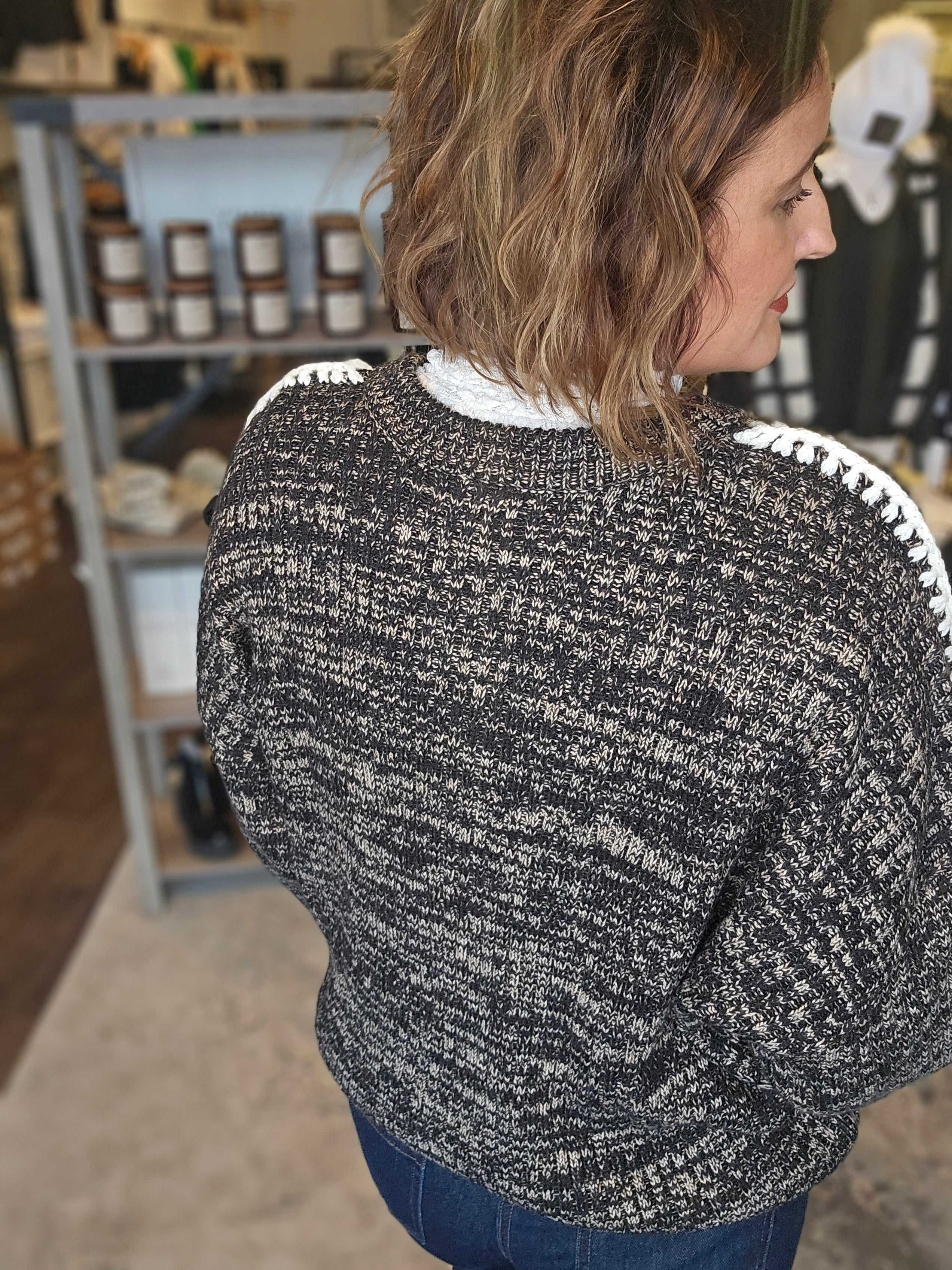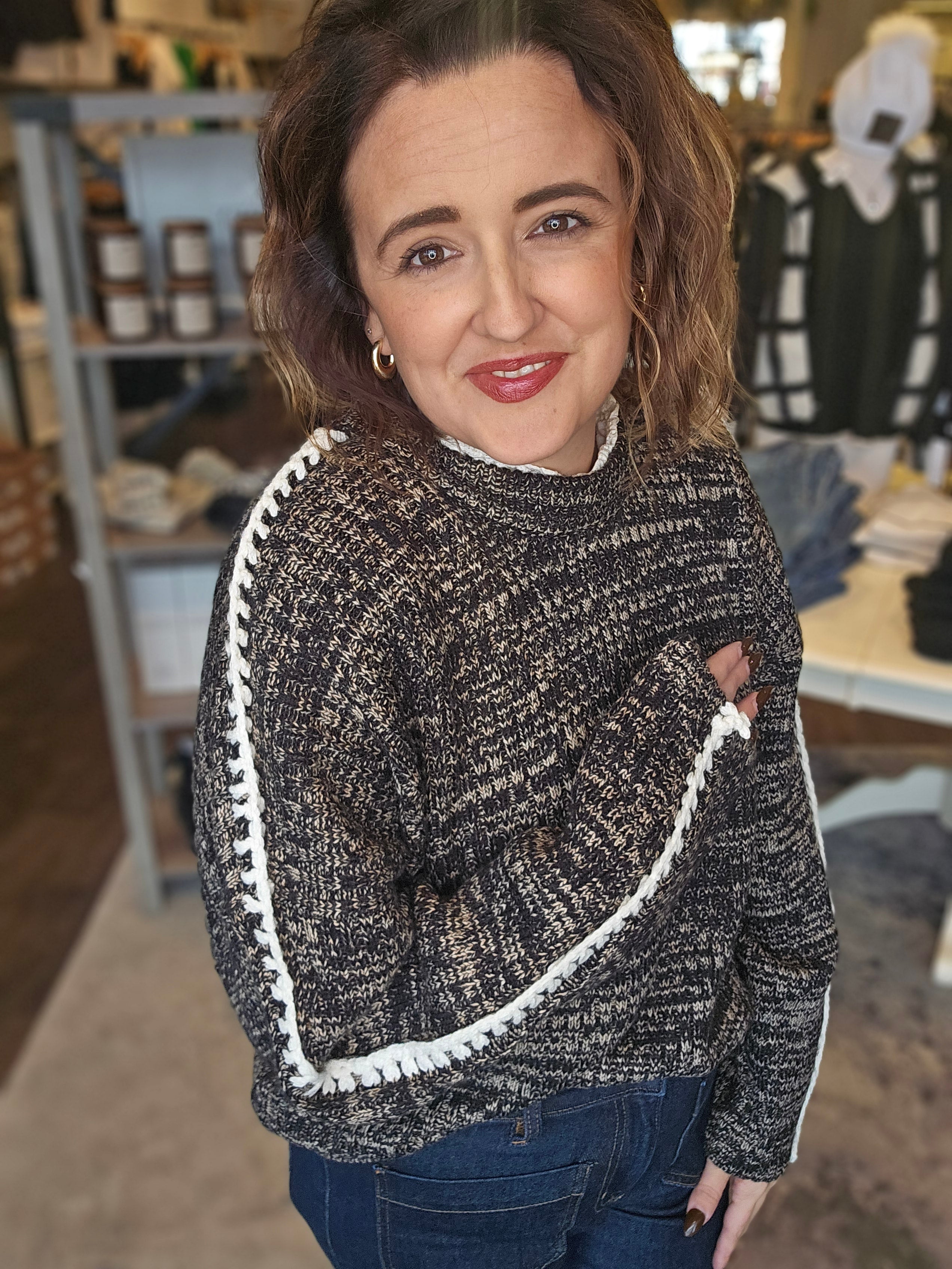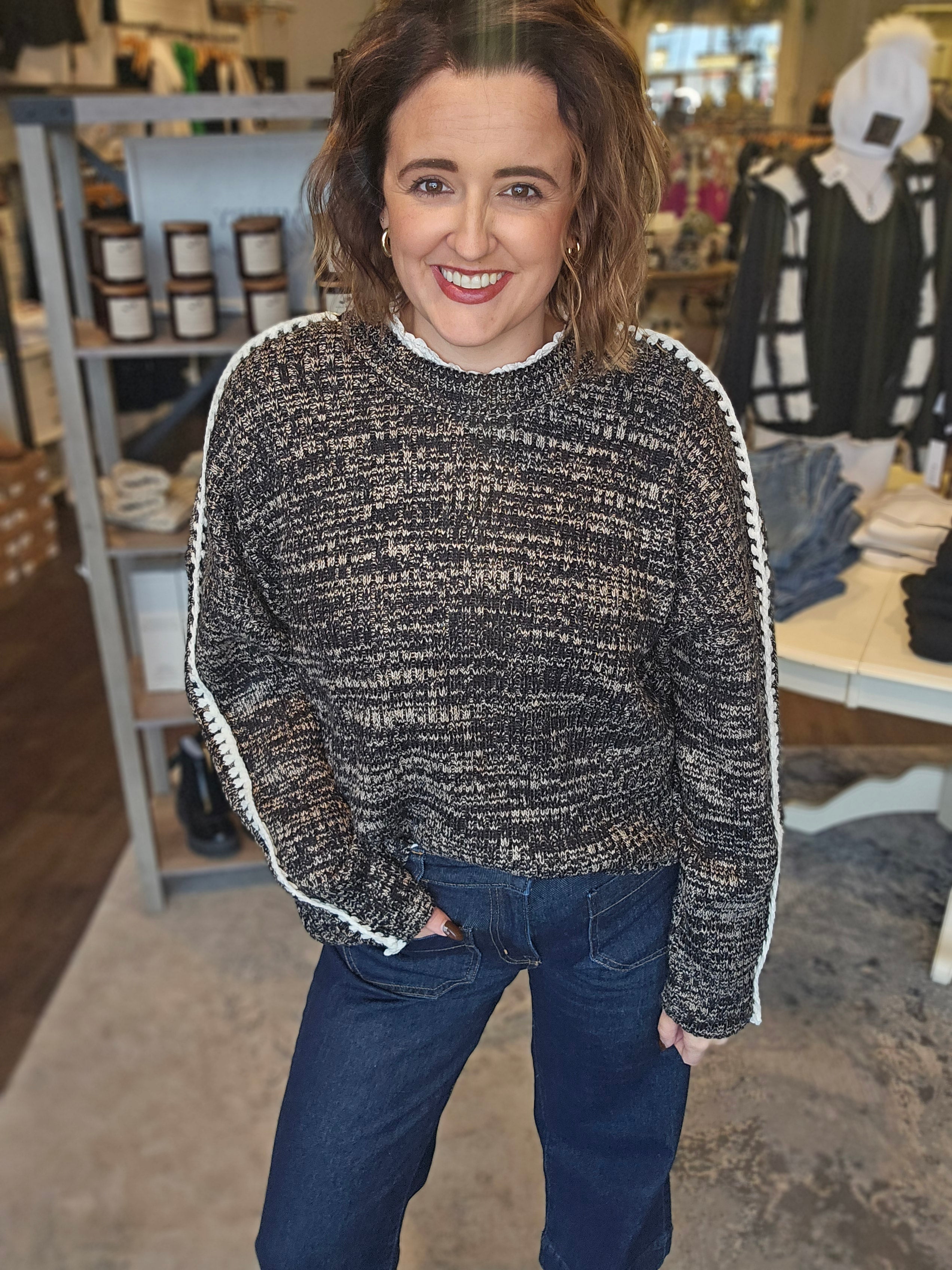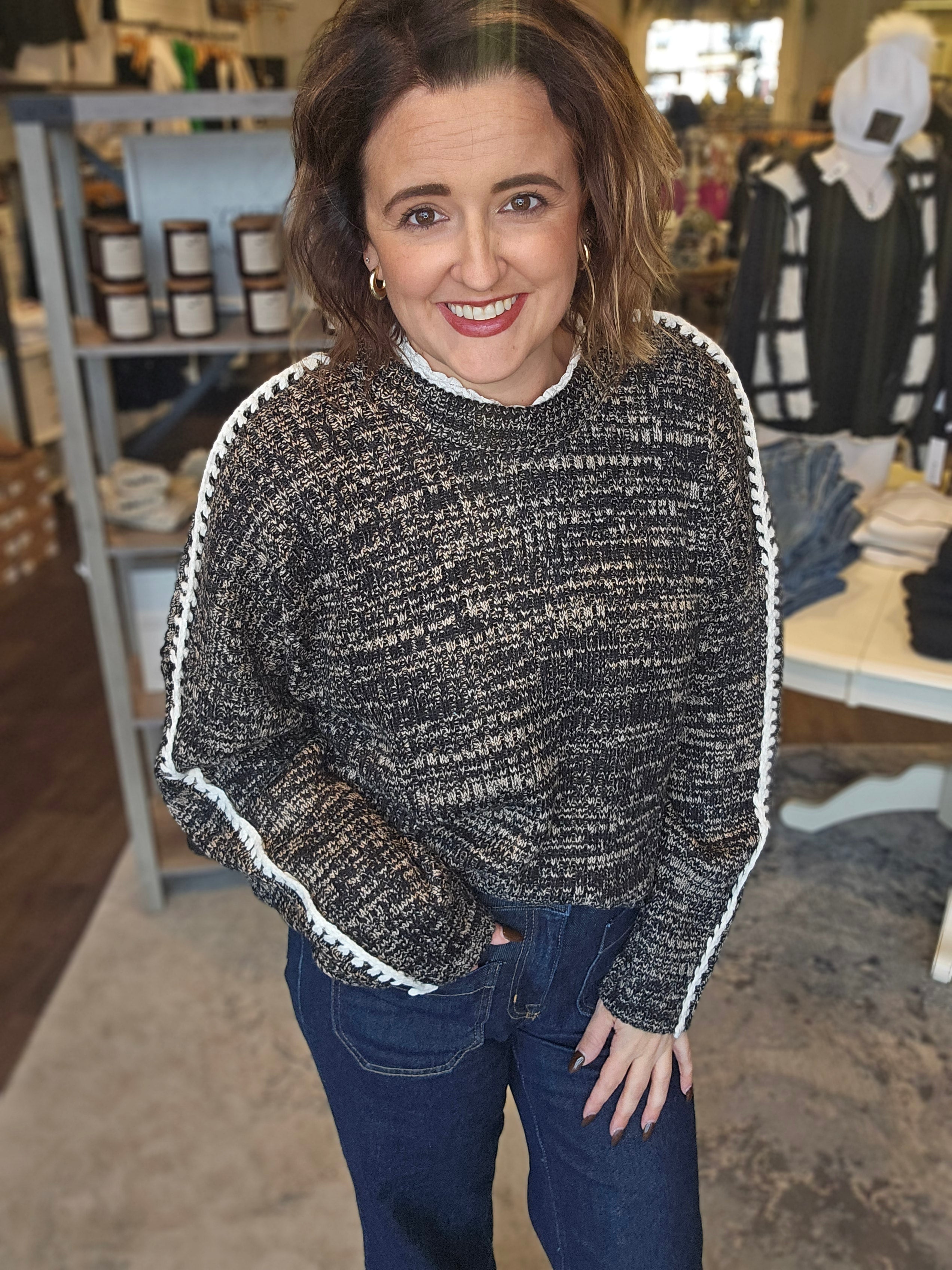 Get ready to turn heads in this Crewneck Blanket Sweater, crafted from a luxe black and white knit that's as fun as it is functional. Crisp white piping traces down each sleeve, adding a sharp contrast that elevates your everyday look. Perfect for those days when you want to feel put-together without trying too hard—throw it on and own the room. Cozy never looked this good.