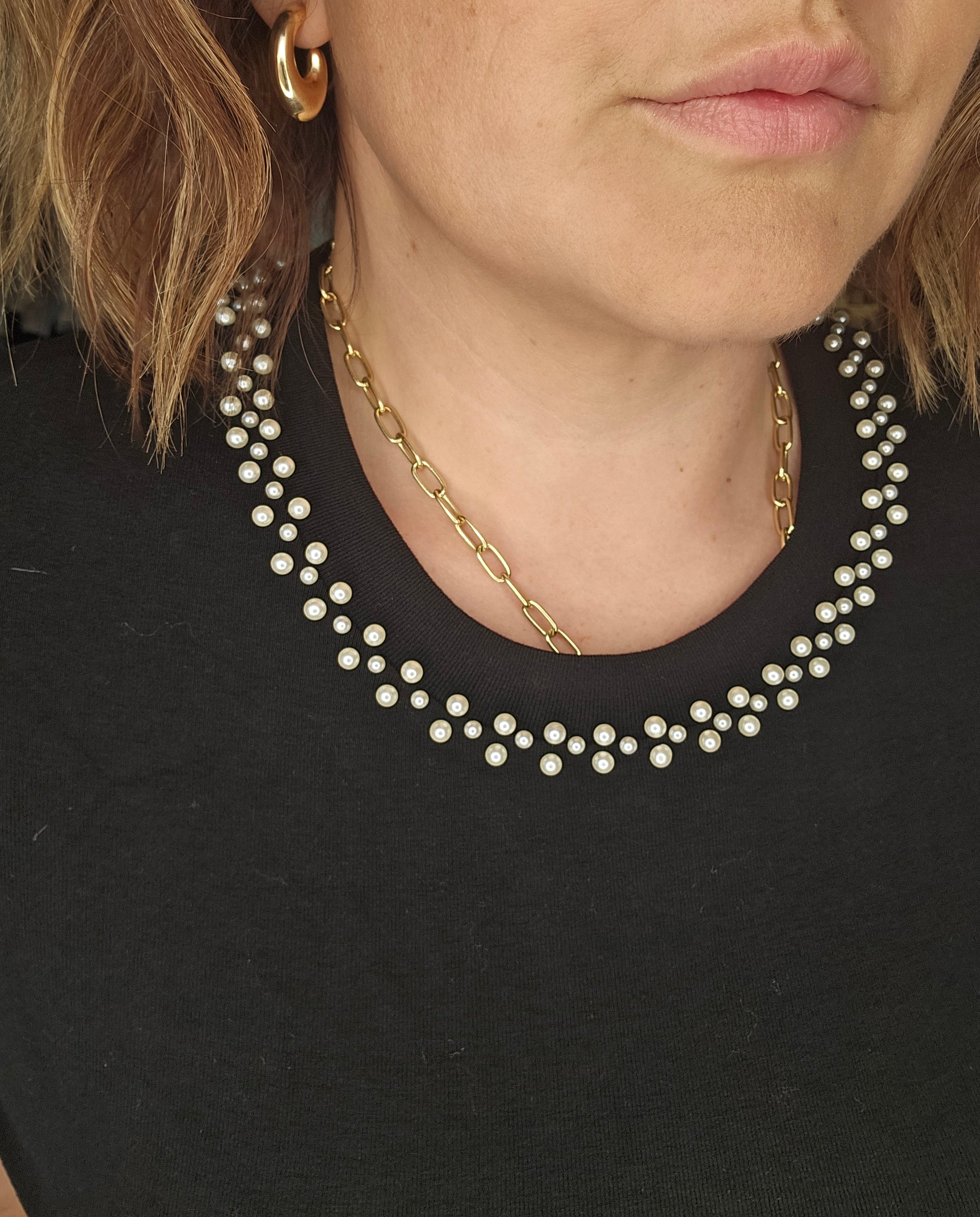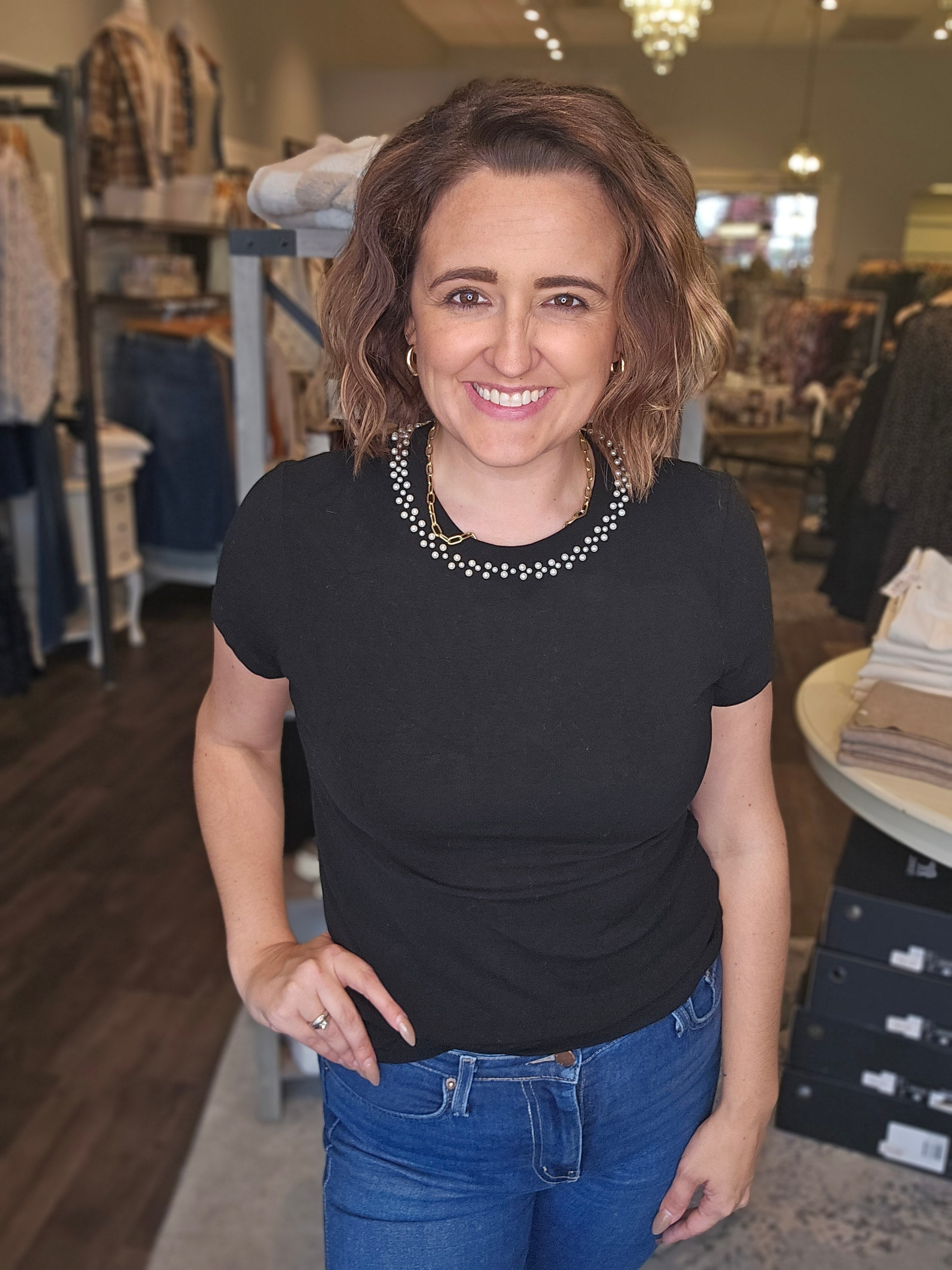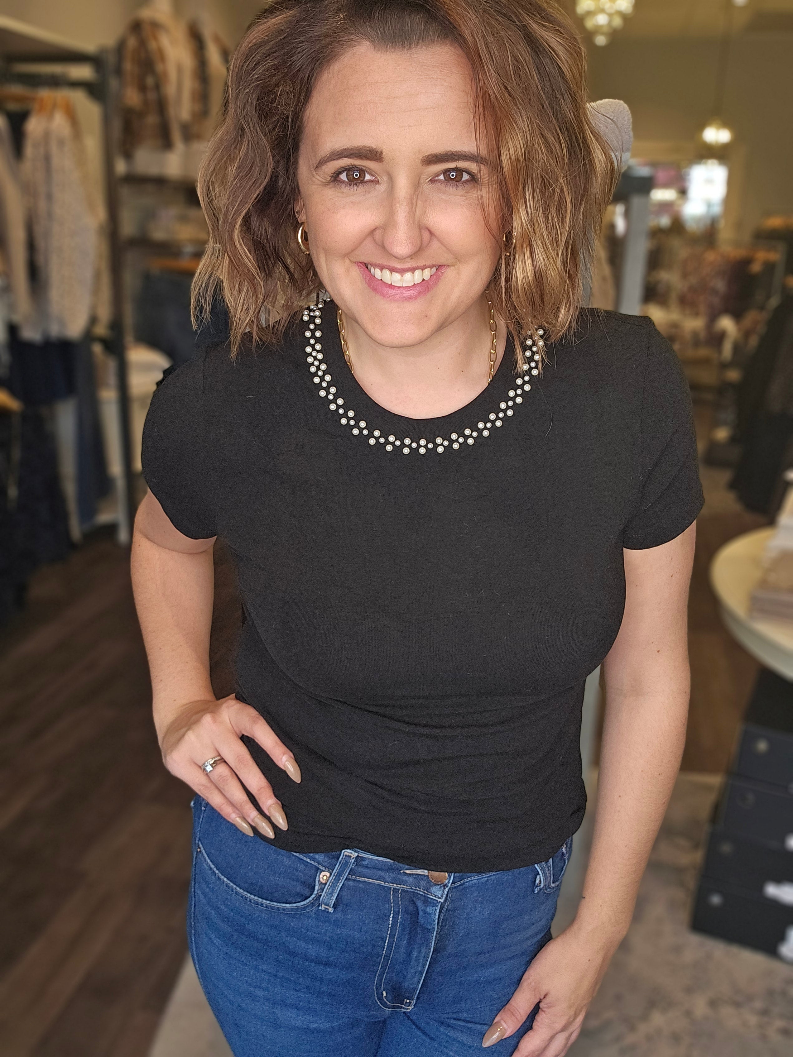 This elegant black knit tee features a refined white pearl detail delicately arranged around the collar, adding a touch of sophistication to a classic silhouette. Its soft knit fabric ensures comfort while the pearl accents elevate your everyday look, making it perfect for both casual and upscale occasions.