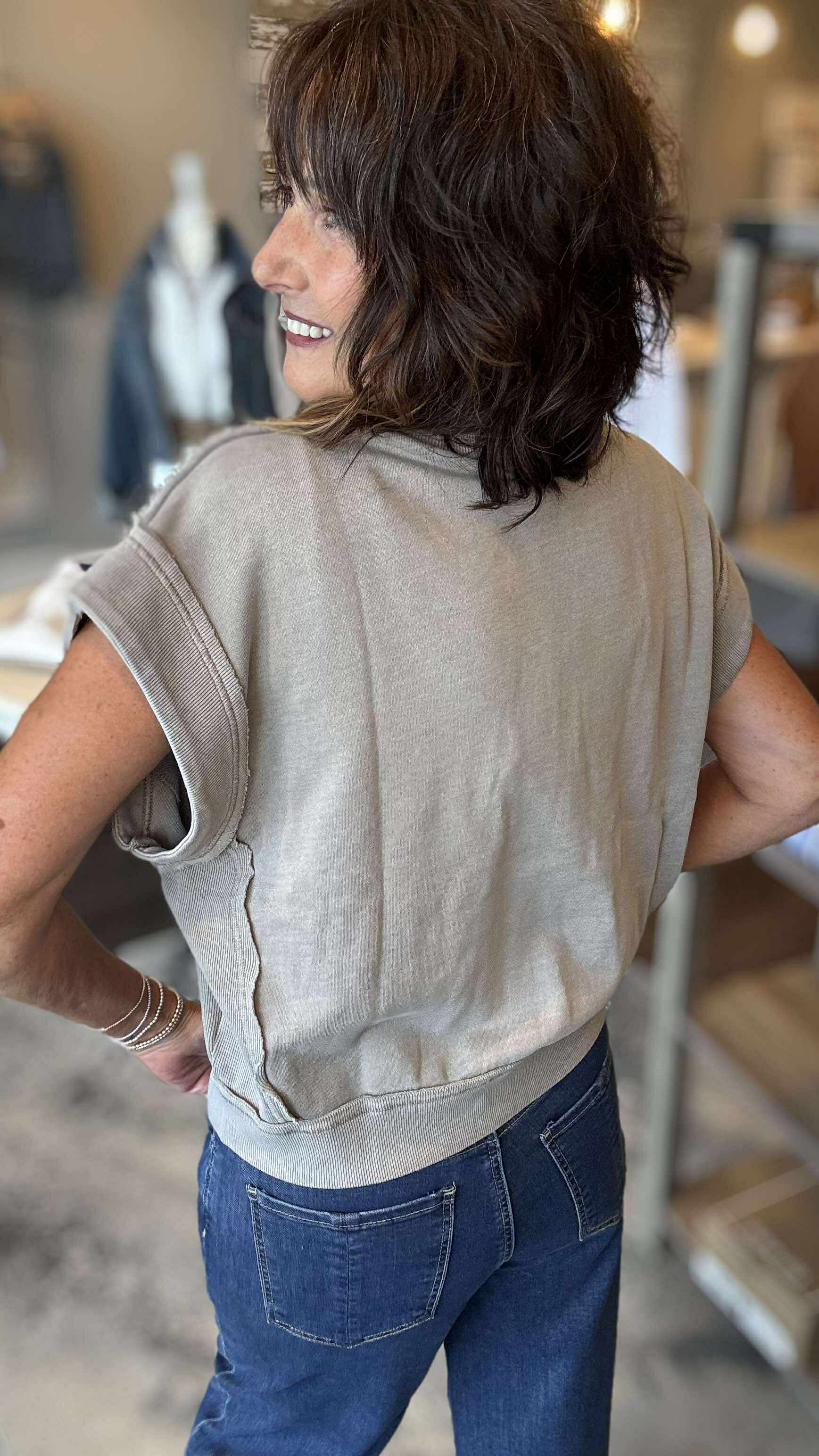 Make a statement with the Ainsley Zip-up Vest in heather grey. Its boxy fit and striking ribbed trim detail create a bold, modern silhouette that commands attention. Perfect for layering, this vest blends edgy style with effortless comfort for a fearless look.