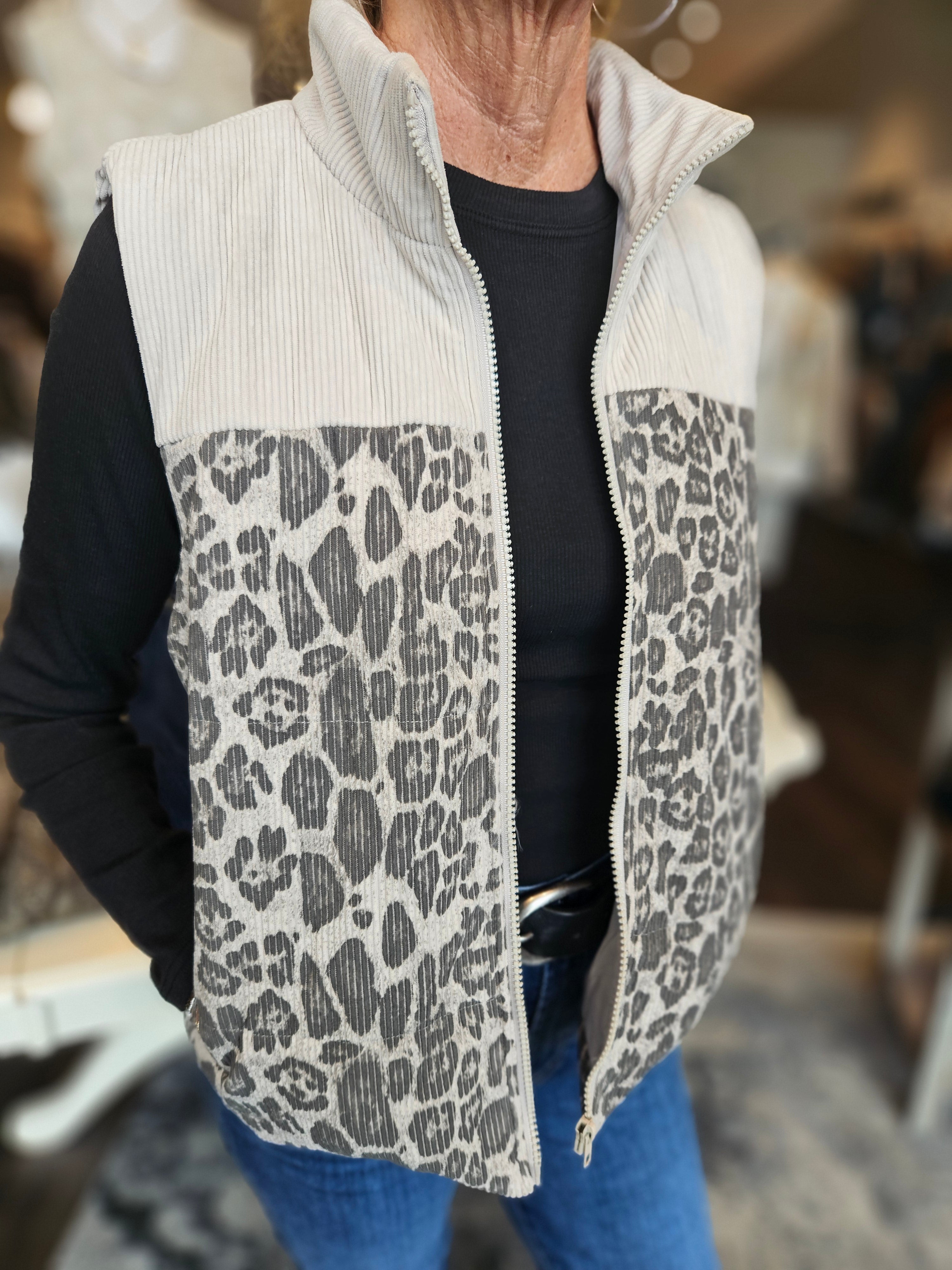 Embrace bold style with this grey-toned animal print vest, designed to zip up for a sleek, tailored fit. Its daring pattern adds an edge to any outfit, making it a striking statement piece that commands attention while keeping you comfortably warm. Perfect for those who aren't afraid to stand out.