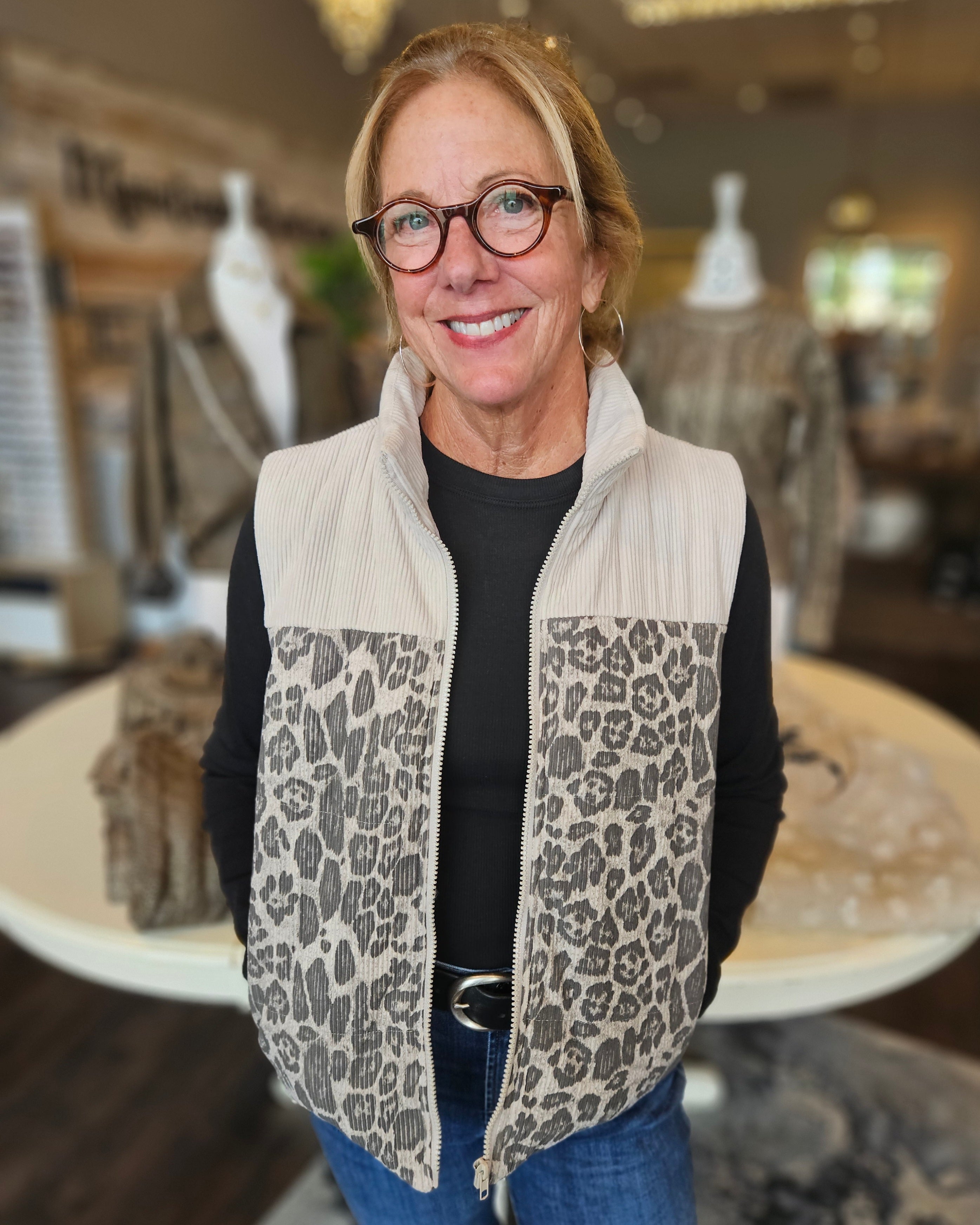 Add a fun twist to your wardrobe with this zip-up sleeveless vest crafted from soft corduroy in a playful grey-tone animal print. Its unique texture and bold pattern bring lively charm to any look, making it an effortless way to express your personality while staying cozy and stylish.