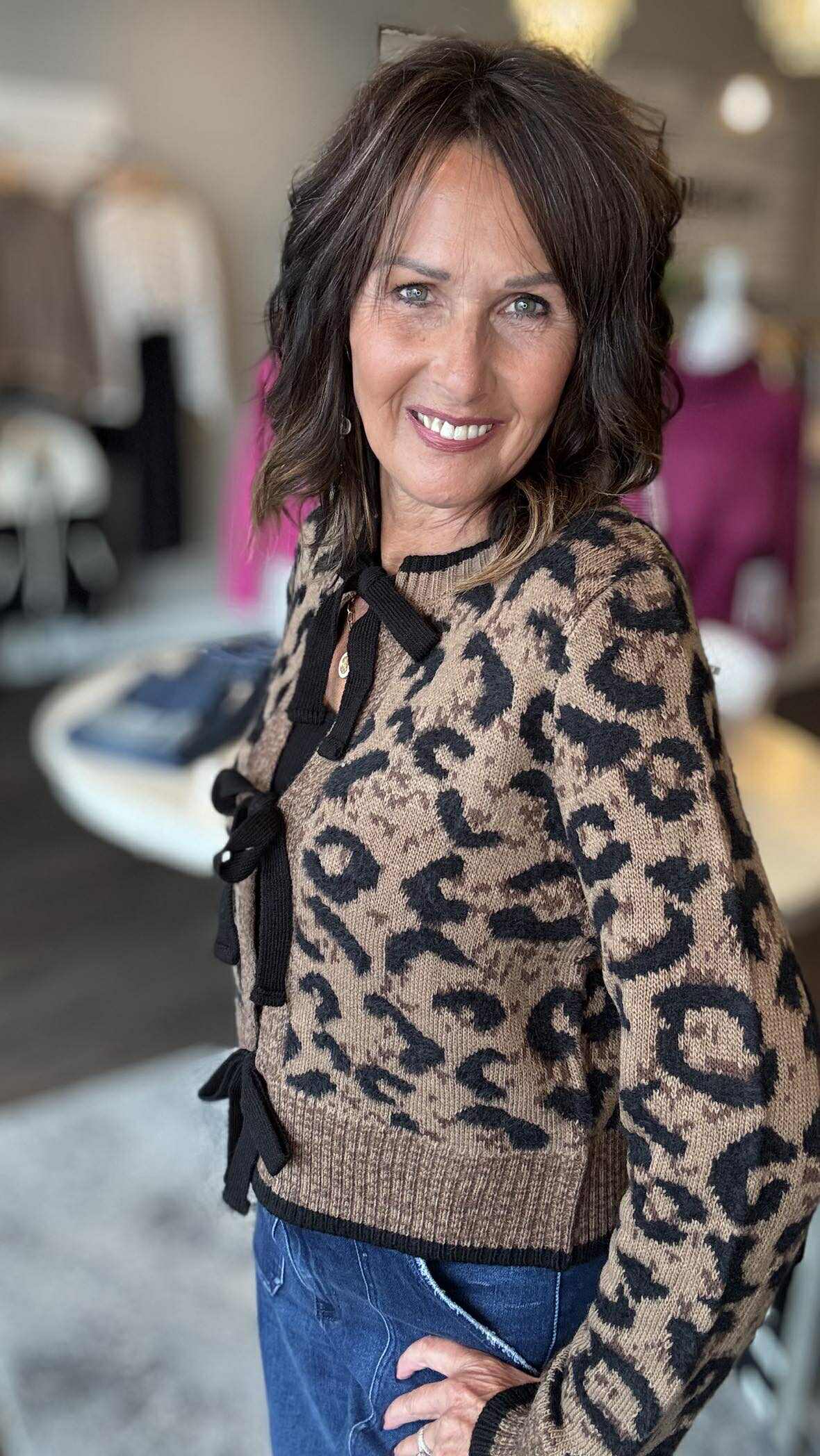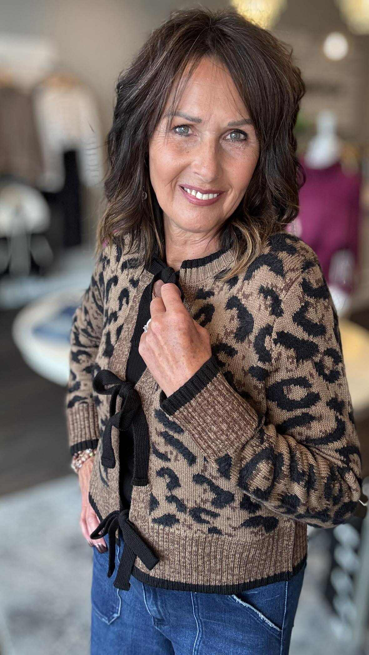 Elevate your style with the Bow Tie Front Jacquard Cardigan—a bold blend of intricate jacquard patterns and a striking bow tie detail at the front. This daring piece redefines classic layering, adding a confident edge to any outfit while offering comfort and sophistication. Perfect for those who make fashion a fearless statement.
