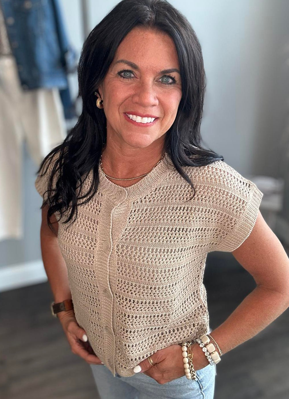 Stay cool and stylish with the Brisa linen mesh sleeveless cardi! Its breathable mesh fabric and lightweight linen blend make it perfect for layering on sunny days. Effortlessly chic and playful, this cardi adds a breezy touch to any outfit while keeping you comfortable all day long.