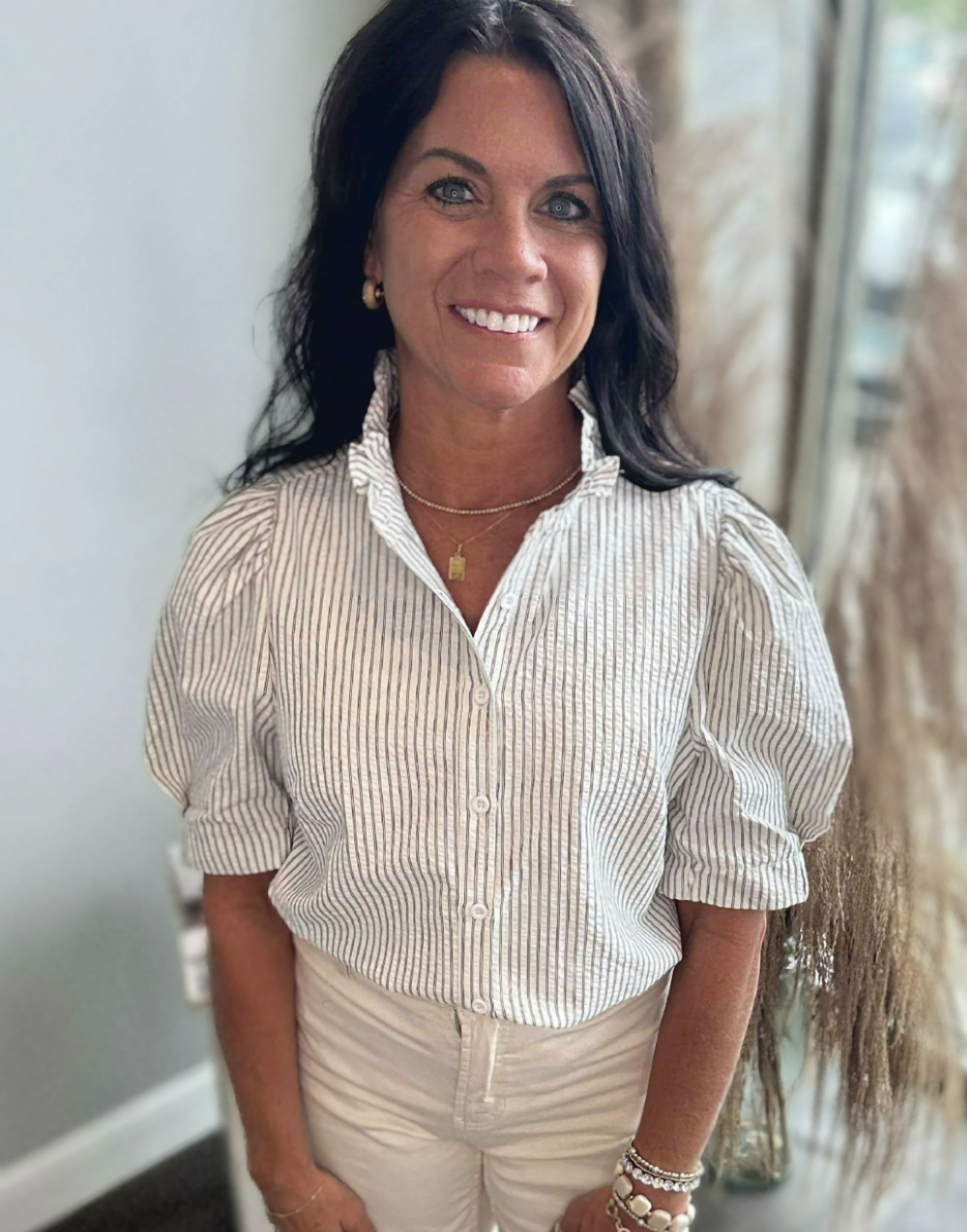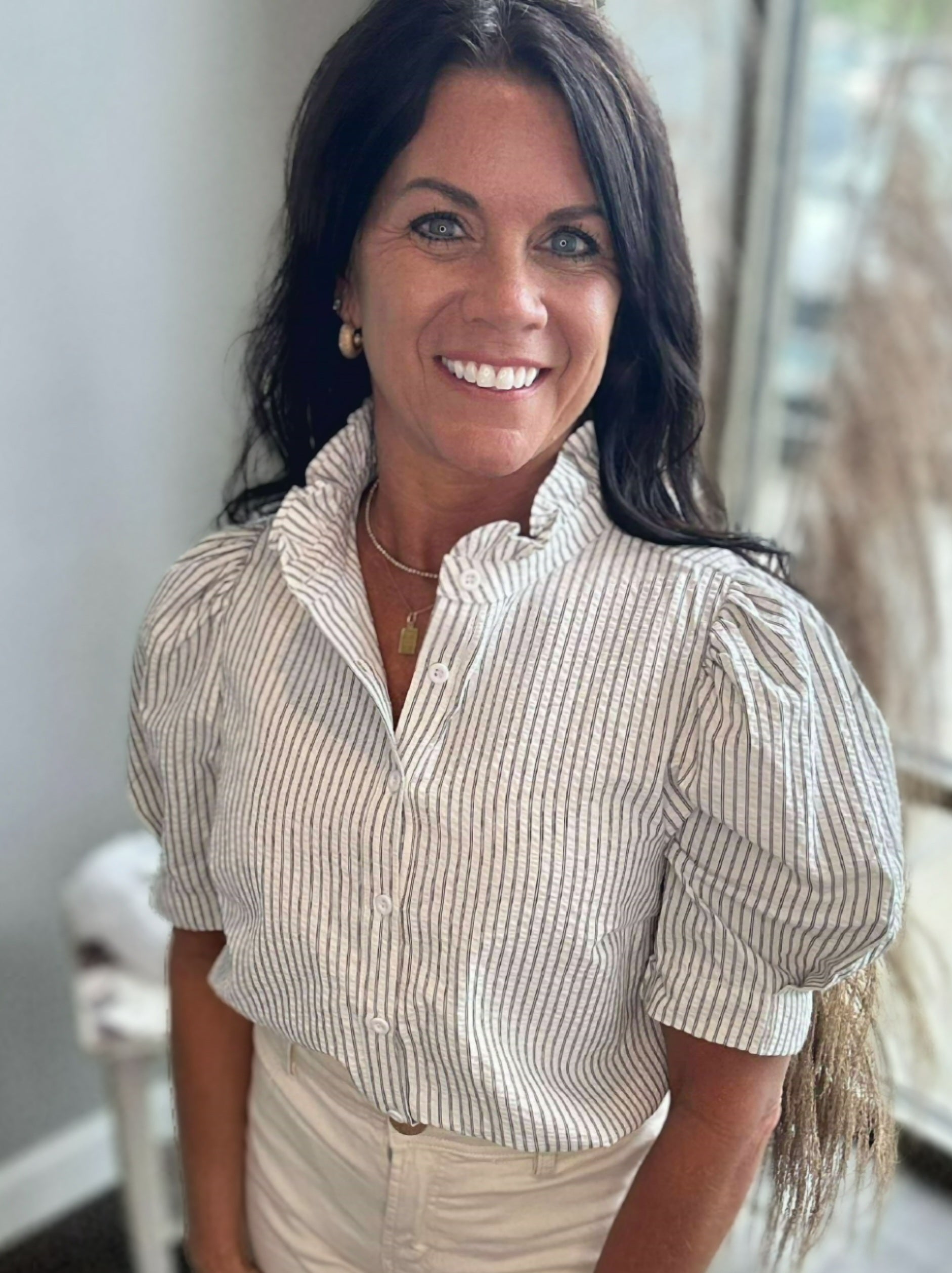 This playful button-down striped top brings a fresh twist to your wardrobe with its crisp lines and breezy short sleeves. Perfect for sunny days or layering, it adds a fun, casual vibe to any outfit while keeping you cool and comfortable.