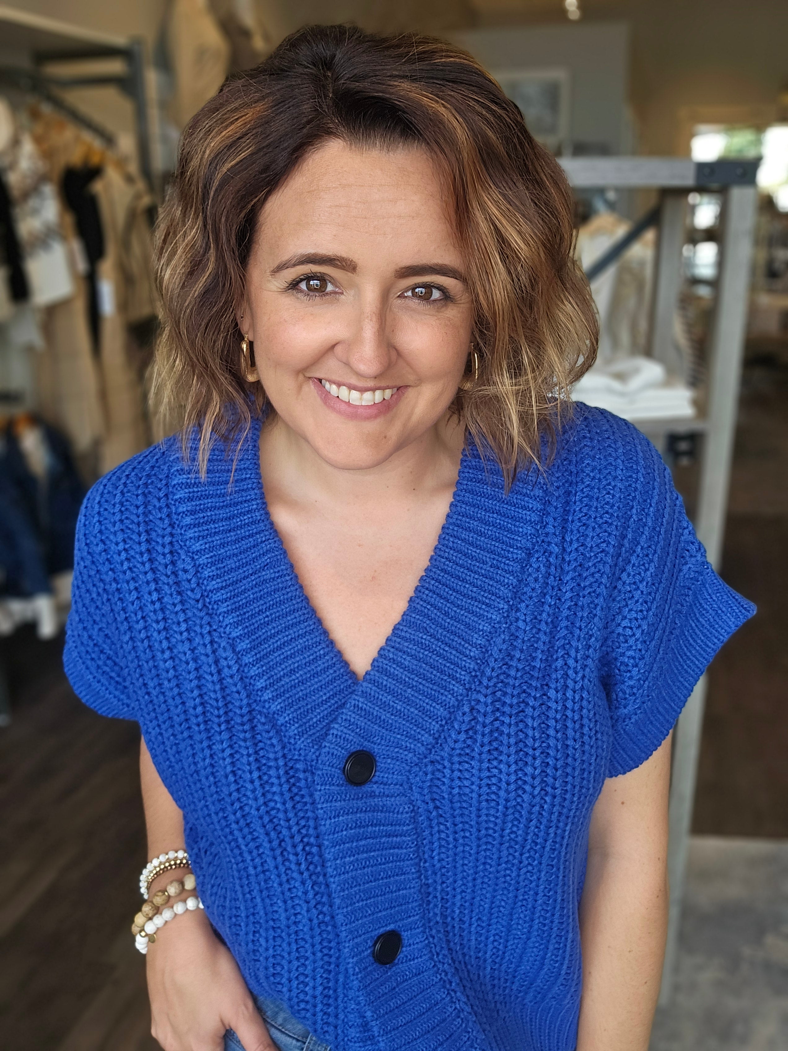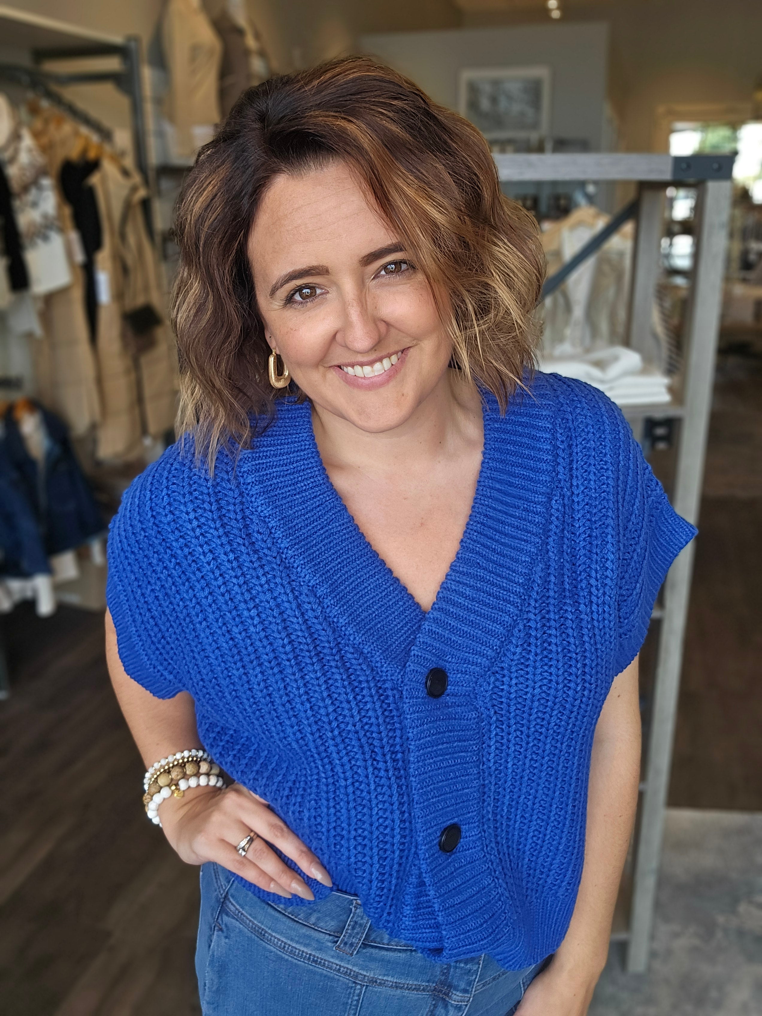 This playful Byotinka sweater vest in vibrant blue Quartz adds a cheerful pop to any outfit. Crafted with cozy knit fabric and featuring a charming button-front closure, it’s perfect for layering or wearing on its own for a lighthearted, stylish look. Easy to mix and match, it brings both comfort and fun to your wardrobe.